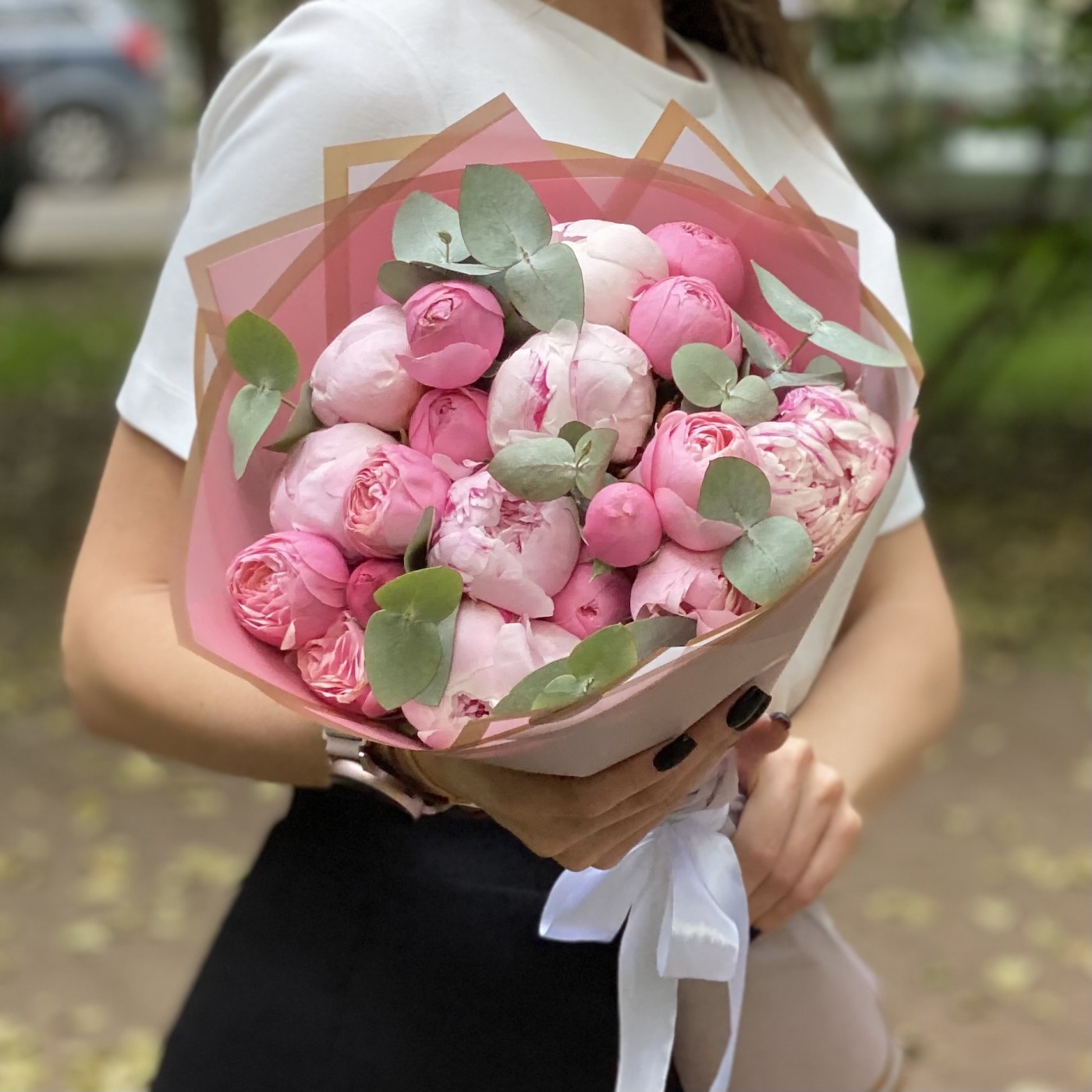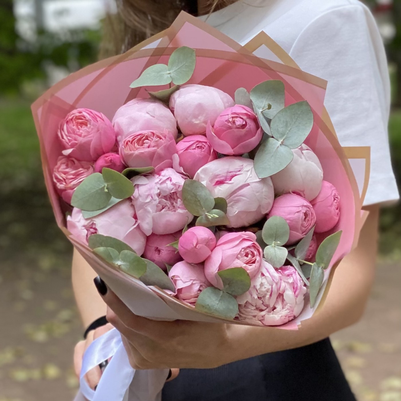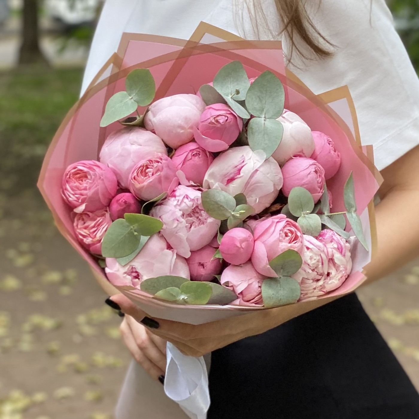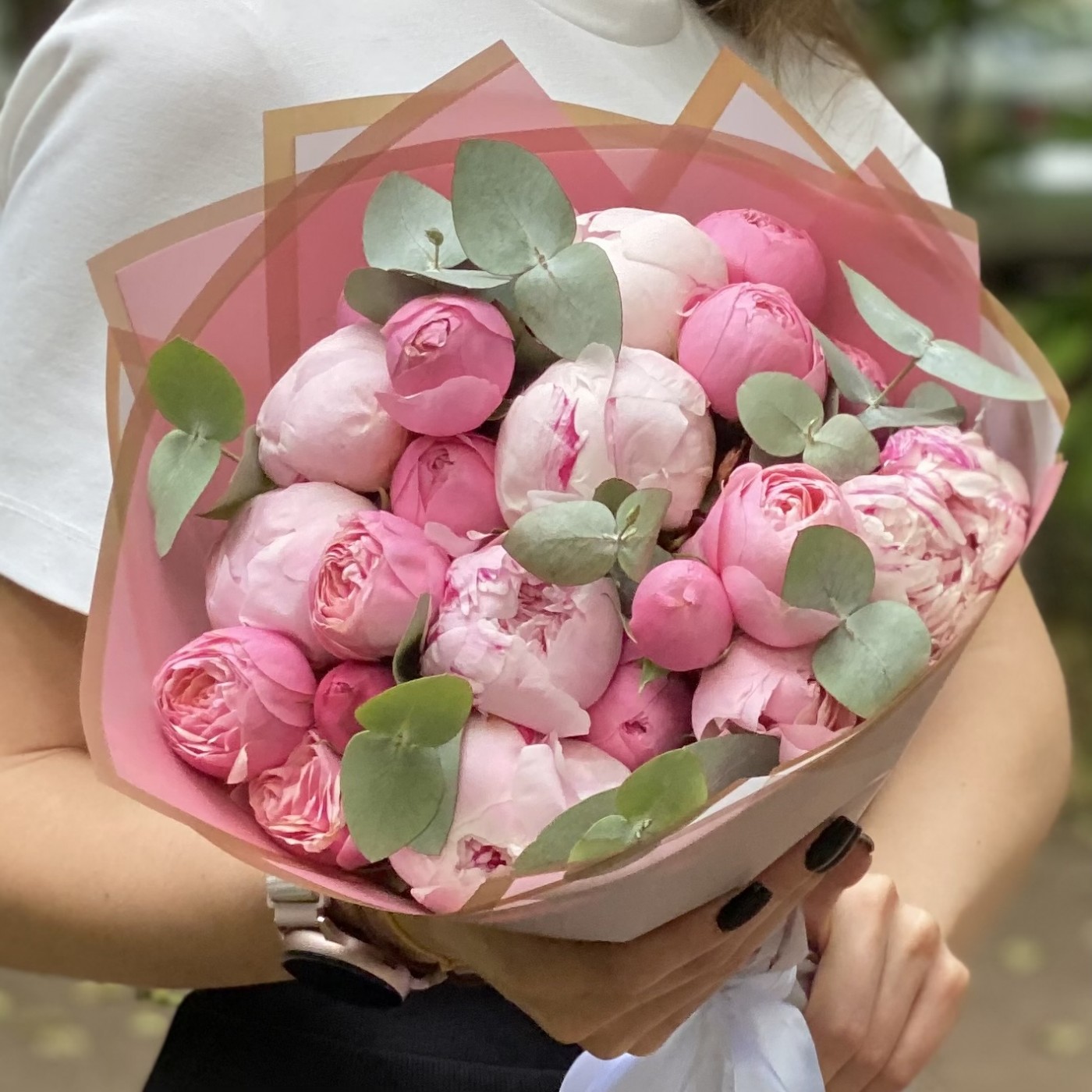 Сборный букет из ароматных пионов сорта Сара Бернар и пионовидной кустовой розы Сильва Пинк станет идеальным подарком для любимой женщины.