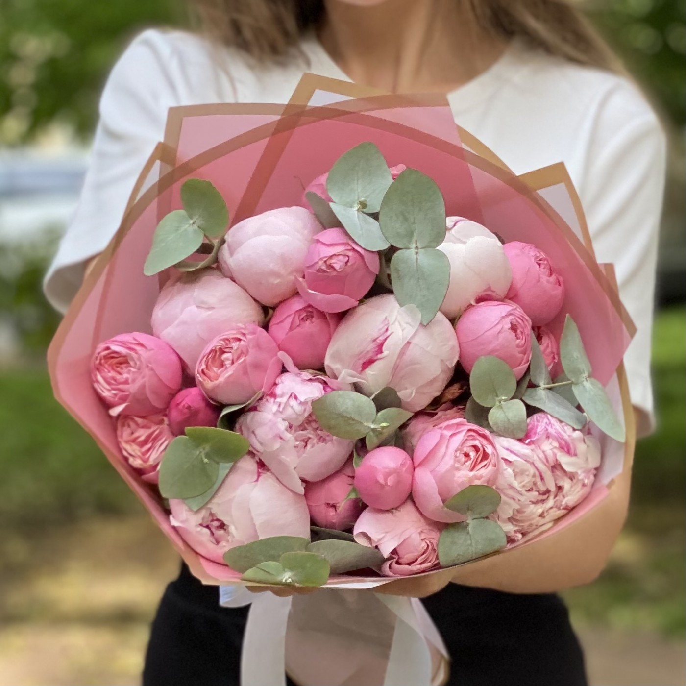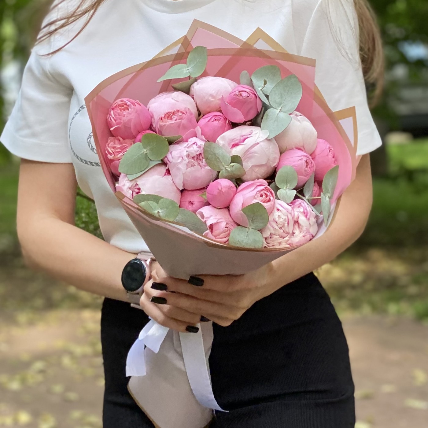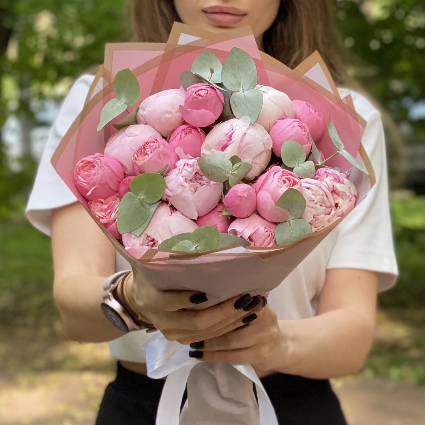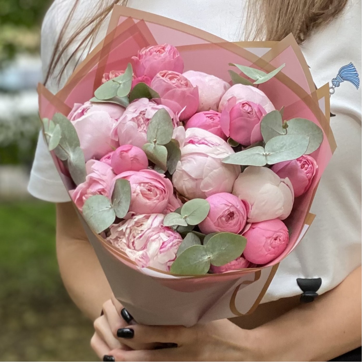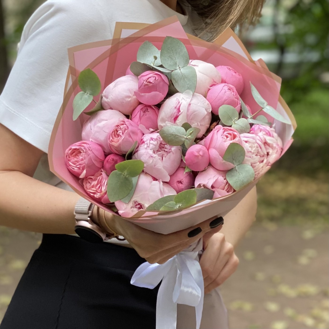 Сборный букет из ароматных пионов сорта Сара Бернар и пионовидной кустовой розы Сильва Пинк станет идеальным подарком для любимой женщины.