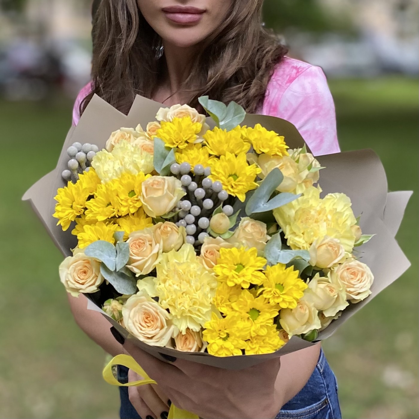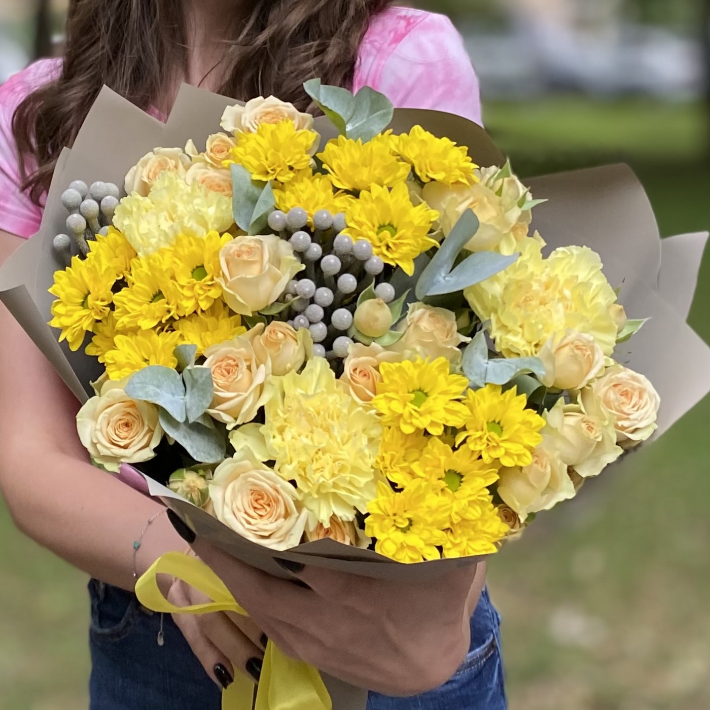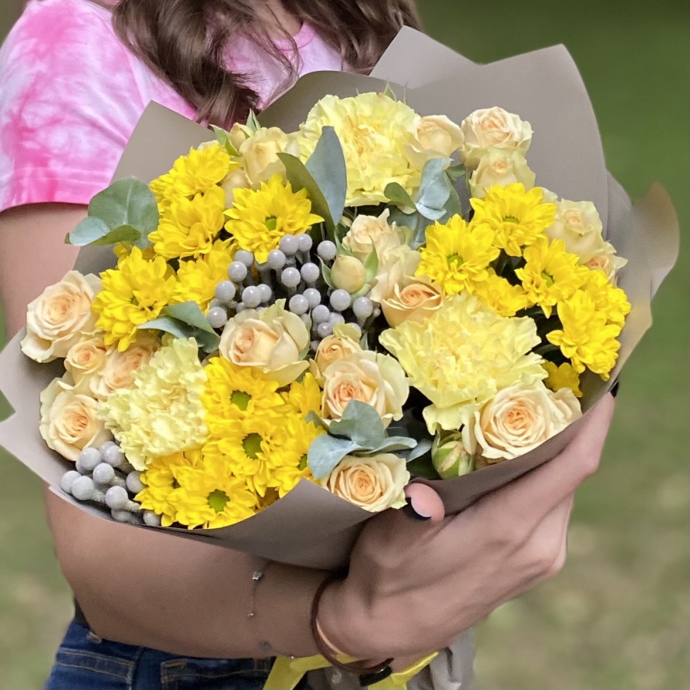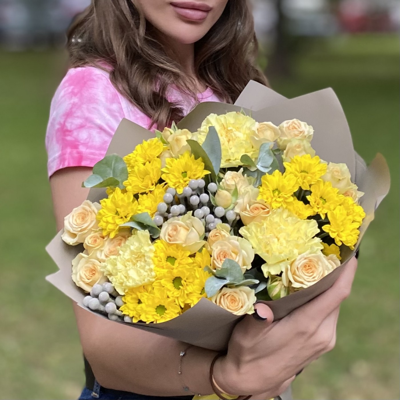 Одновременно яркий и нежный, интригующий и умиротворяющий букет из жёлтой кустовой хризантемы Сантини, жёлтой гвоздики, кремовой кустовой розы Аксана, веточки эвкалипта. Этот флористический ансамбль ненавязчиво переносит в чарующий мир сочных красок, весёлого летнего настроения и незабываемых эмоций. Каждый цветочек заряжает своей мощной энергией и вдохновляет на новые открытия. А ещё такой букет помогает проявить заботу и уважение. Это отличный подарок для родного человека. И не нужен повод, чтобы дарить позитив и счастье!