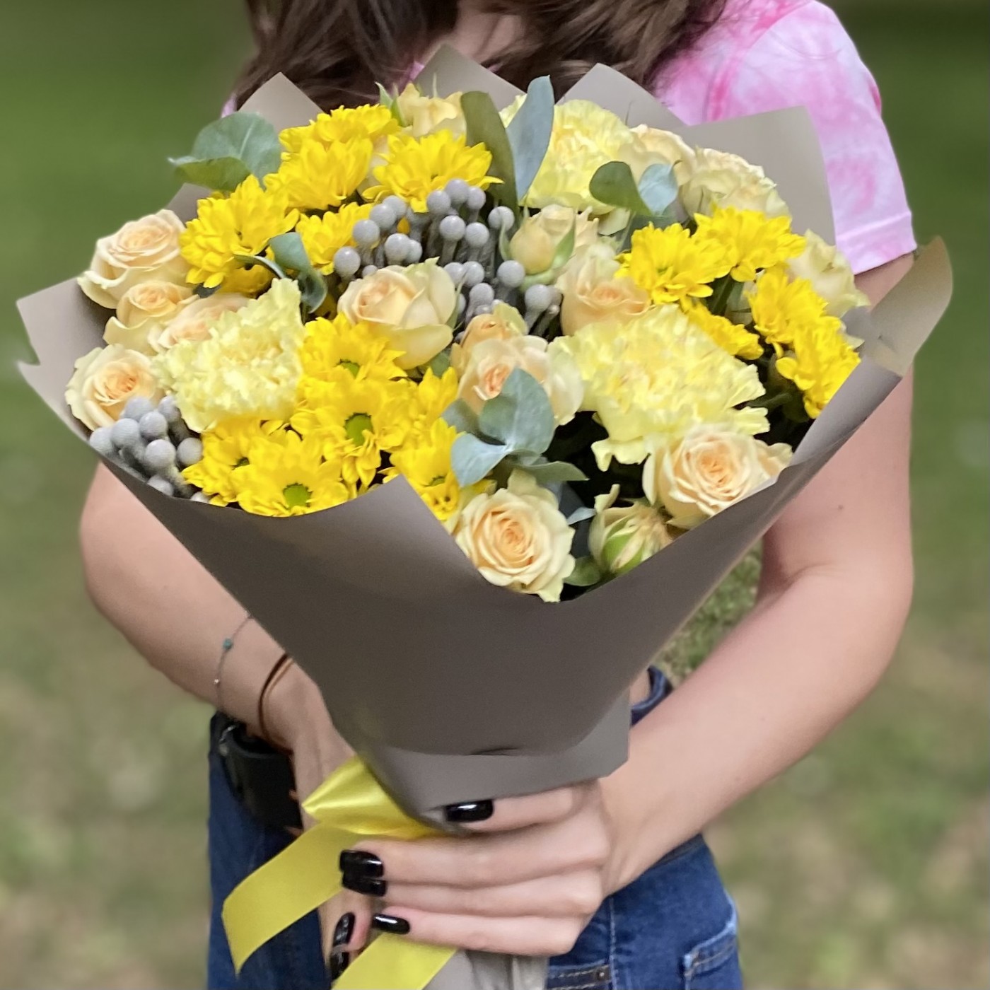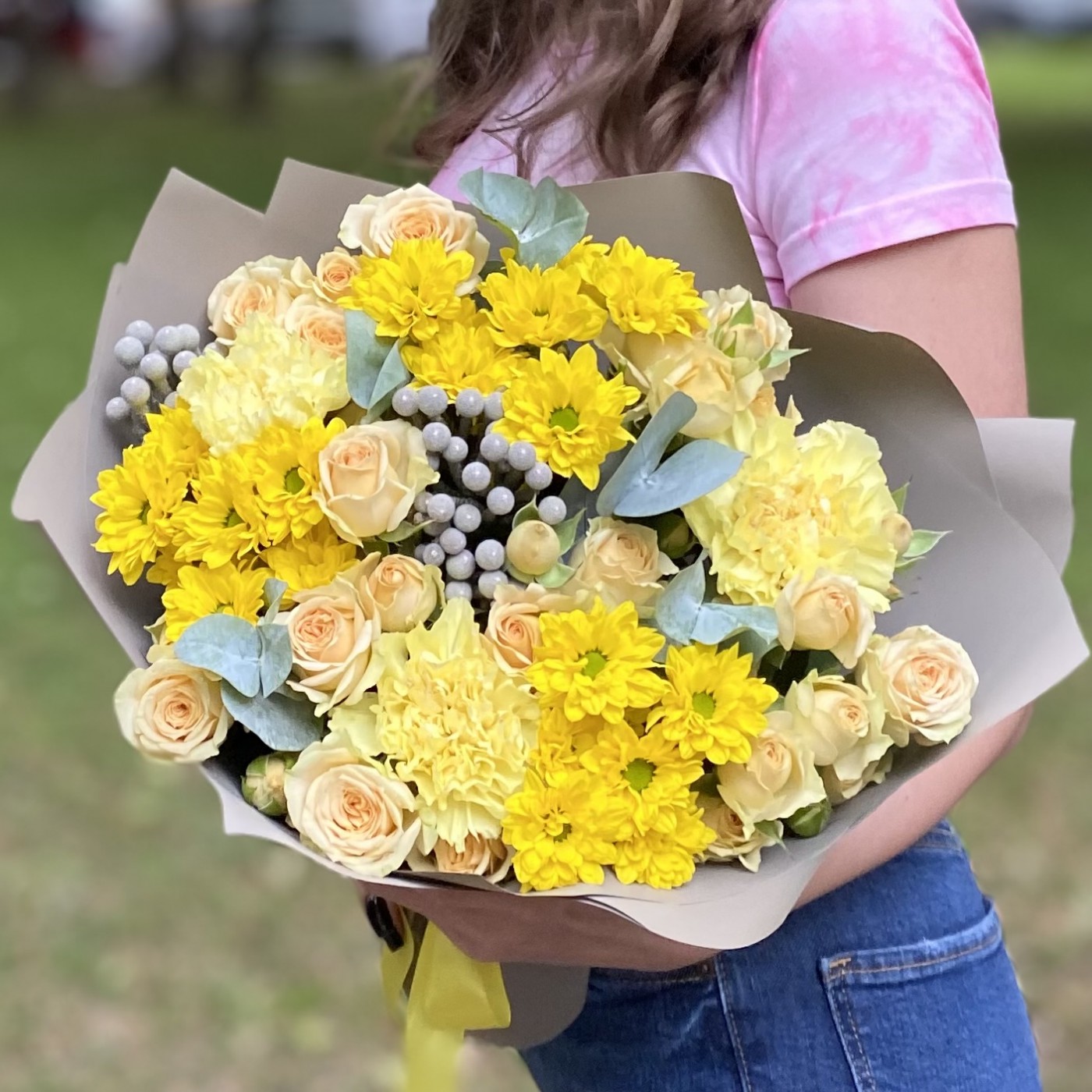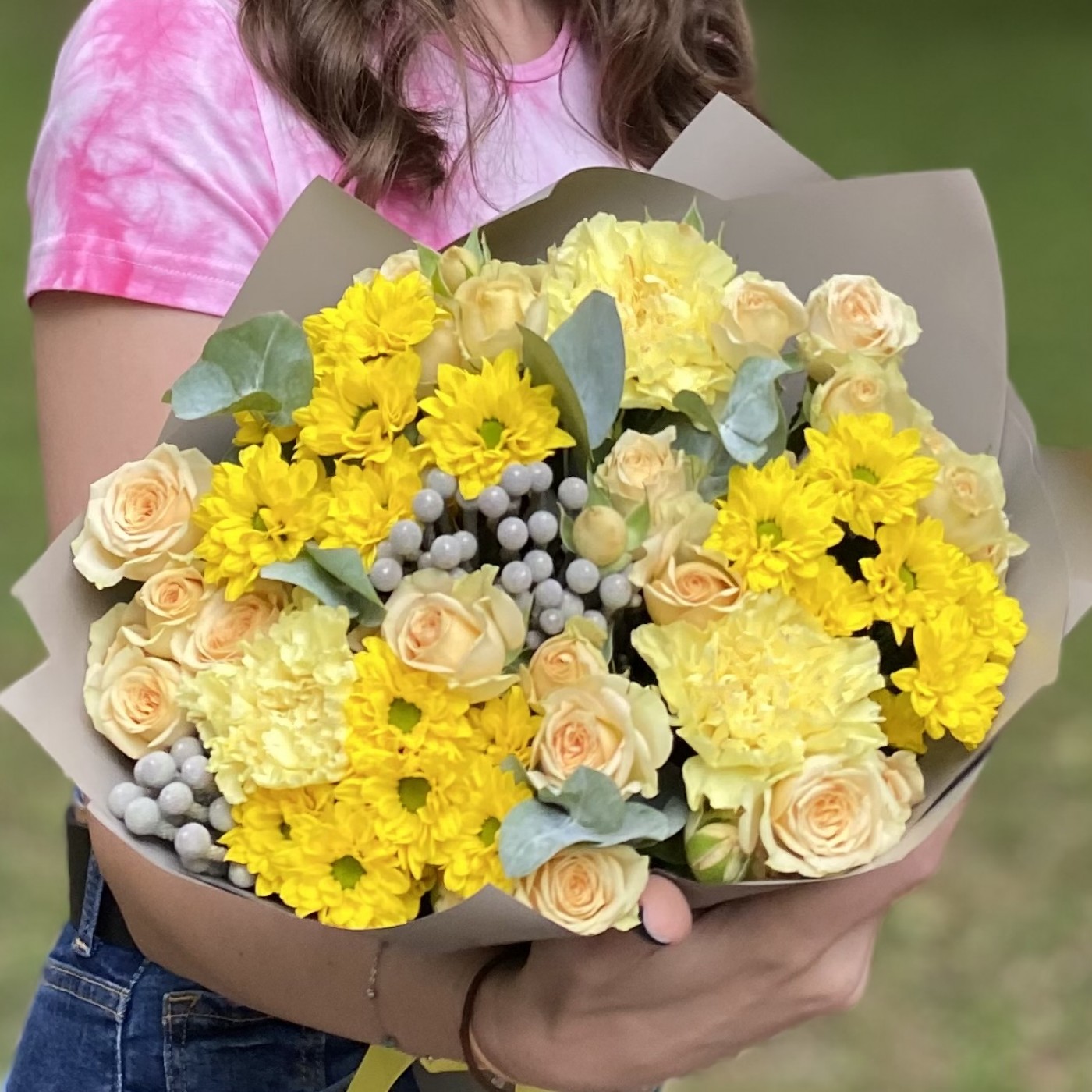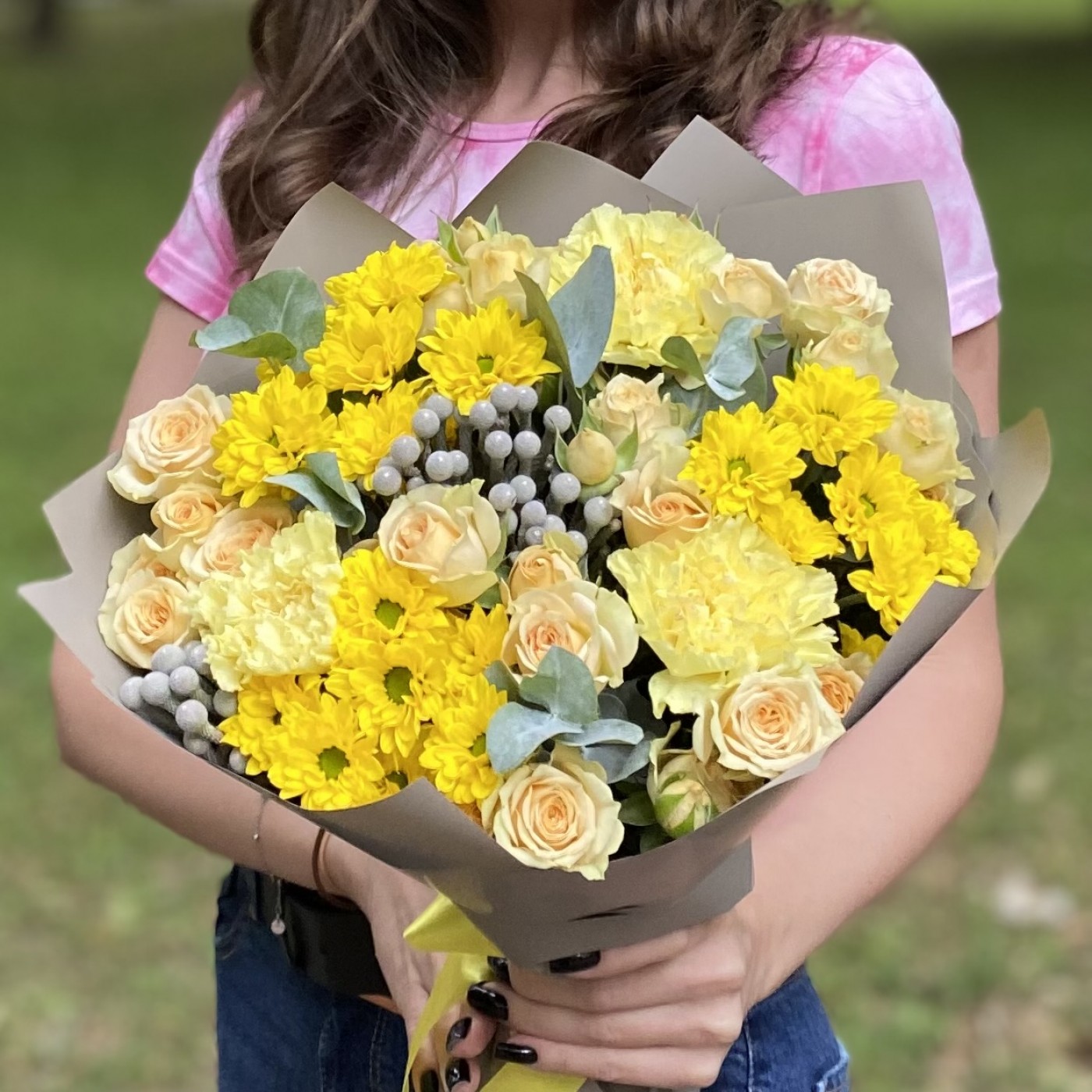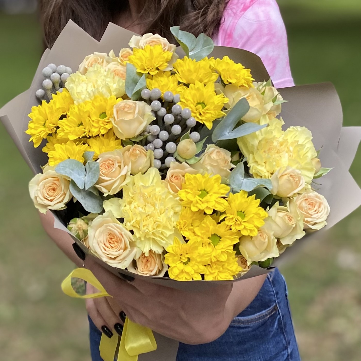 Одновременно яркий и нежный, интригующий и умиротворяющий букет из жёлтой кустовой хризантемы Сантини, жёлтой гвоздики, кремовой кустовой розы Аксана, веточки эвкалипта. Этот флористический ансамбль ненавязчиво переносит в чарующий мир сочных красок, весёлого летнего настроения и незабываемых эмоций. Каждый цветочек заряжает своей мощной энергией и вдохновляет на новые открытия. А ещё такой букет помогает проявить заботу и уважение. Это отличный подарок для родного человека. И не нужен повод, чтобы дарить позитив и счастье!