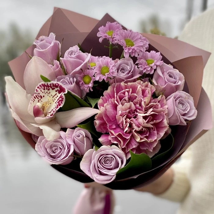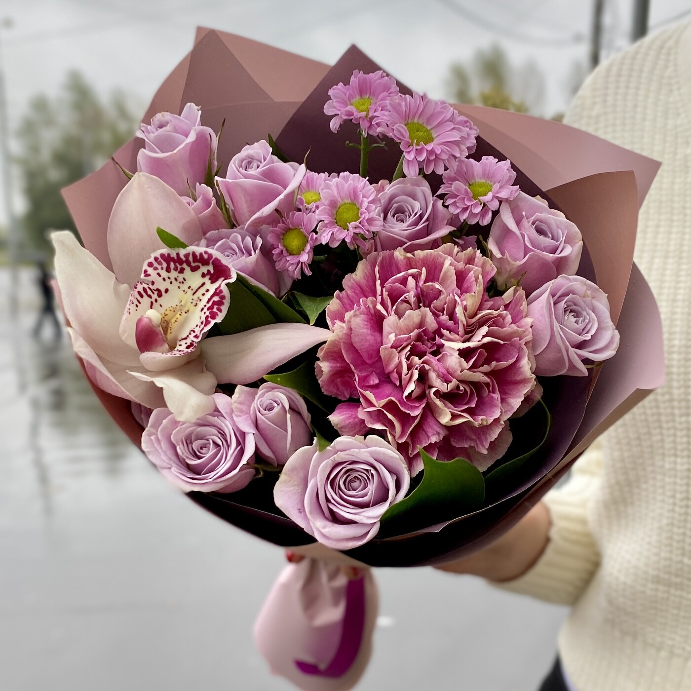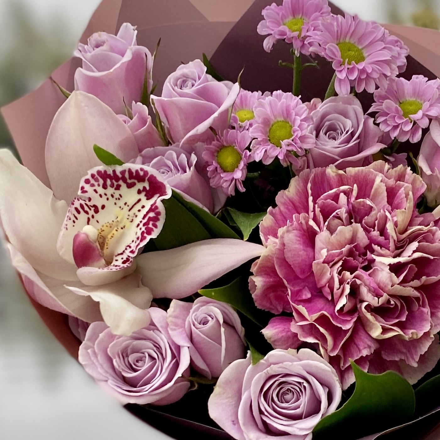 Небольшой детский букет в сиреневых тонах. Такой букет подойдет девочке на день рождения, в подарок учителю или любимой маме.