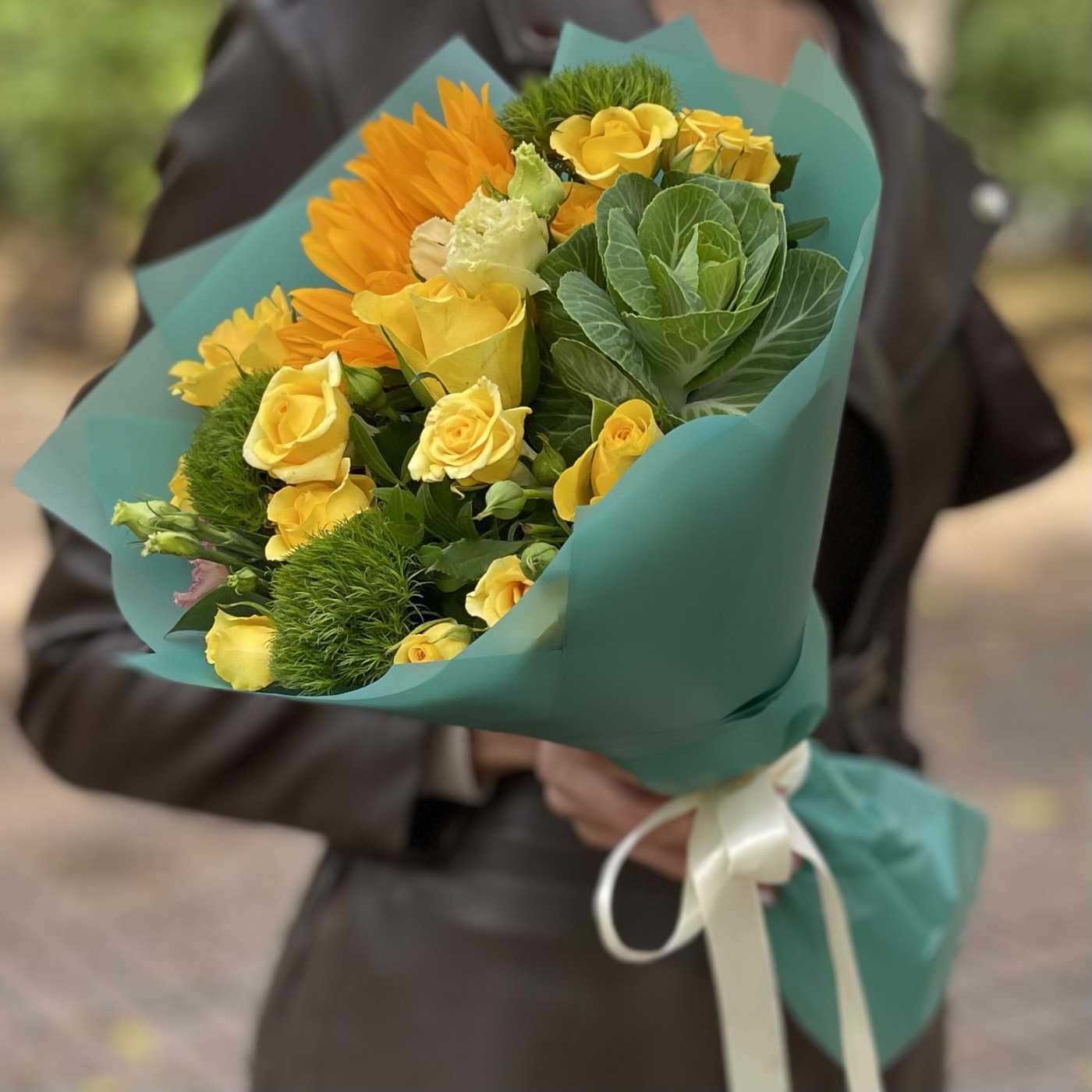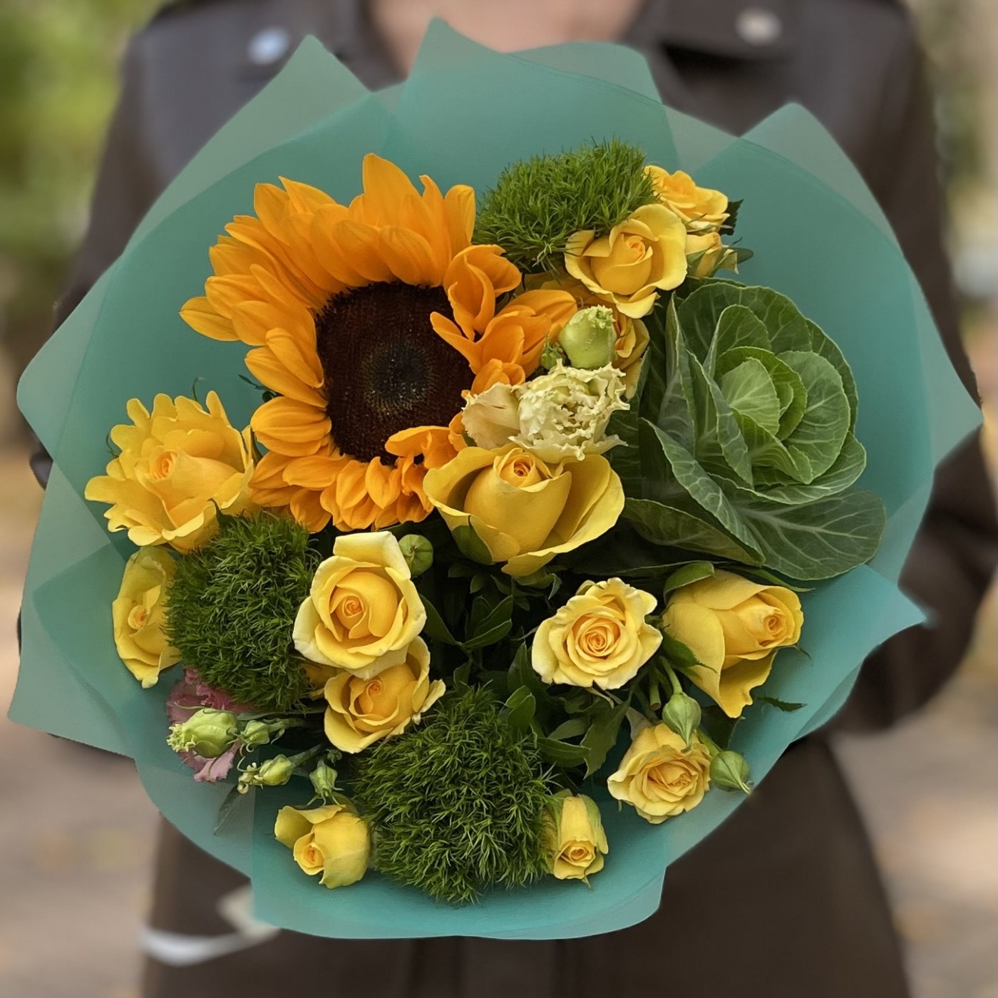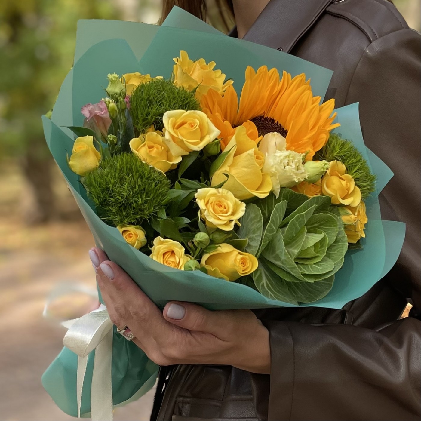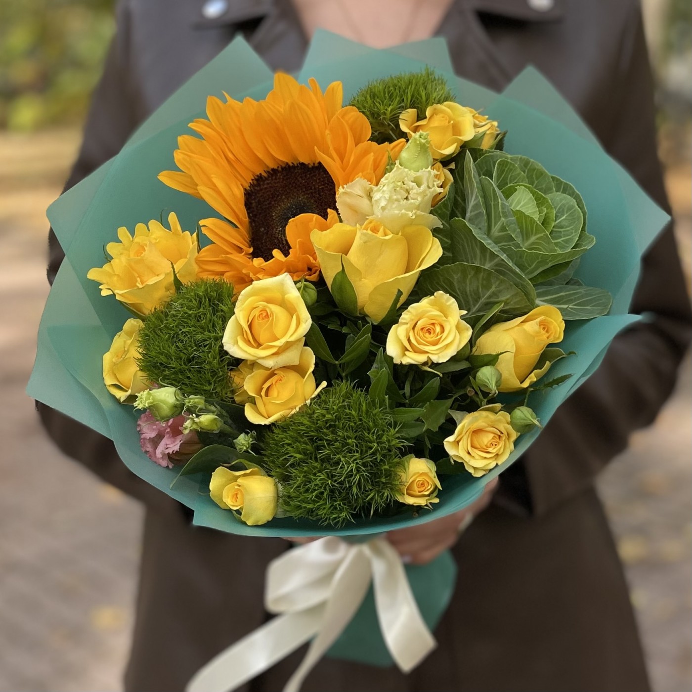 Яркий букет с подсолнухом и желтыми кустовыми розочками.
