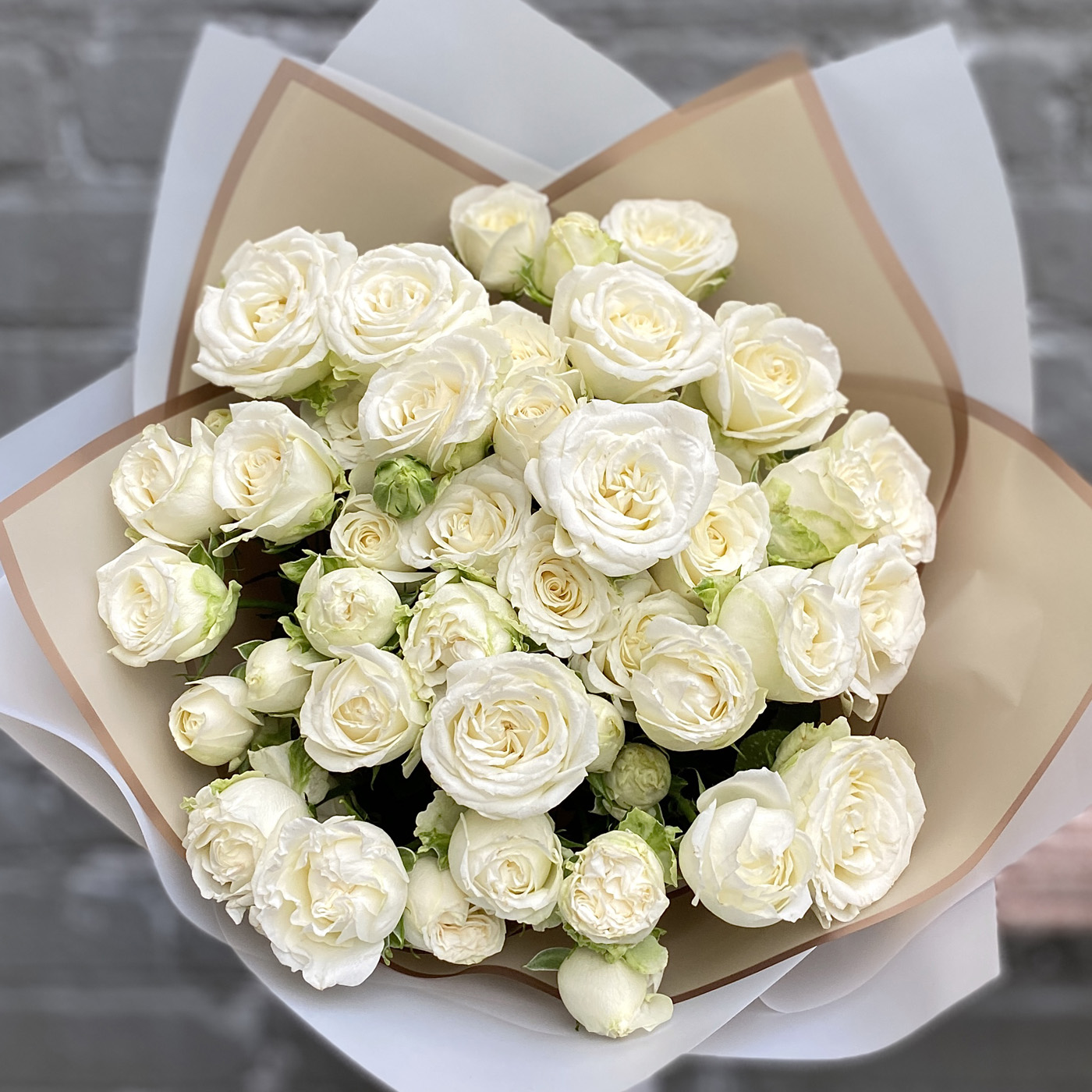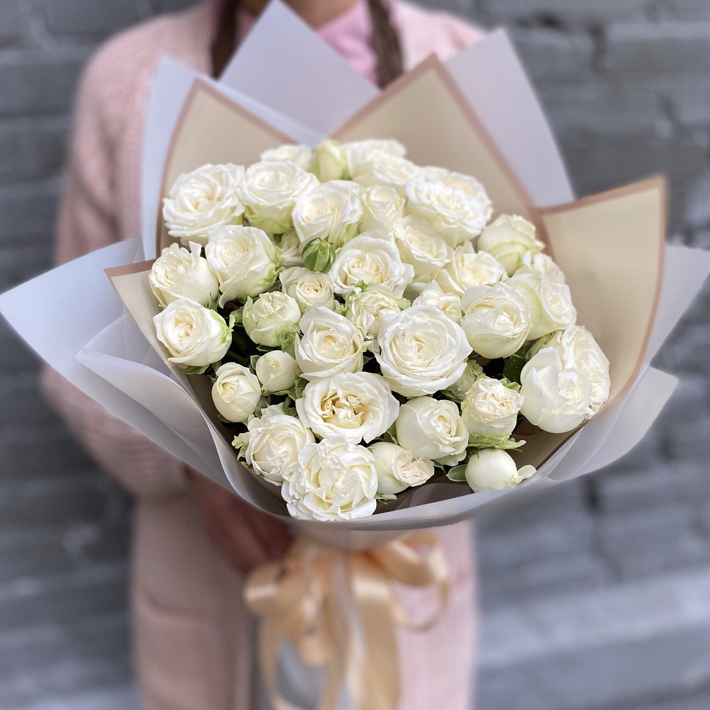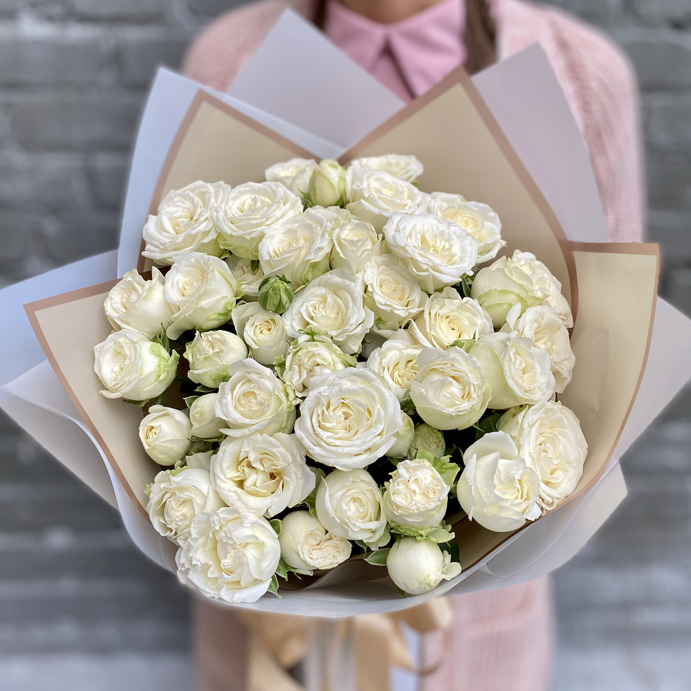 На фото представлены букеты из кустовых пионовидных роз Miss Bombastic - 11 и 25 веток в упаковке.