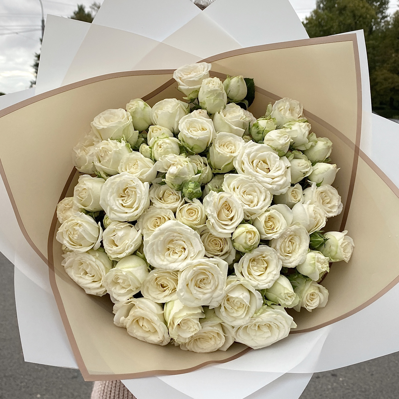 Елена о заказе: 51 белая роза в корзинеСпасибо за своевременную доставку, хорошие гвоздики как с грядки. 100. Курьеру отдельное спасибо