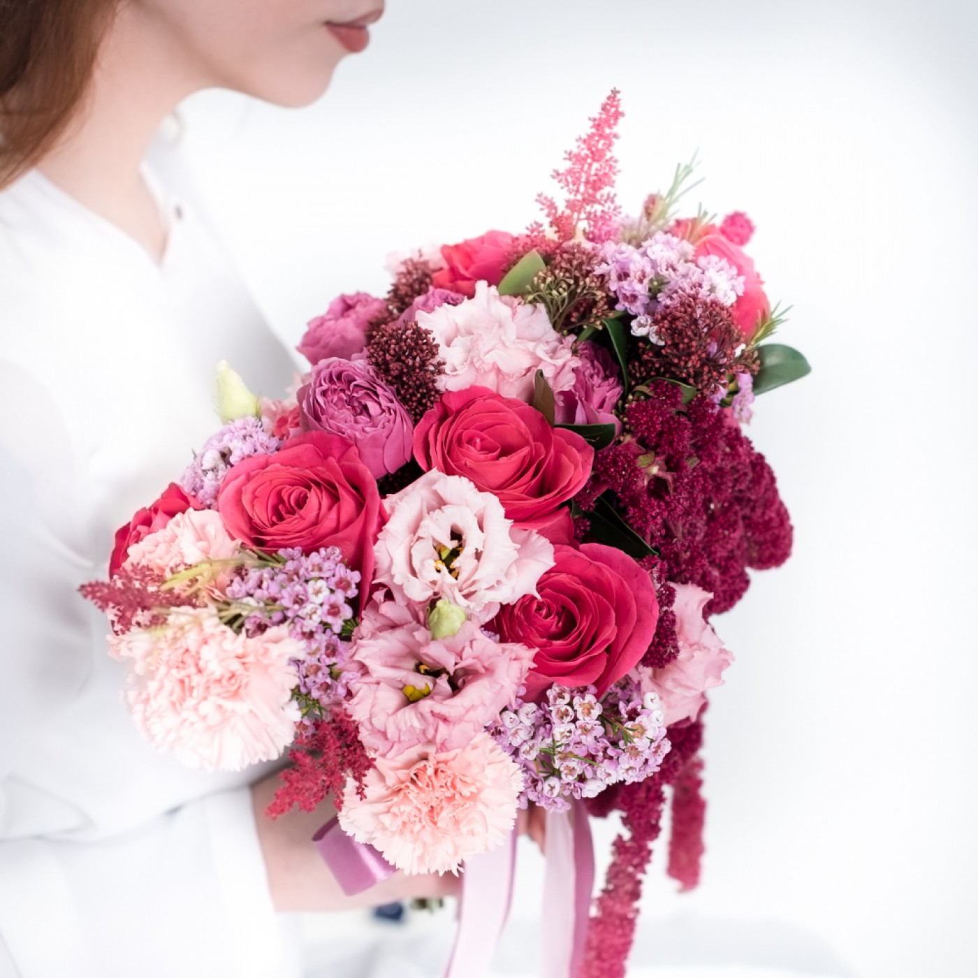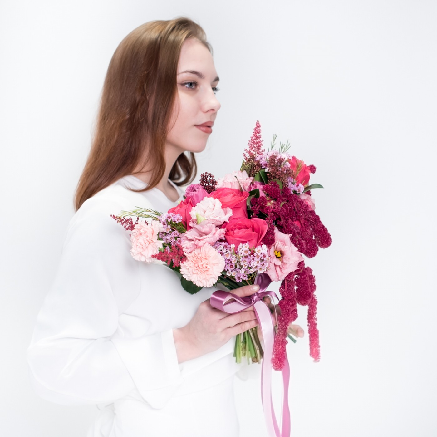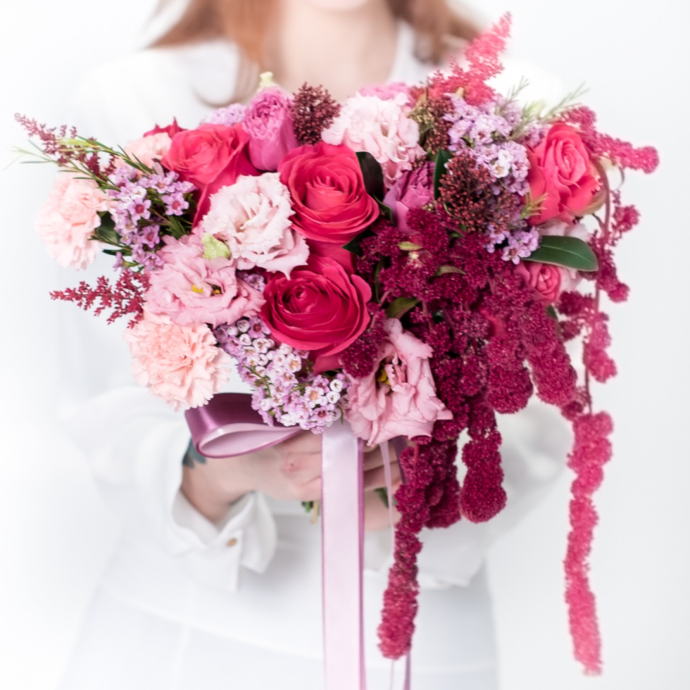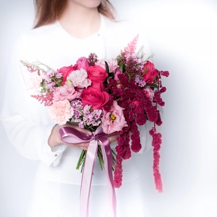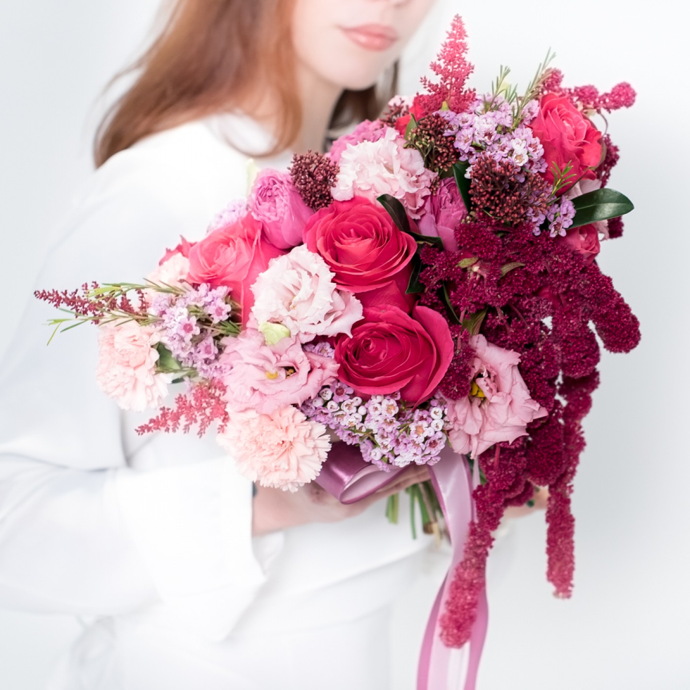 Раскидистый букет невесты с очень красивом переходом цвета от нежно-розового к бордовому.