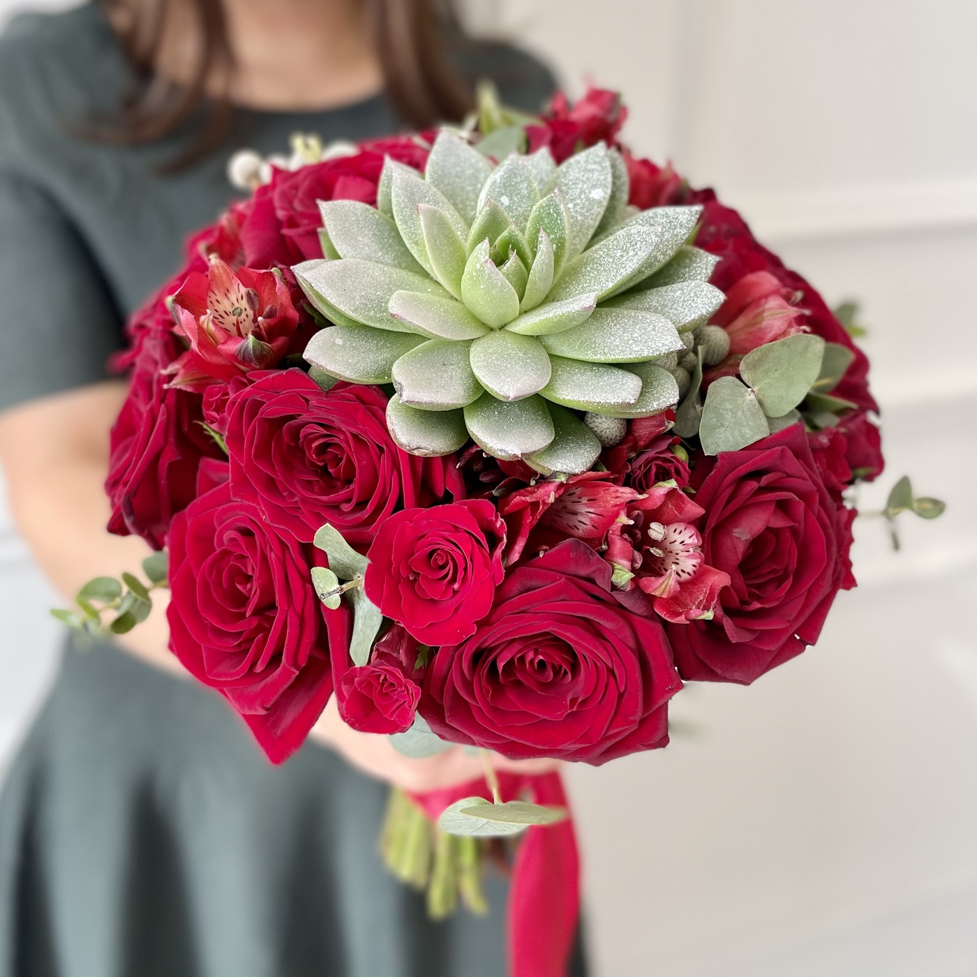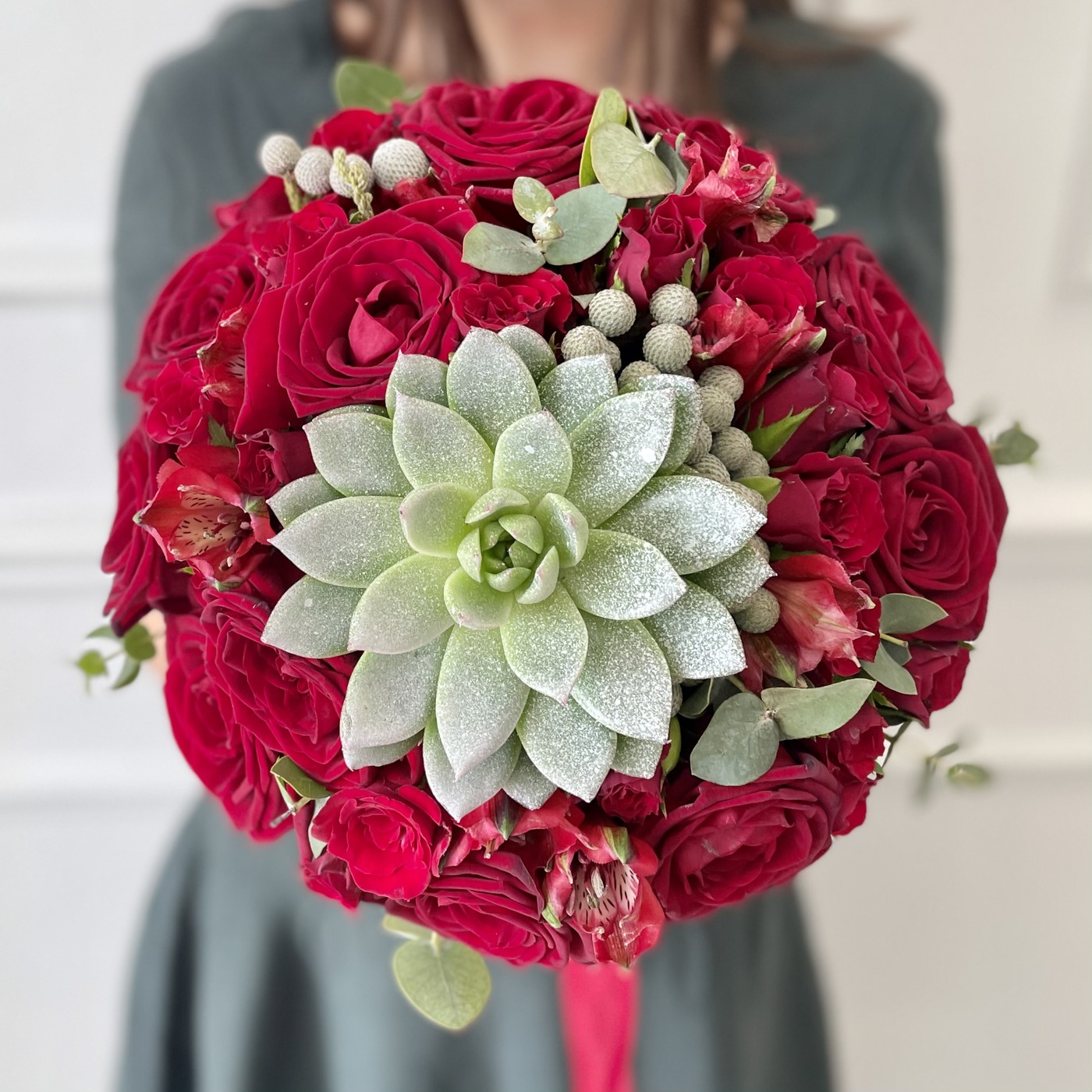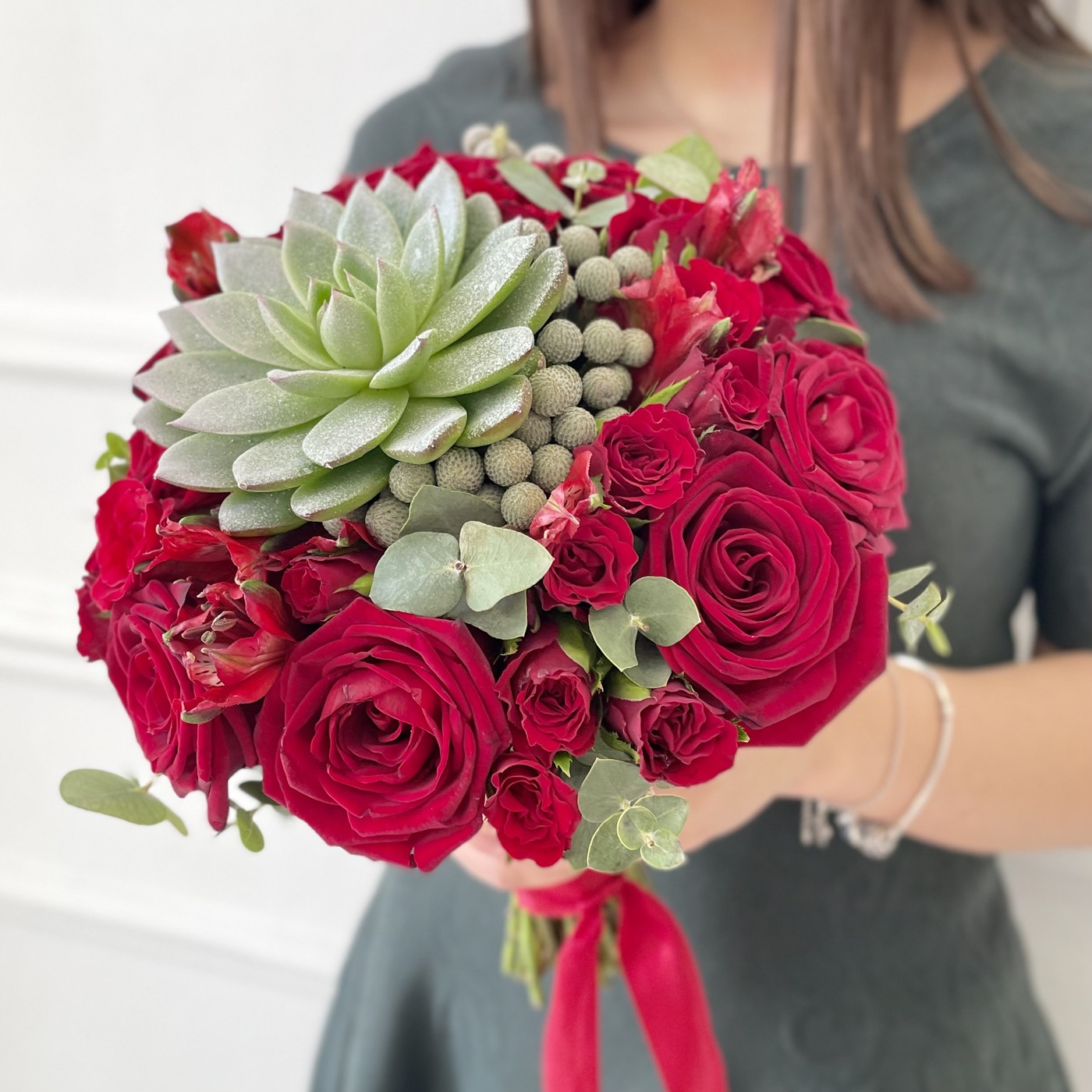 Яркий букет невесты для самой сладкой парочки. Такой букет запомнится всем вашим гостям и будет потрясающе смотреться на фото, особенно, если у вас светлое платье. Красный цвет символизирует любовь и страсть. Дополнительно можно заказать бутоньерку жениху в той же цветовой гамме букета.