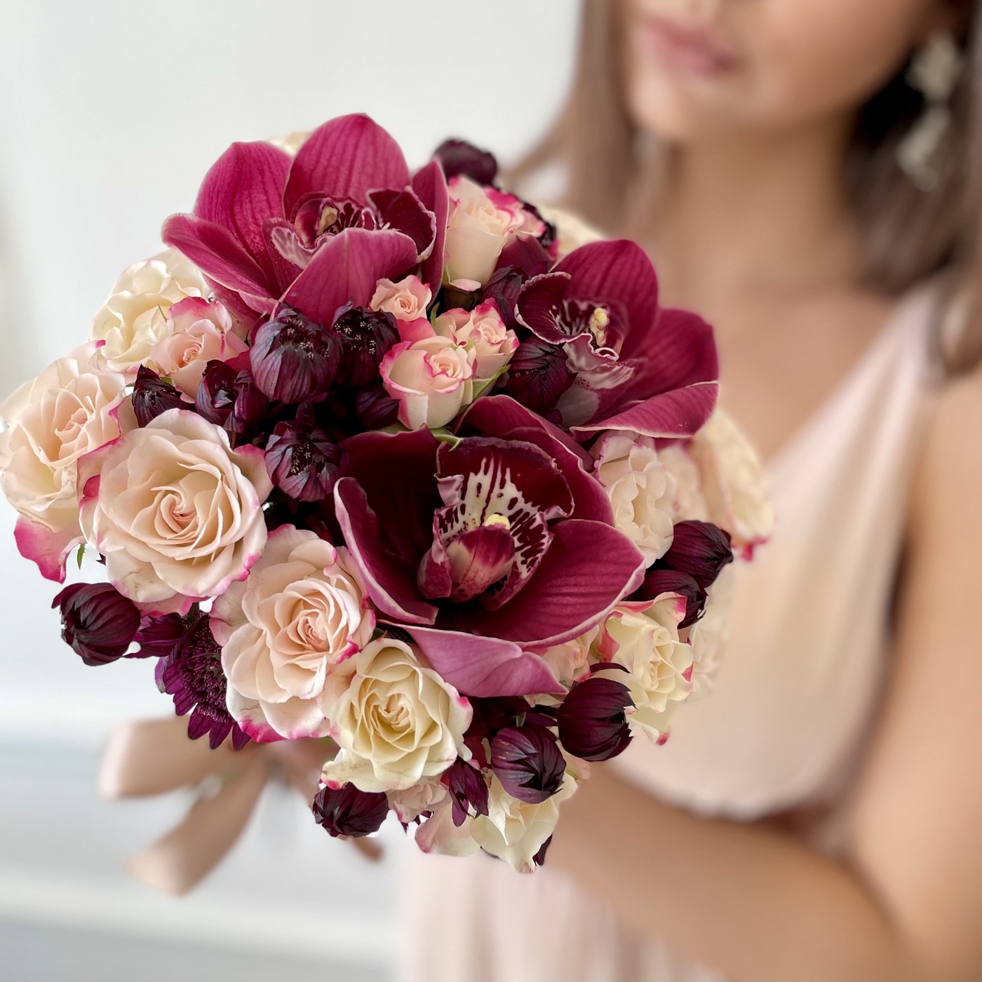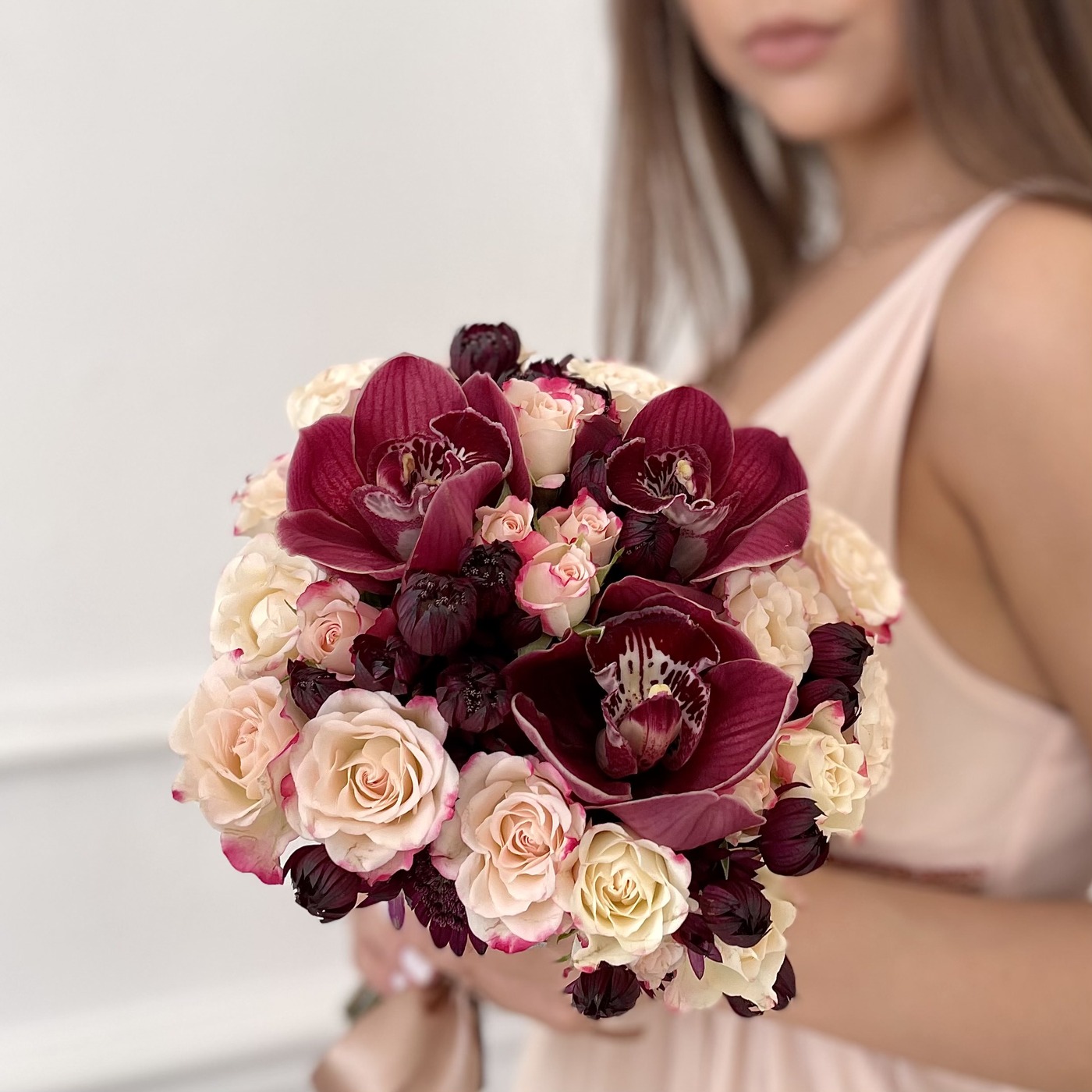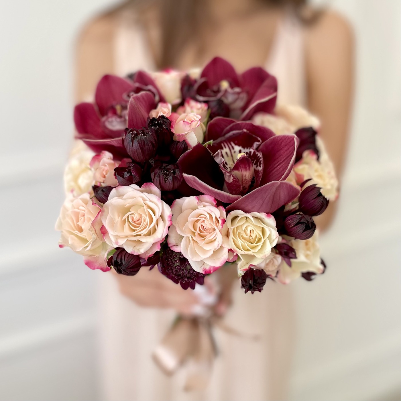 Необычный и экстравагантный букет невесты. Его цветовая гамма сводит с ума и придает вашим свадебным фото особенную изюминку. Такой букет обратит на себя множество взглядов и бурю положительных эмоций. Прелагается бутоньерка в стиль букета, ее вы можете добавить отдельно.