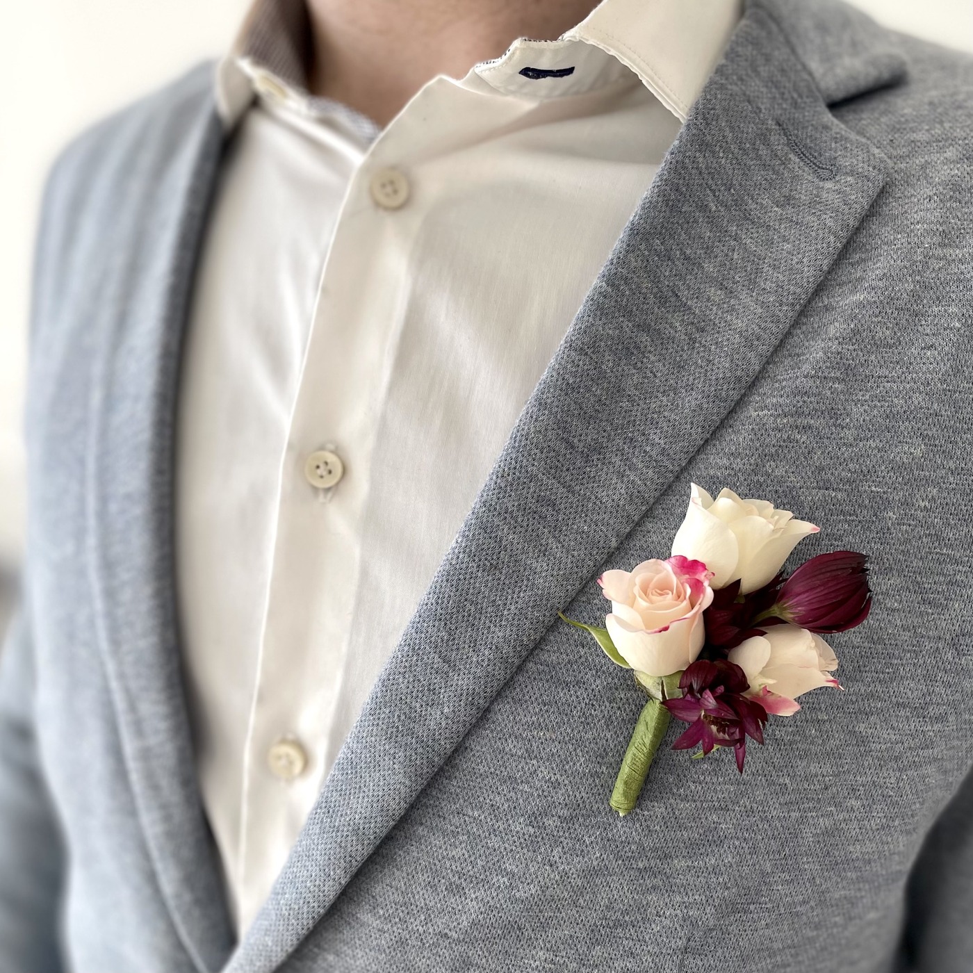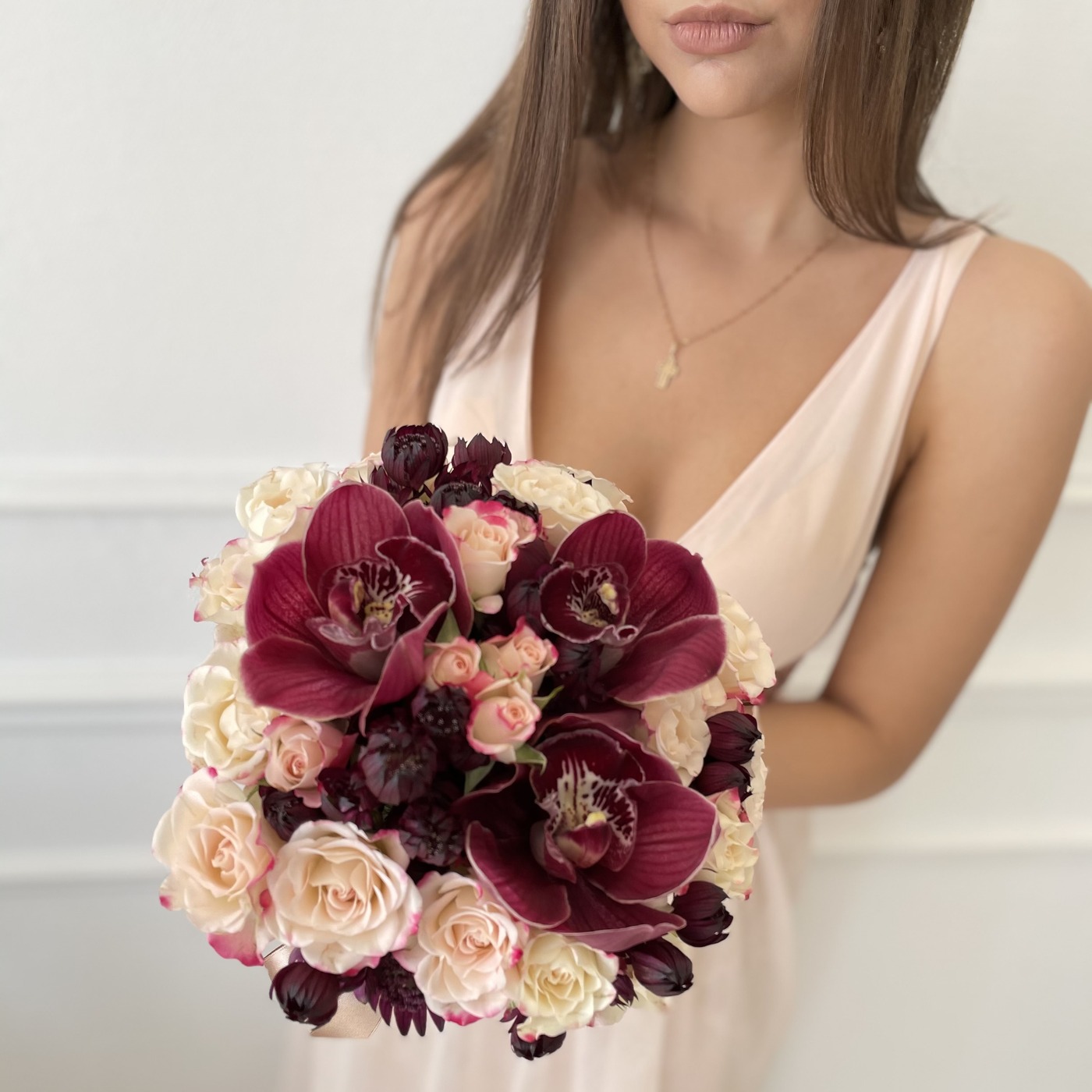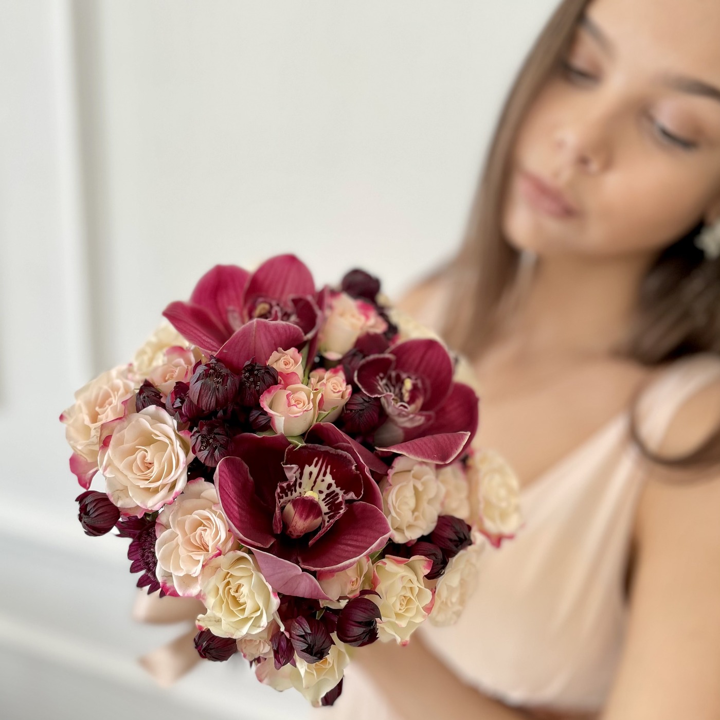 Необычный и экстравагантный букет невесты. Его цветовая гамма сводит с ума и придает вашим свадебным фото особенную изюминку. Такой букет обратит на себя множество взглядов и бурю положительных эмоций. Прелагается бутоньерка в стиль букета, ее вы можете добавить отдельно.