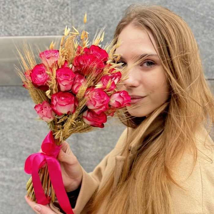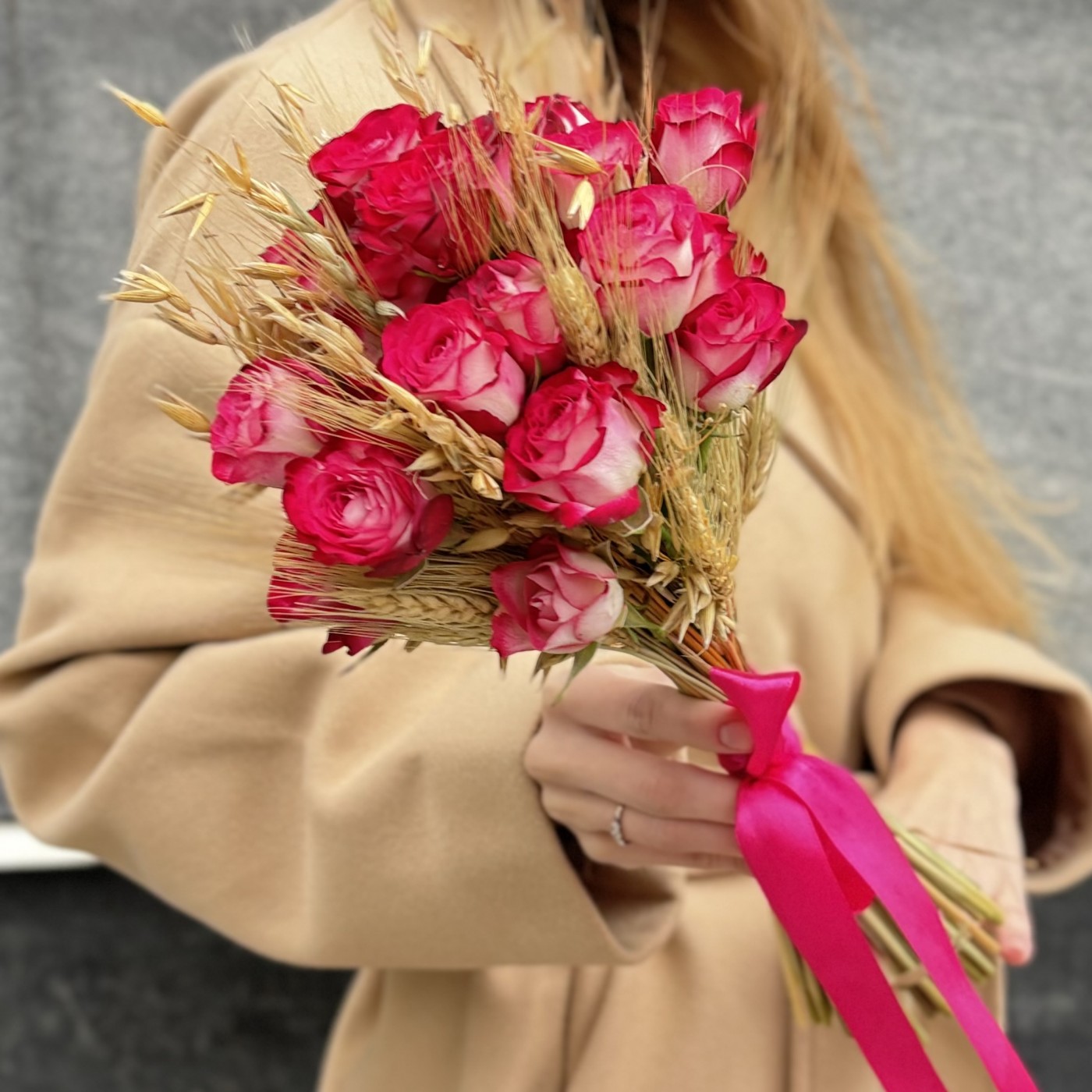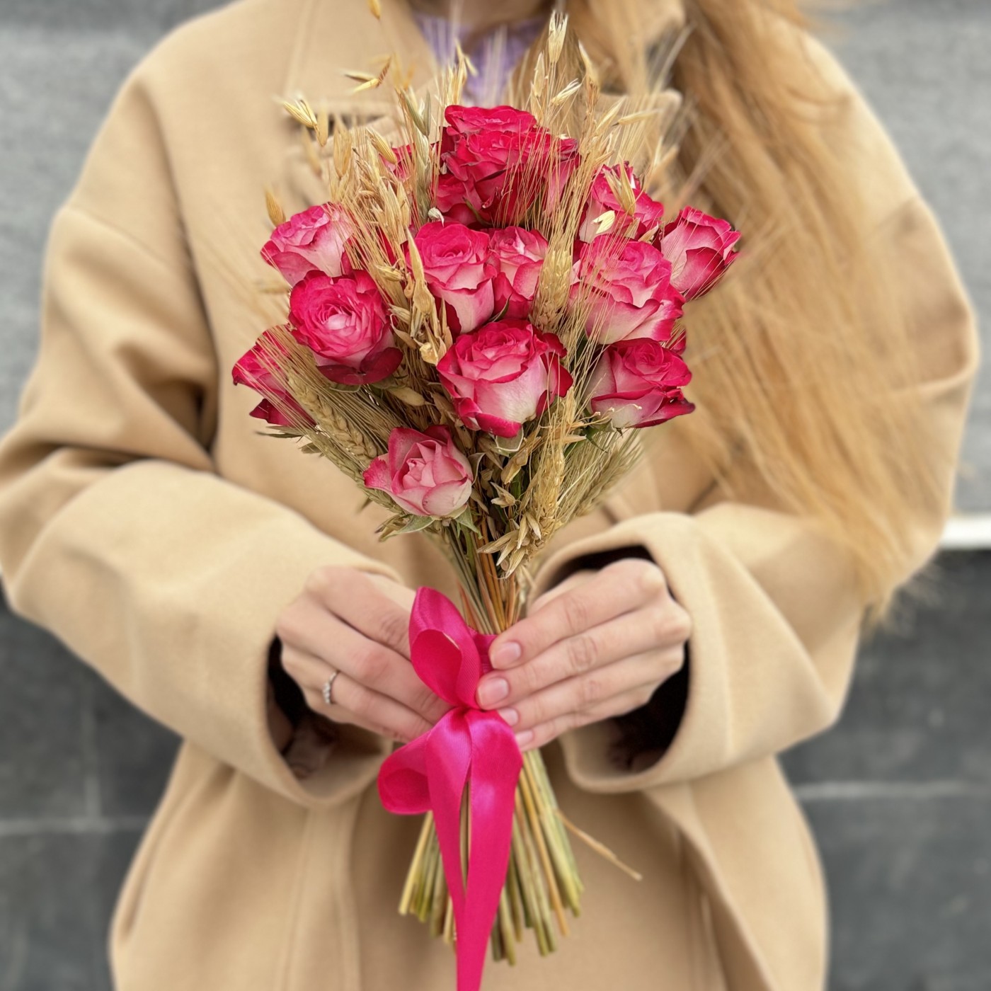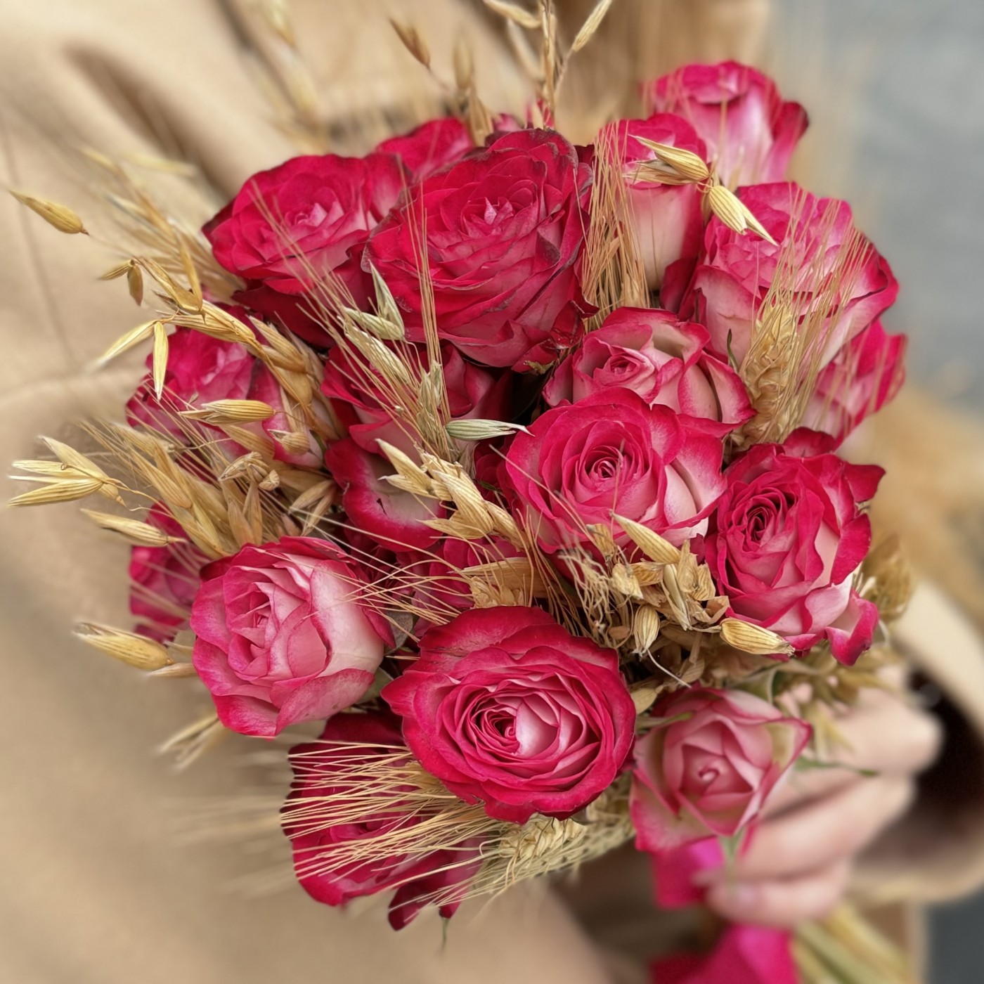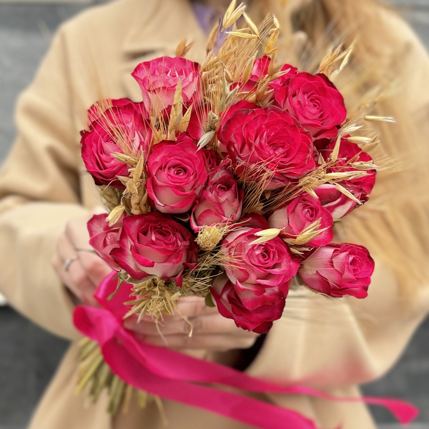 Этот прекрасный букет - свежие розы, яркого оттенка подойдут к любому образу и стилю. Этот букет будет радовать Вас на всём протяжении Вашего праздника.