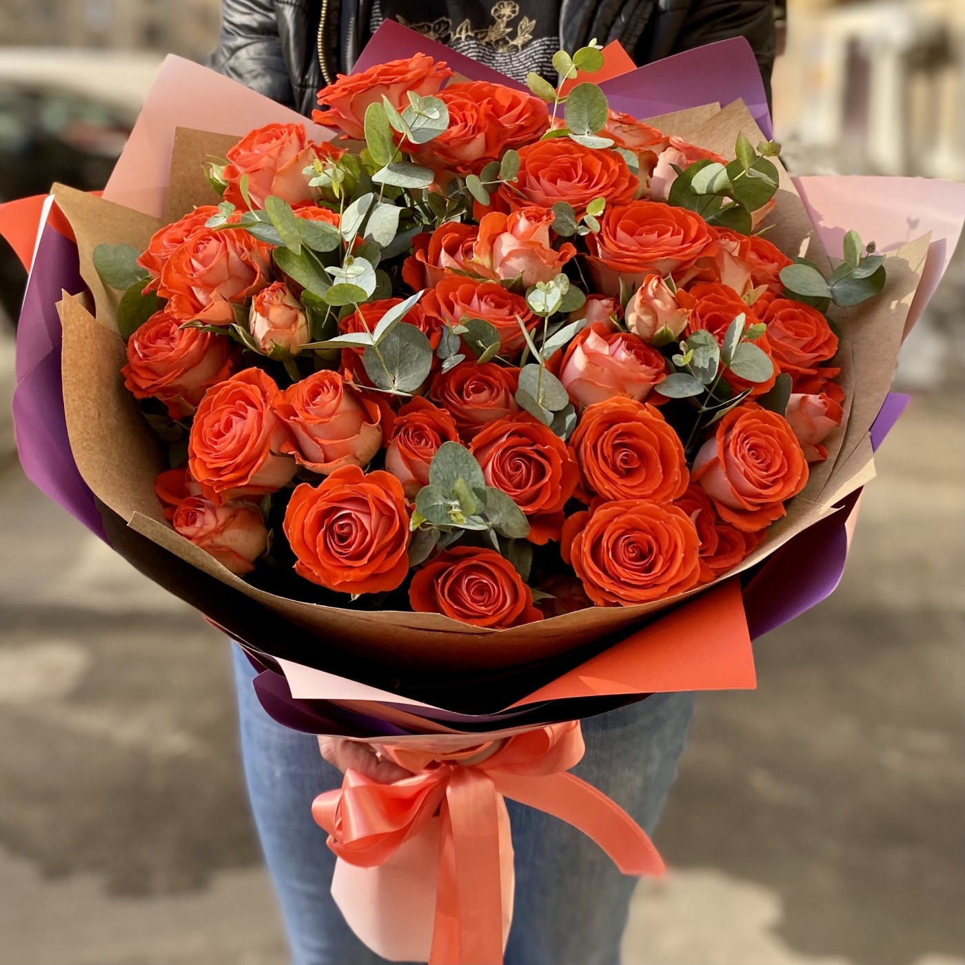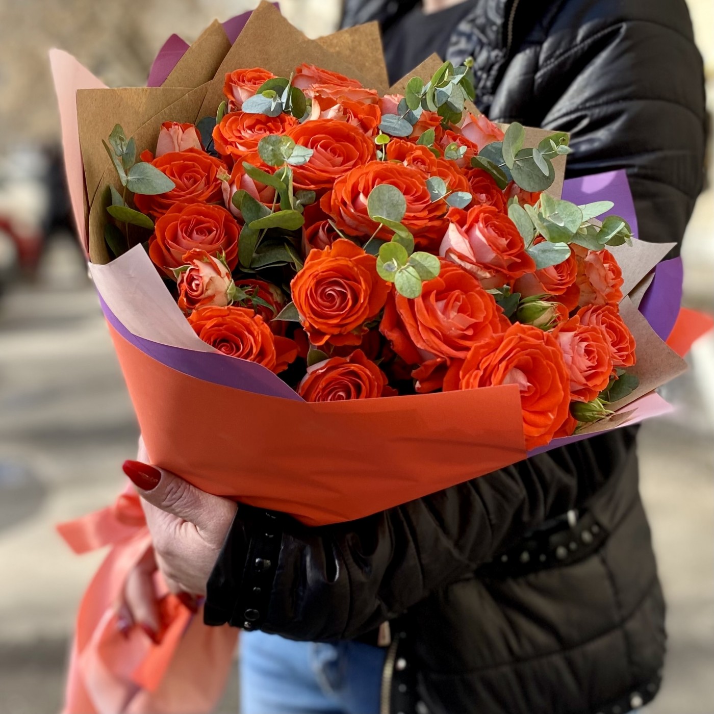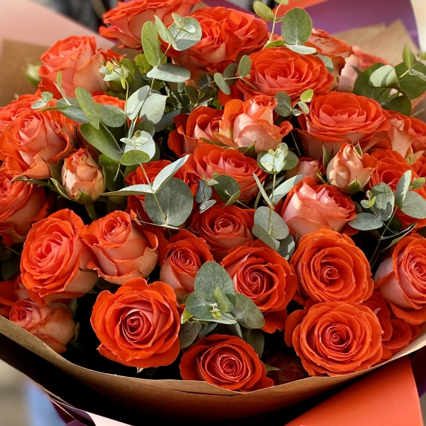 Букет из ярких пионовидных роз яркого оранжевого цвета с ароматным эвкалиптом. Букет упакован в стильную корейскую пленку.