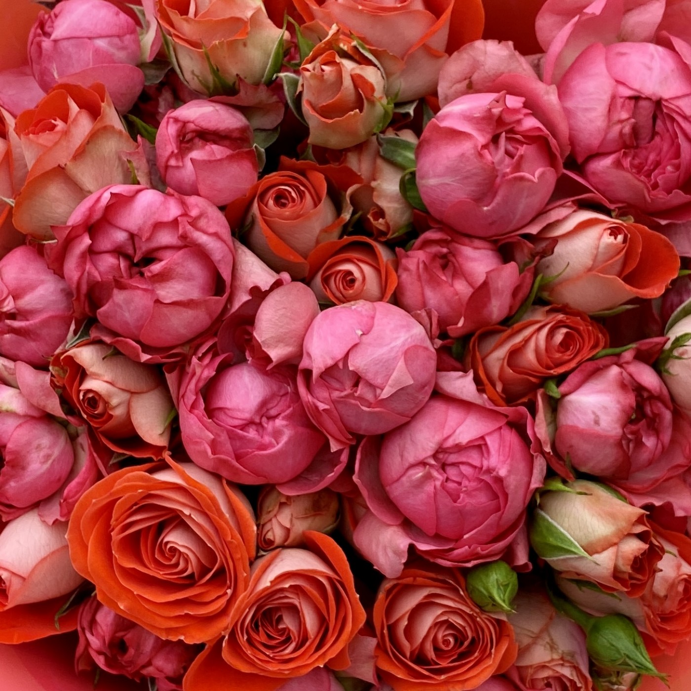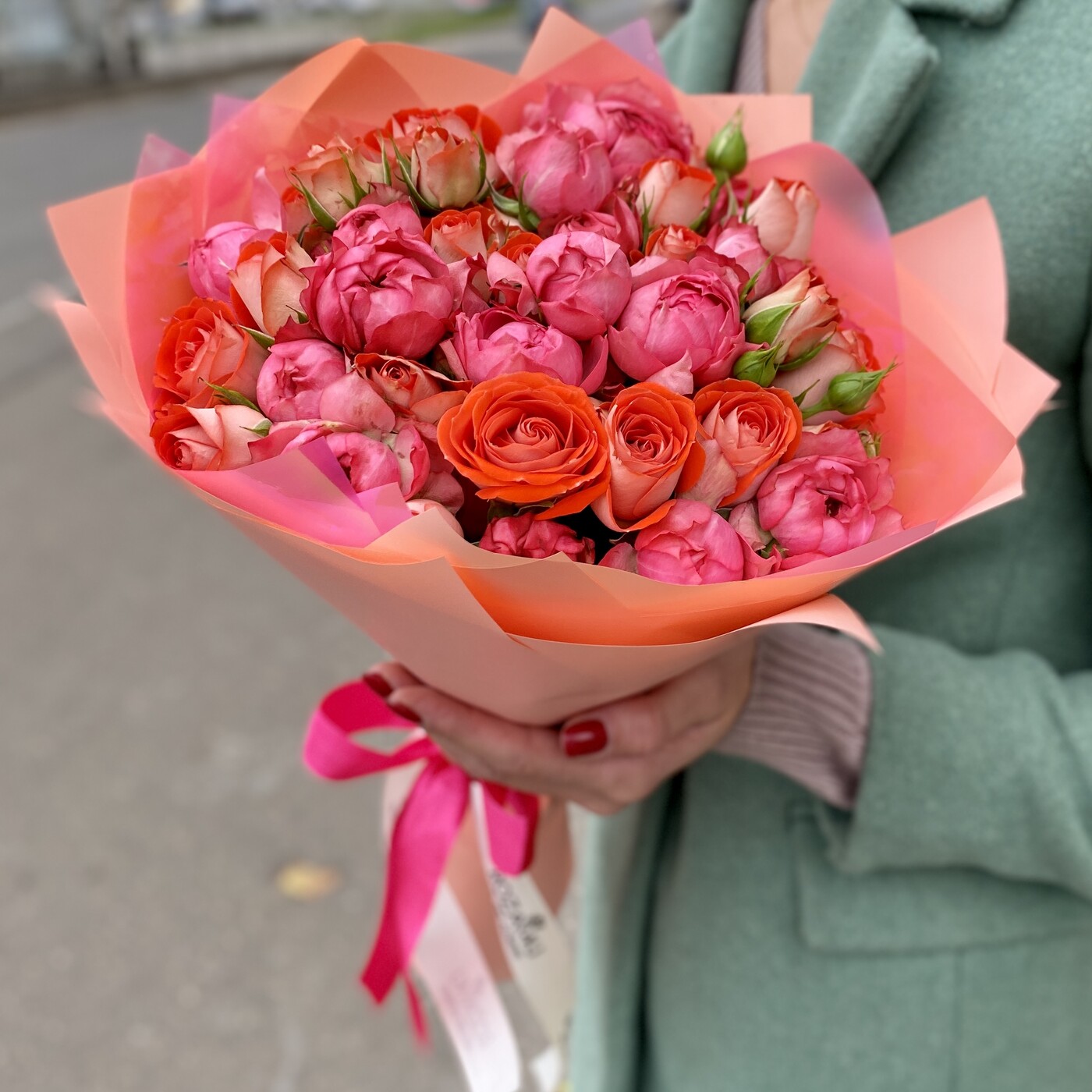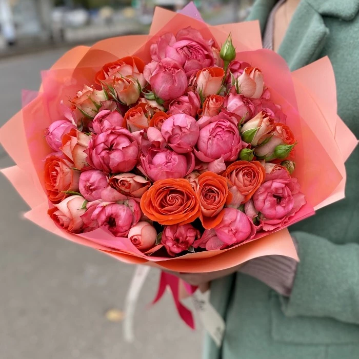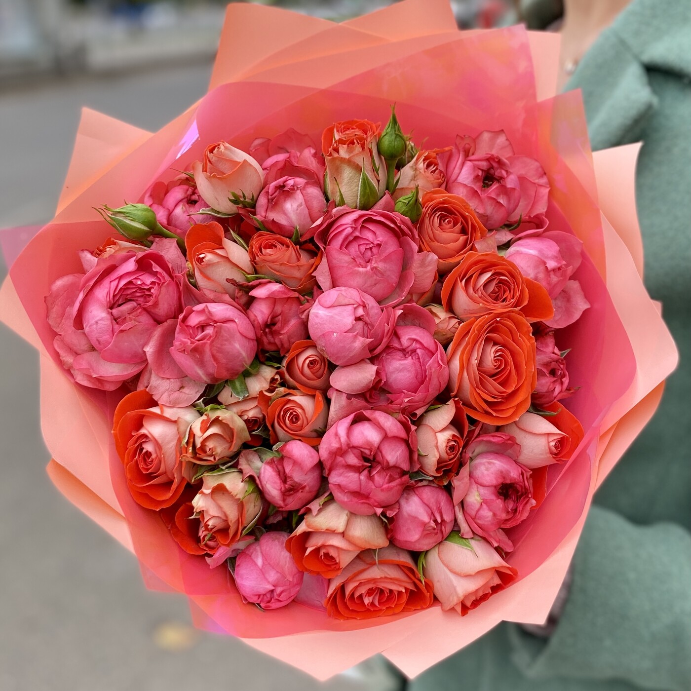 Яркий, праздничный букет из кустовых роз сорта Задик (Zadique) и вишневой Джульетты. Такой букет прекрасно подойдет в качестве дополнения к подарку на день рождения или юбилей. Красивый, стильный букет для хорошего настроения.