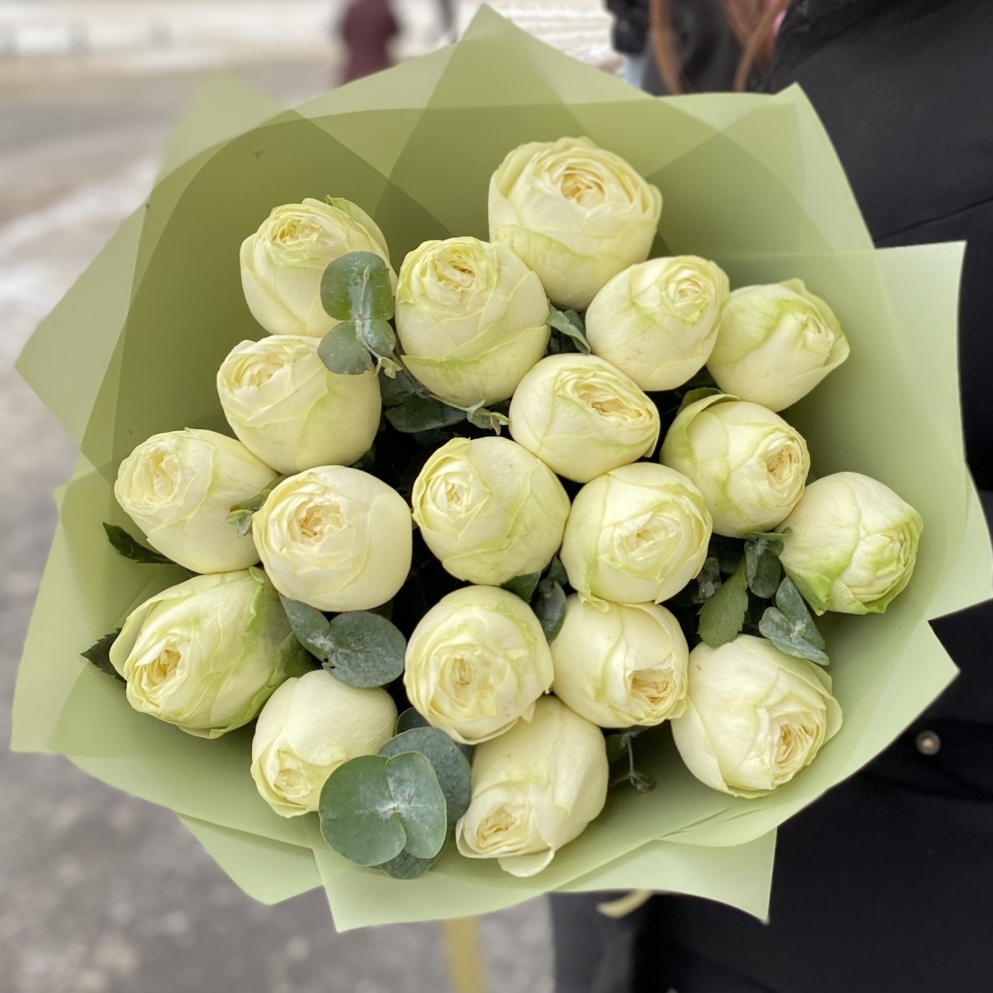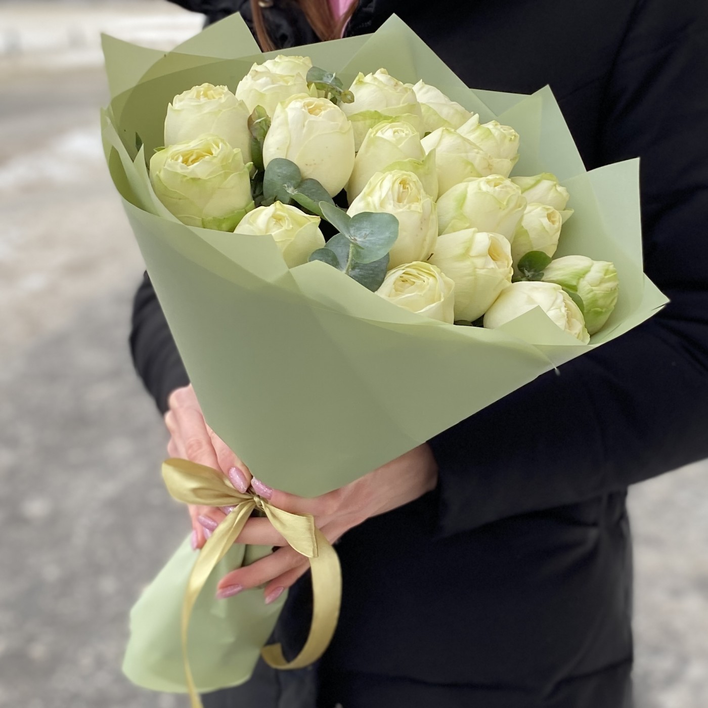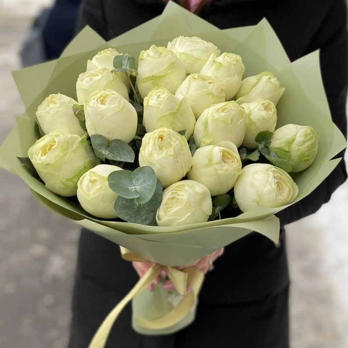 Букет из пионовидных роз сорта Пур Блонд с эвкалиптом. Такой нежный букет роз можно преподнести в качестве подарка на свадьбу или день рождения. Подарите своим любимым и родным нежные пионовидные розы.