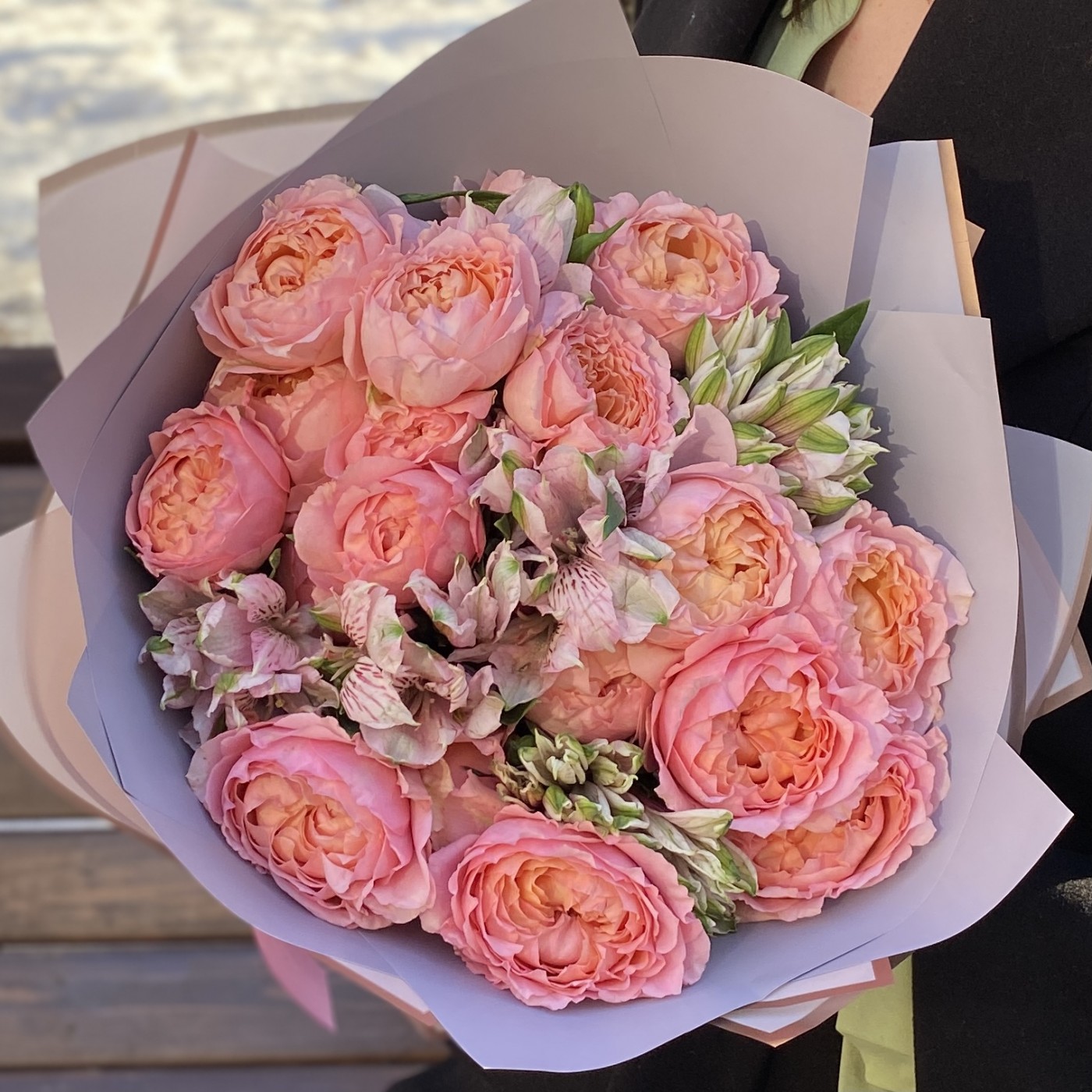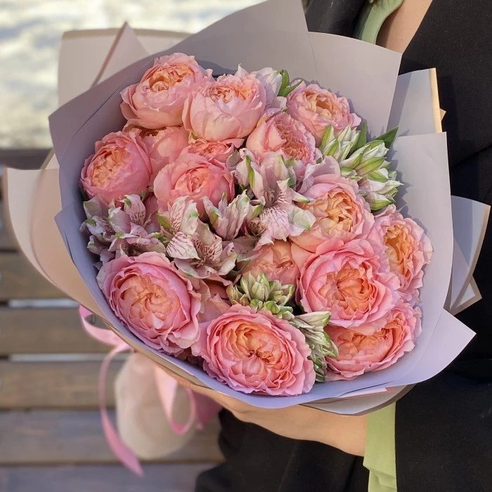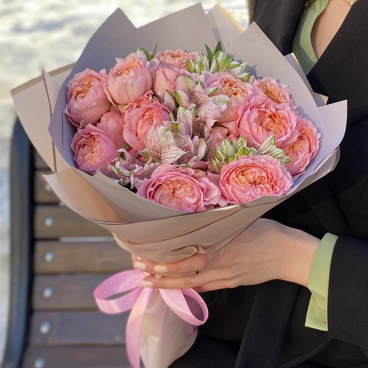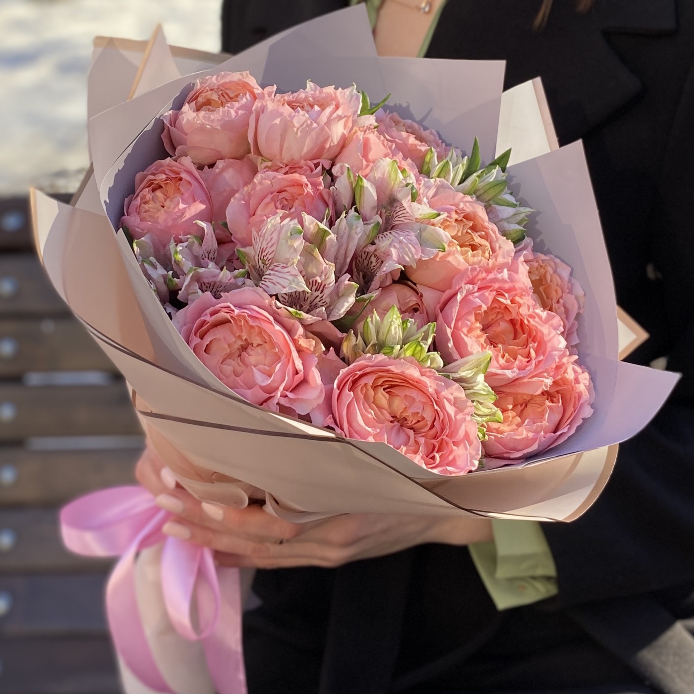 Нежный и романтичный букет кустовых пионовидных роз сорта Джульетта и розовых альстромерий. Прекрасный подарок на любое событие.