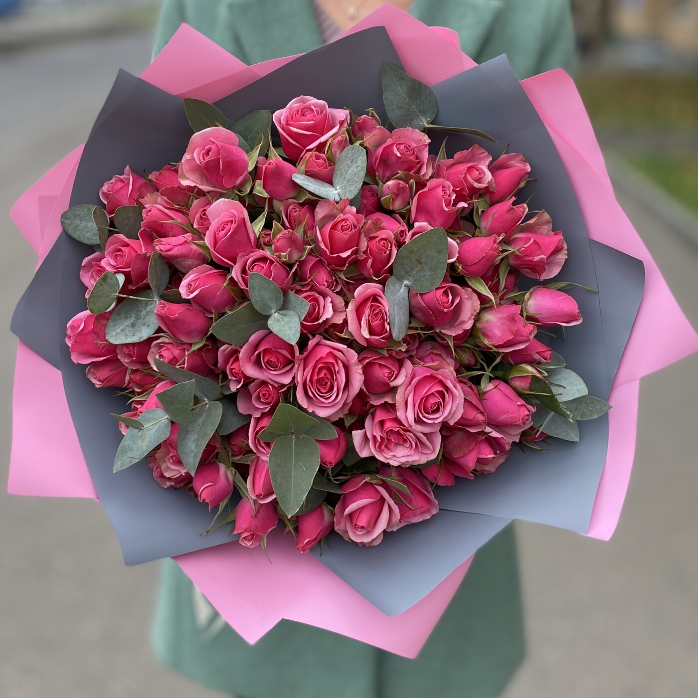 Яркий букет из кустовых роз сорта Алексин с эвкалиптом в стильной упаковке. Такой букет можно преподнести в качестве комплимента, подарить учителю или маме на любое событие.