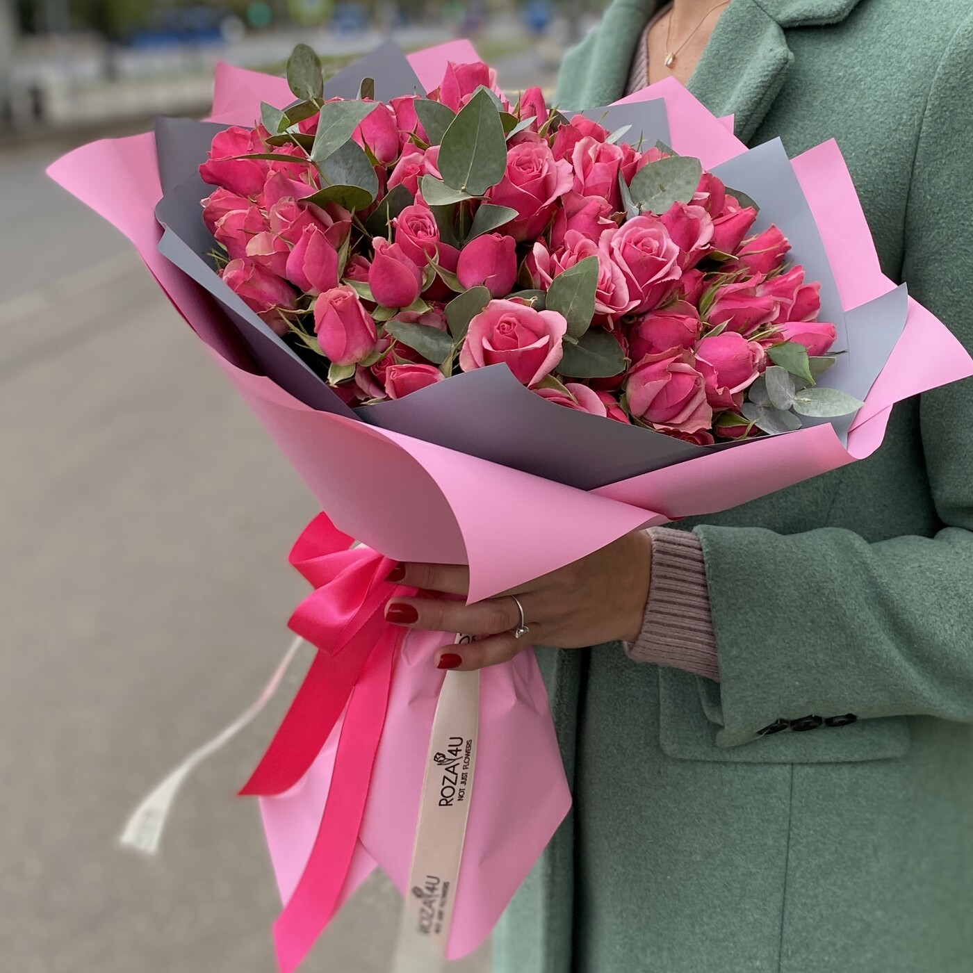 Анна о заказе: 51 малиновая розаСпасибо! Букет великолепный! Цветы свежайшие, упругие, очень красивые, крупные. Добавлено 4 коралловые розы и зелень