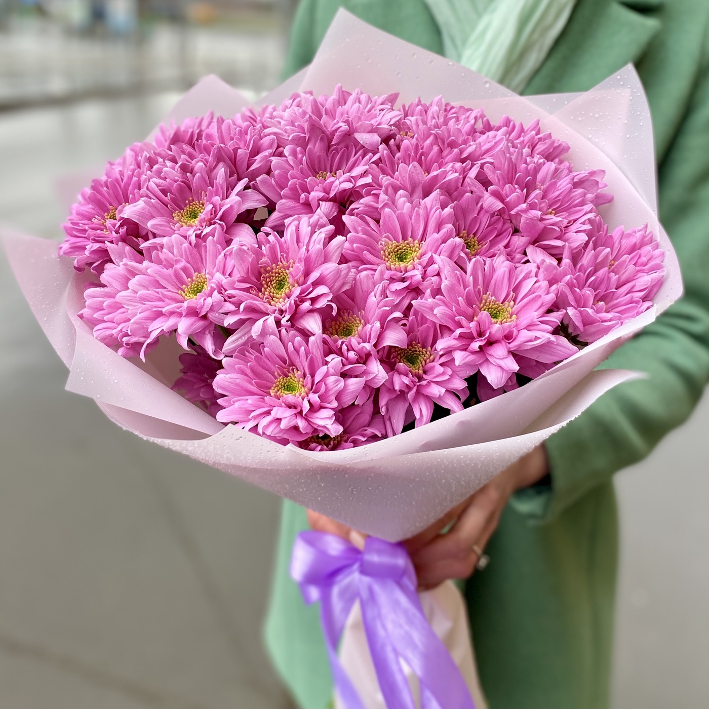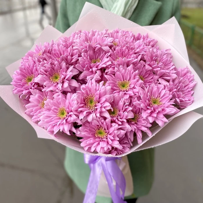 Букет с яркими и пышными ветками хризантемы розового цвета, украсит любой праздник своей красотой.