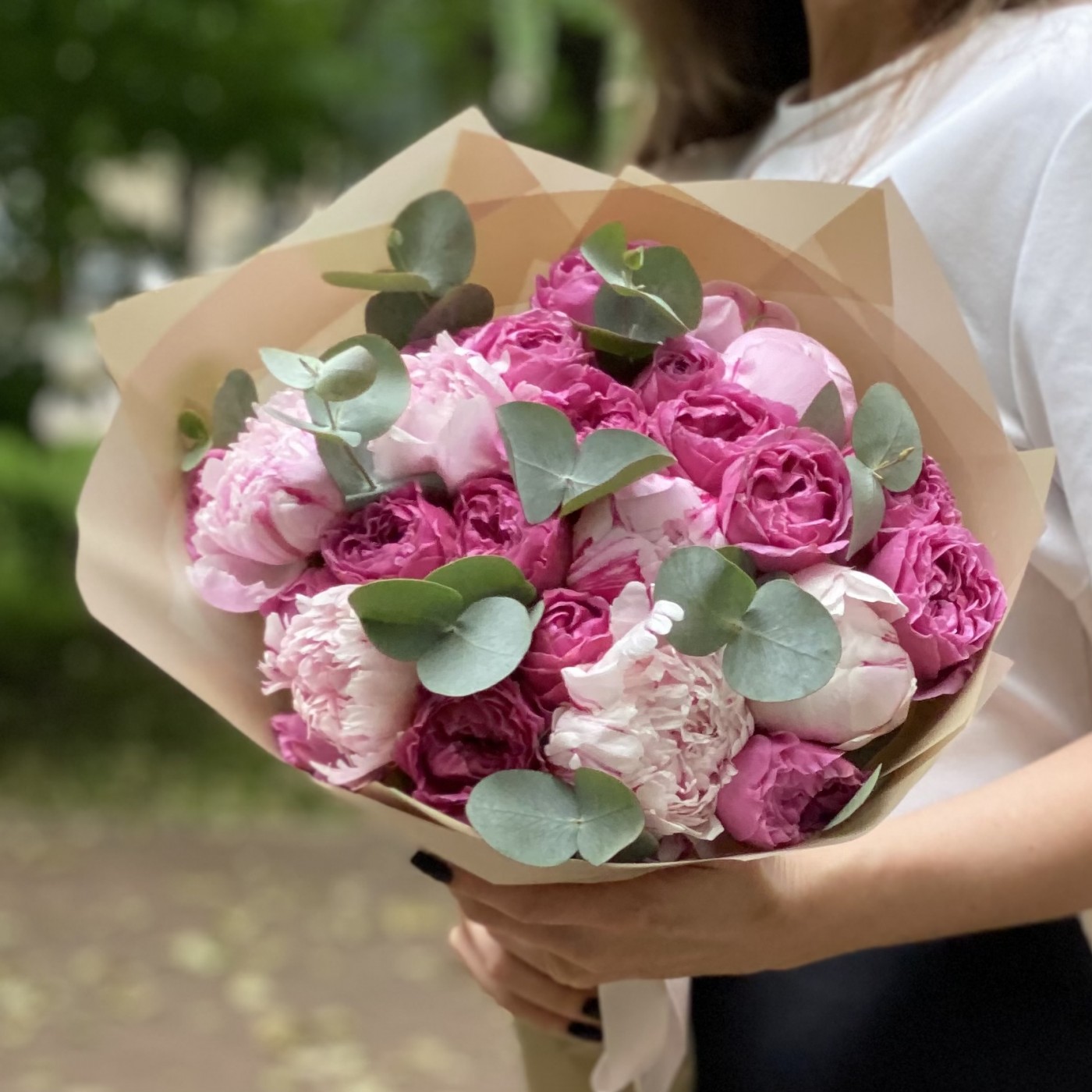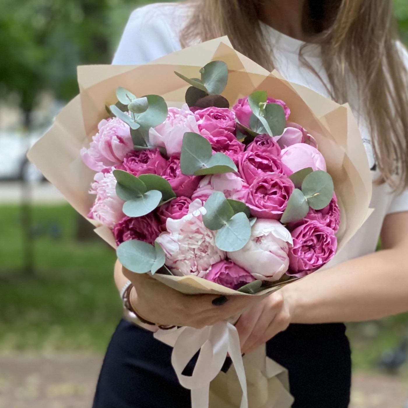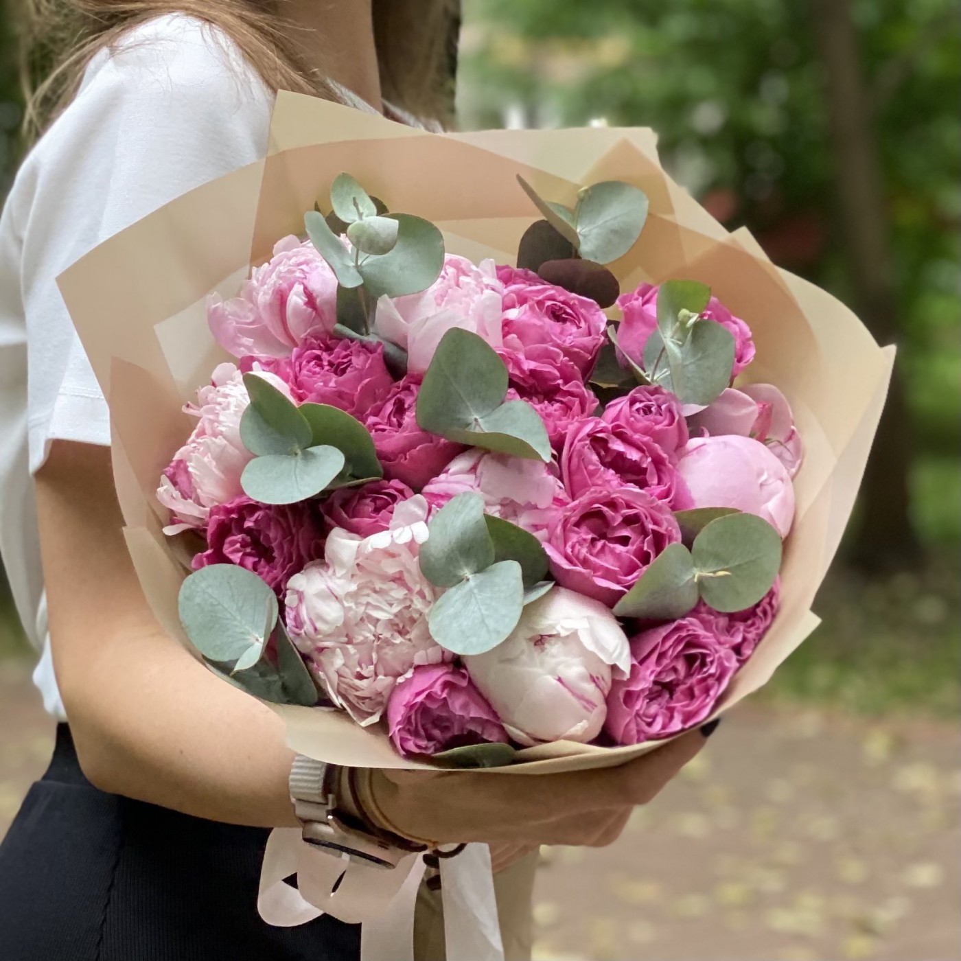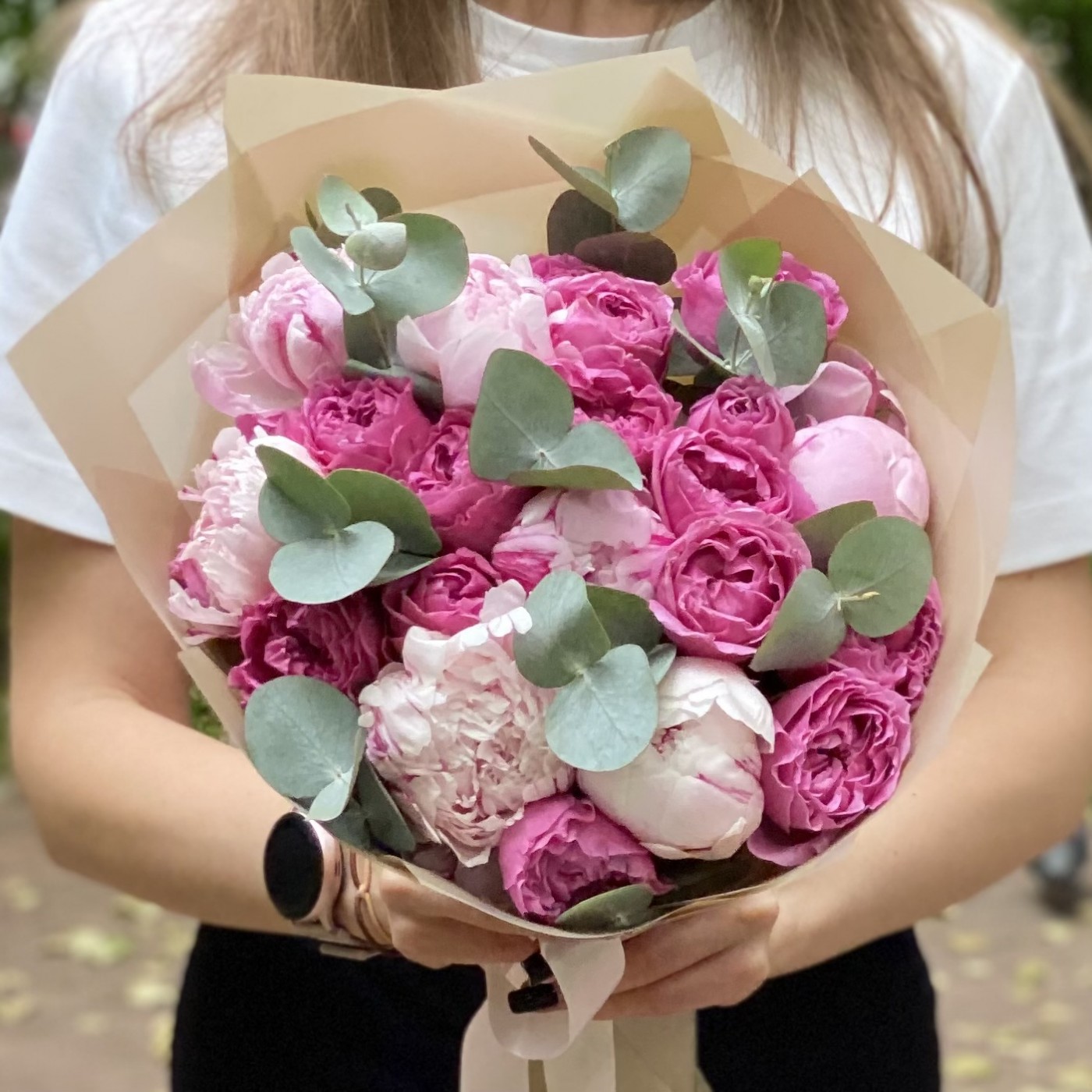 Сборный букет из ароматных пионов сорта Сара Бернар и пионовидной кустовой розы Мисти Баблс станет идеальным подарком для любимой женщины.