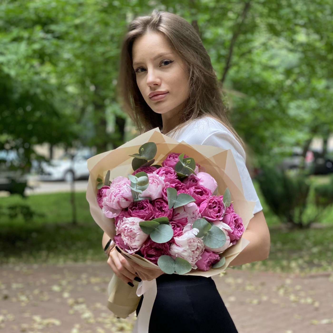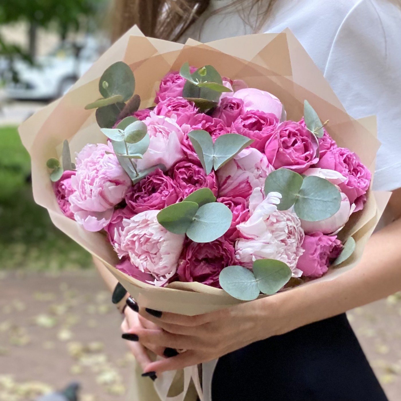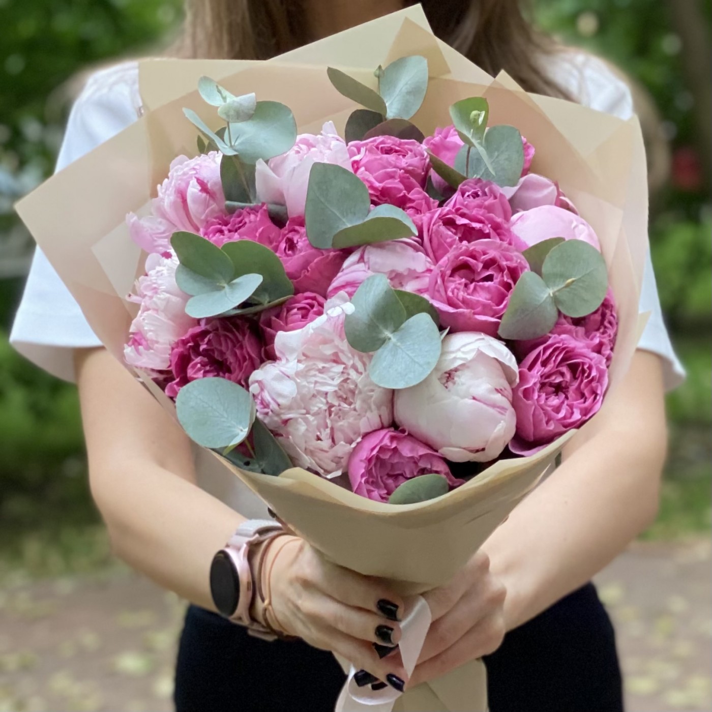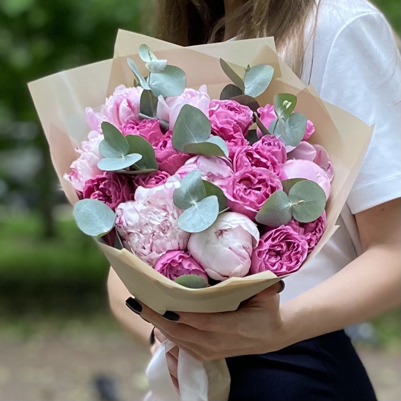 Сборный букет из ароматных пионов сорта Сара Бернар и пионовидной кустовой розы Мисти Баблс станет идеальным подарком для любимой женщины.