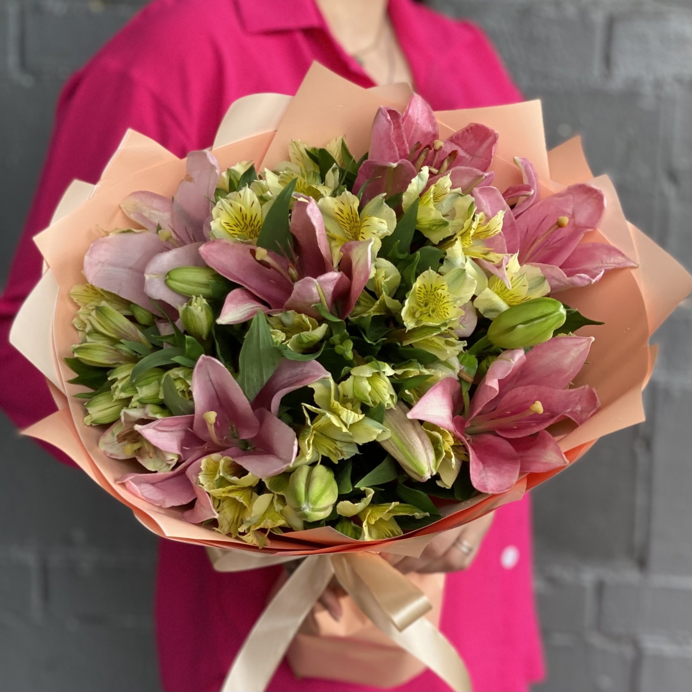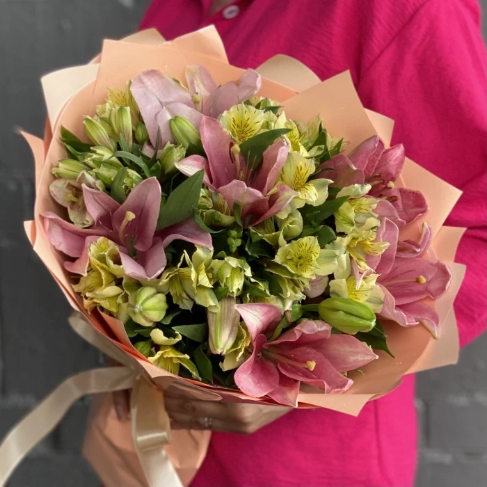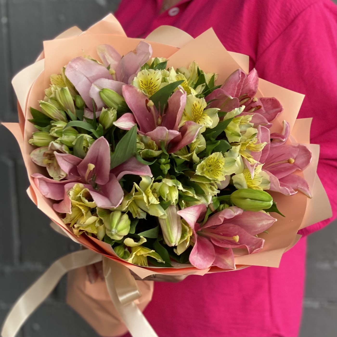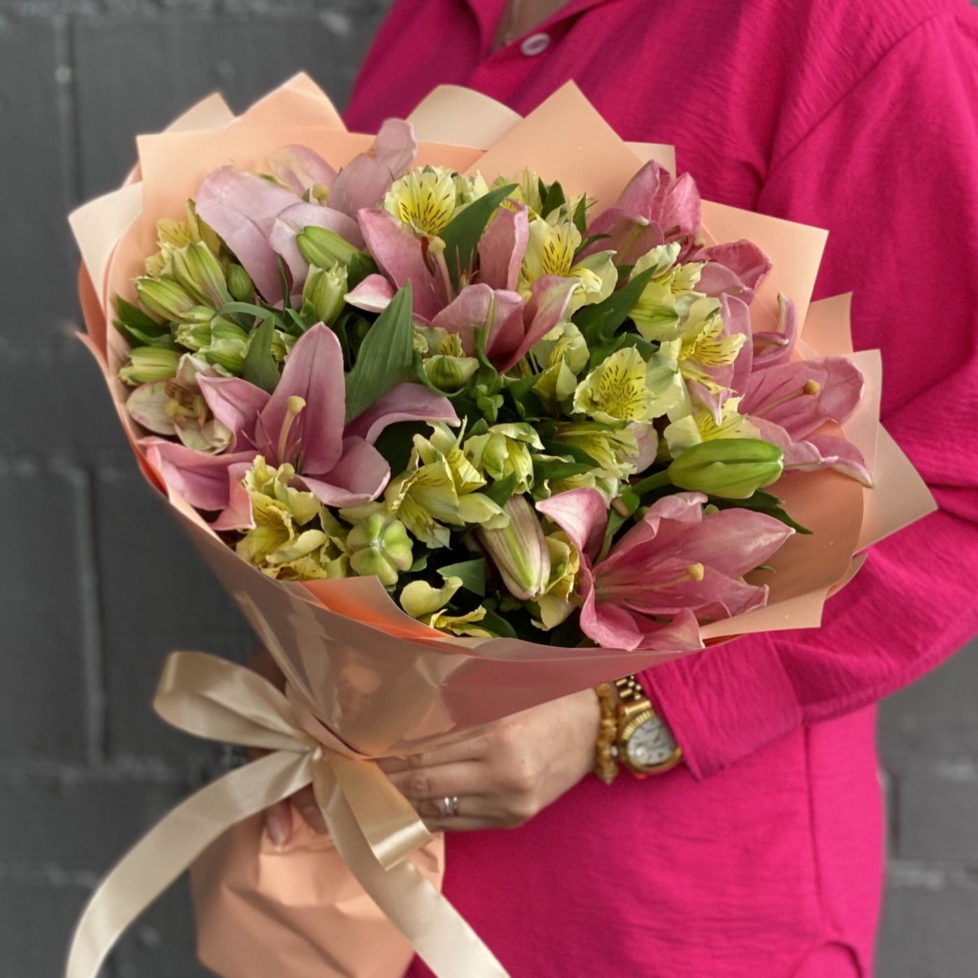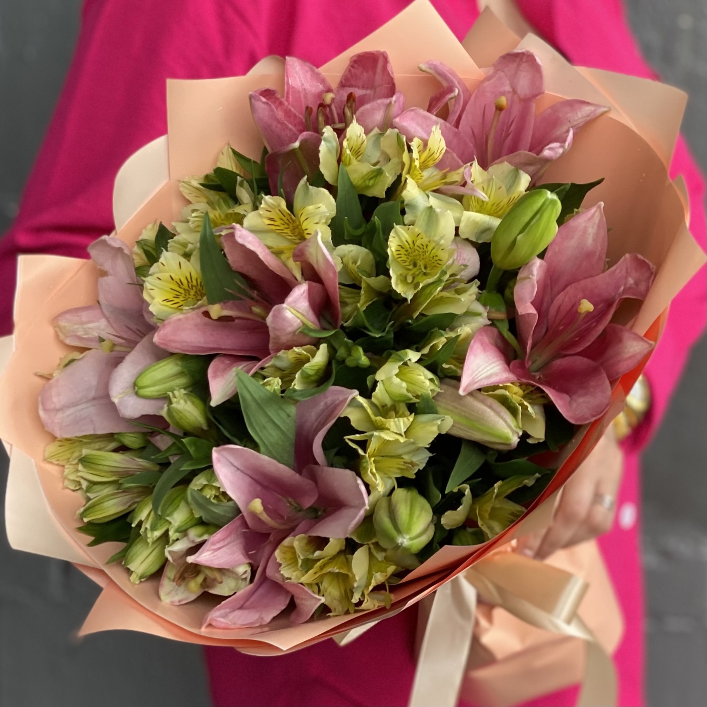 Яркий букет из альстромерий и лилии создан для самых радостных поводов.