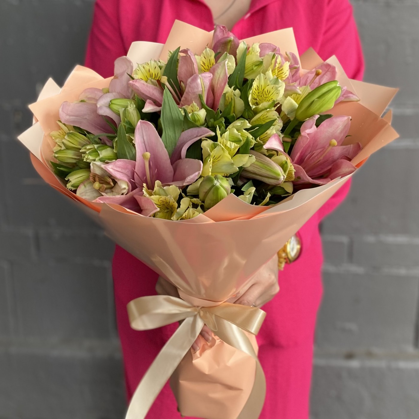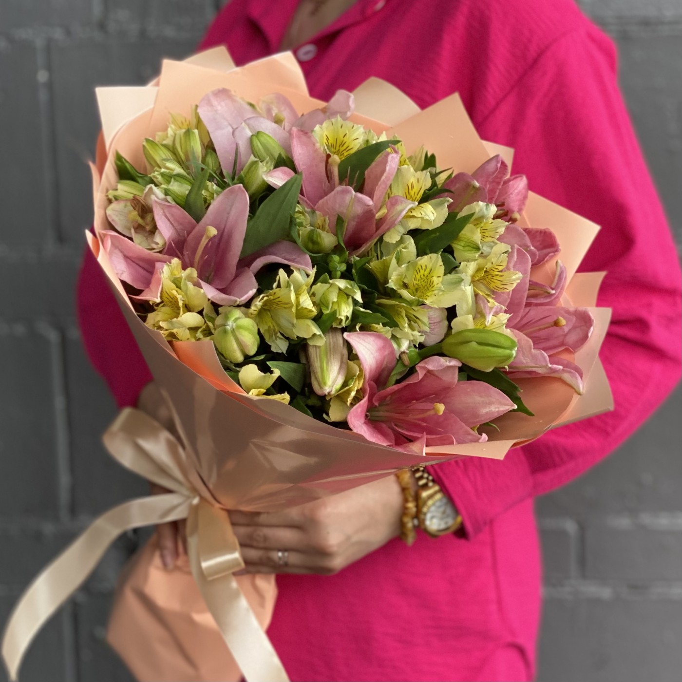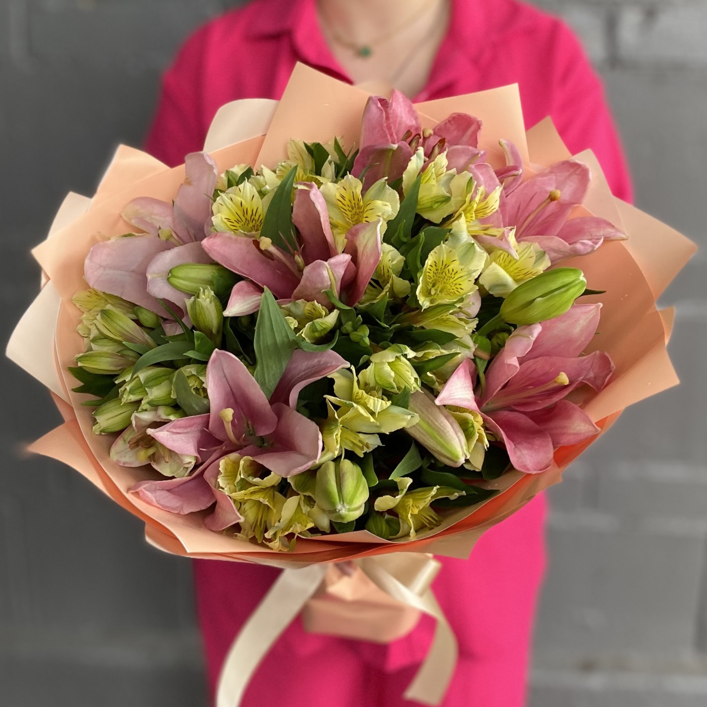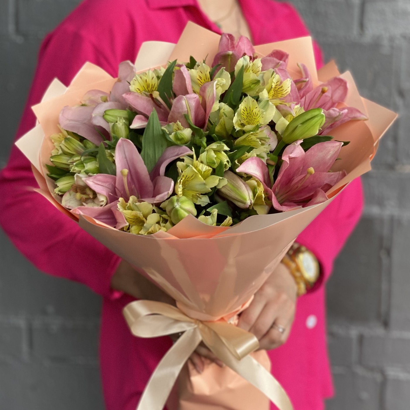 Яркий букет из альстромерий и лилии создан для самых радостных поводов.