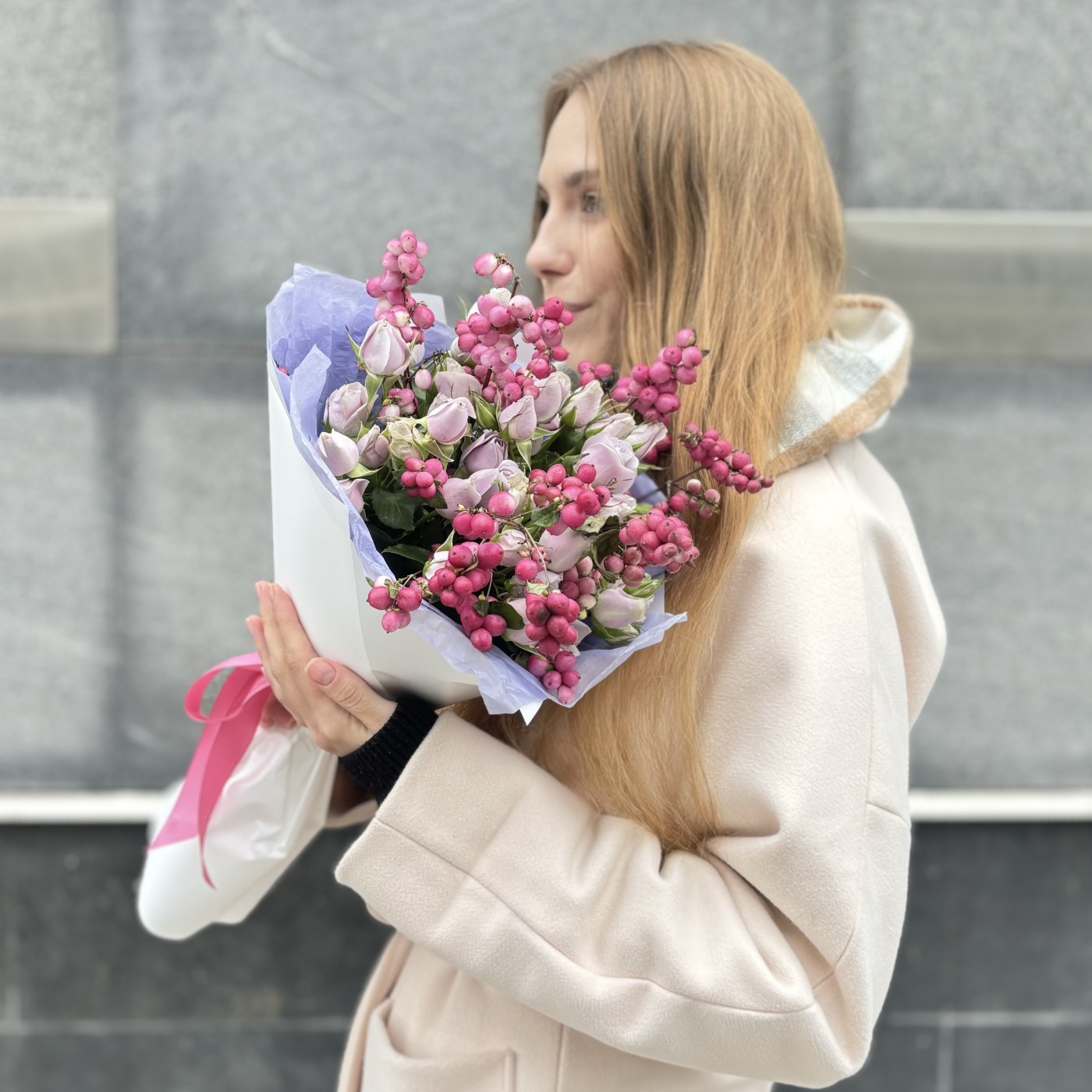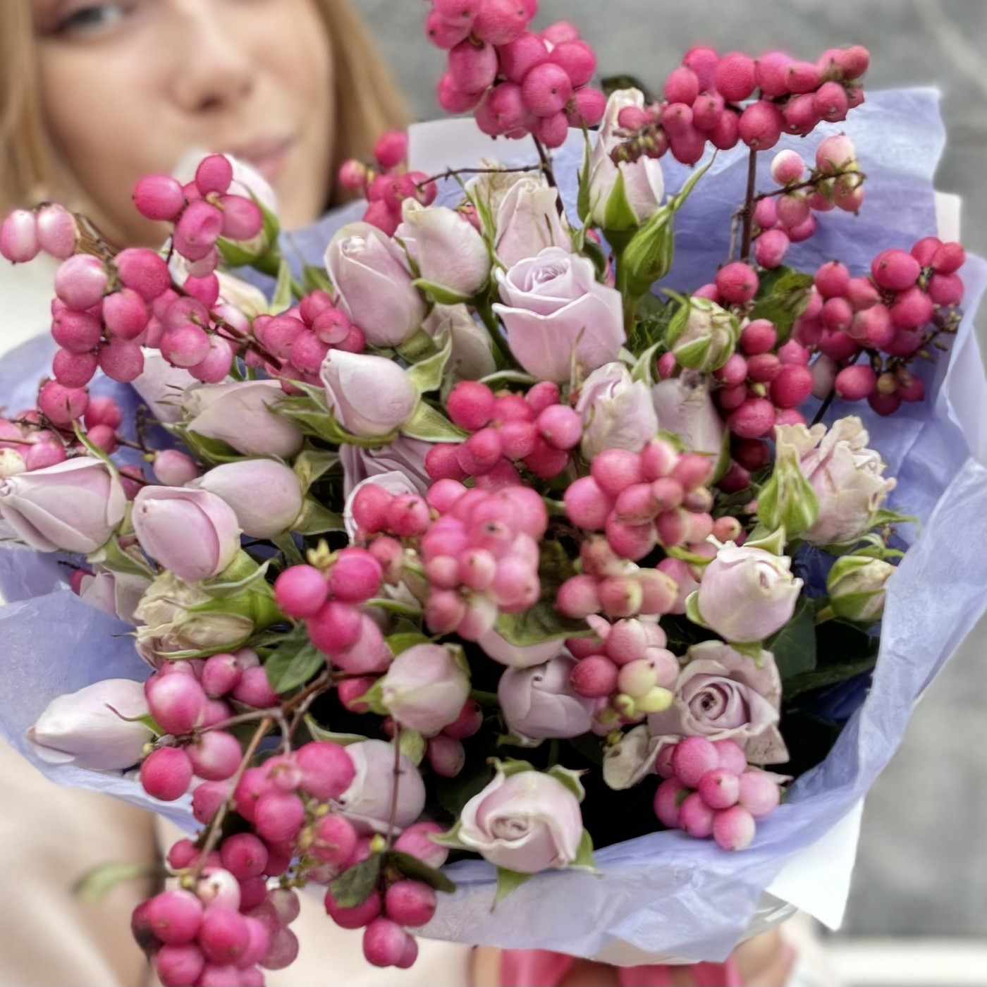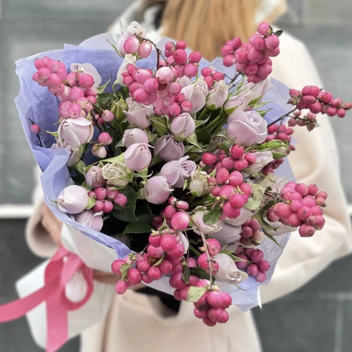 Букет на годовщину Жемчужная свадьба состоит из сиреневой кустовой розы снежноягодника, которые характеризуются, нежными бутонами и мягкими, бархатистыми лепестками.