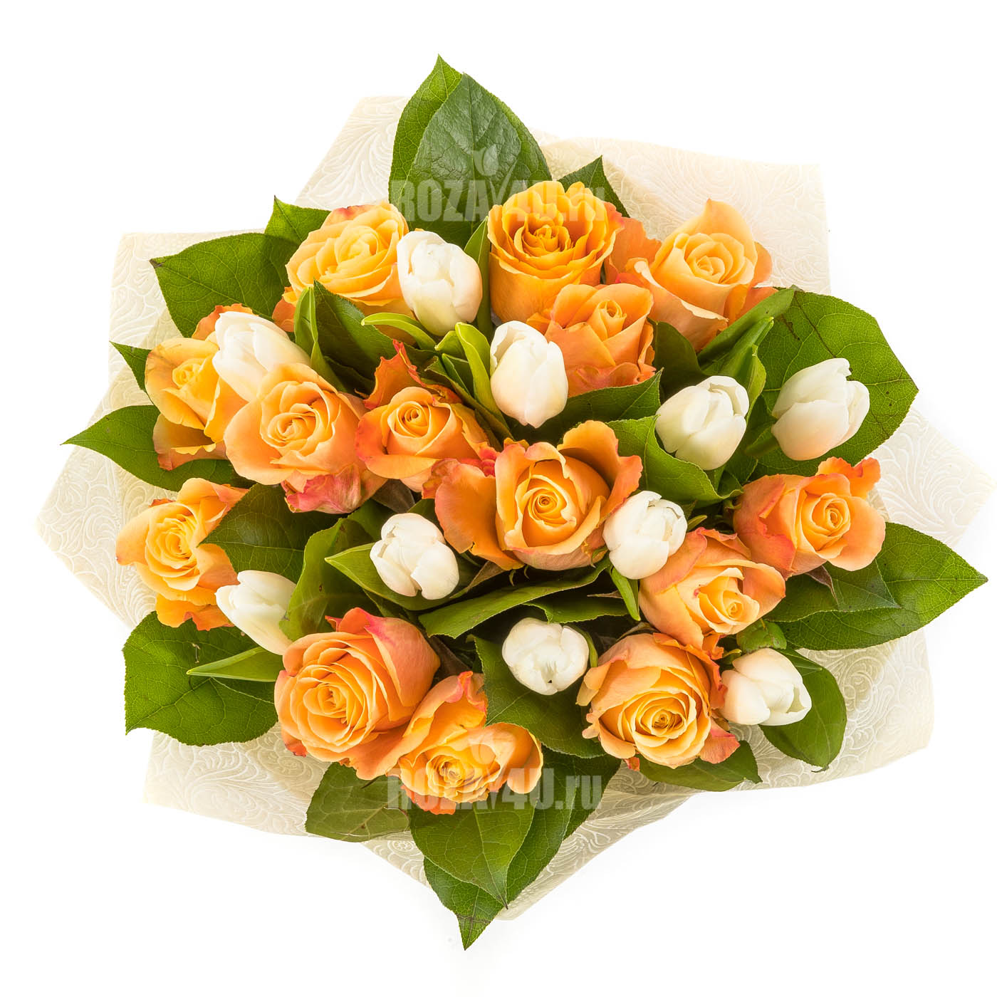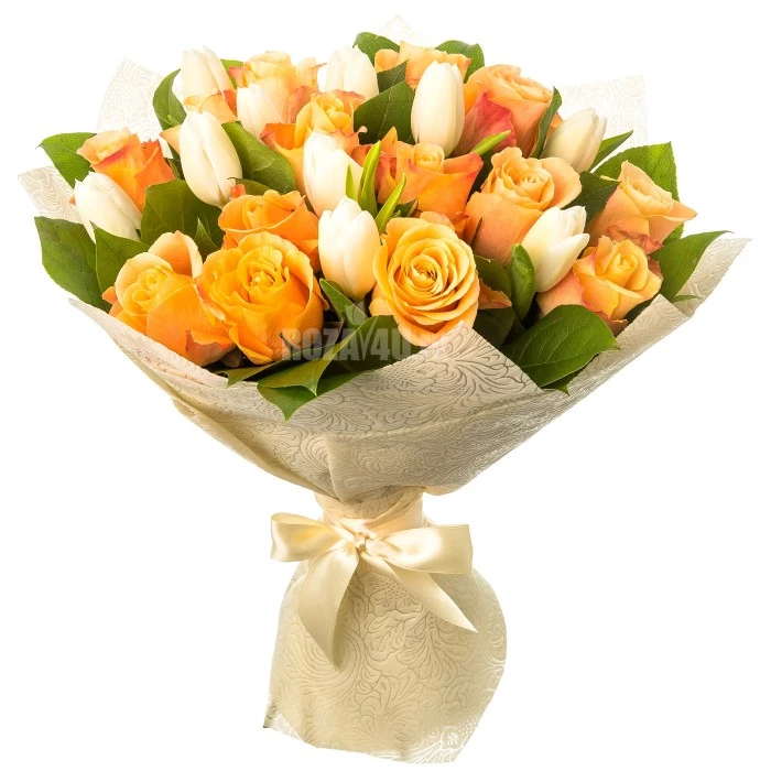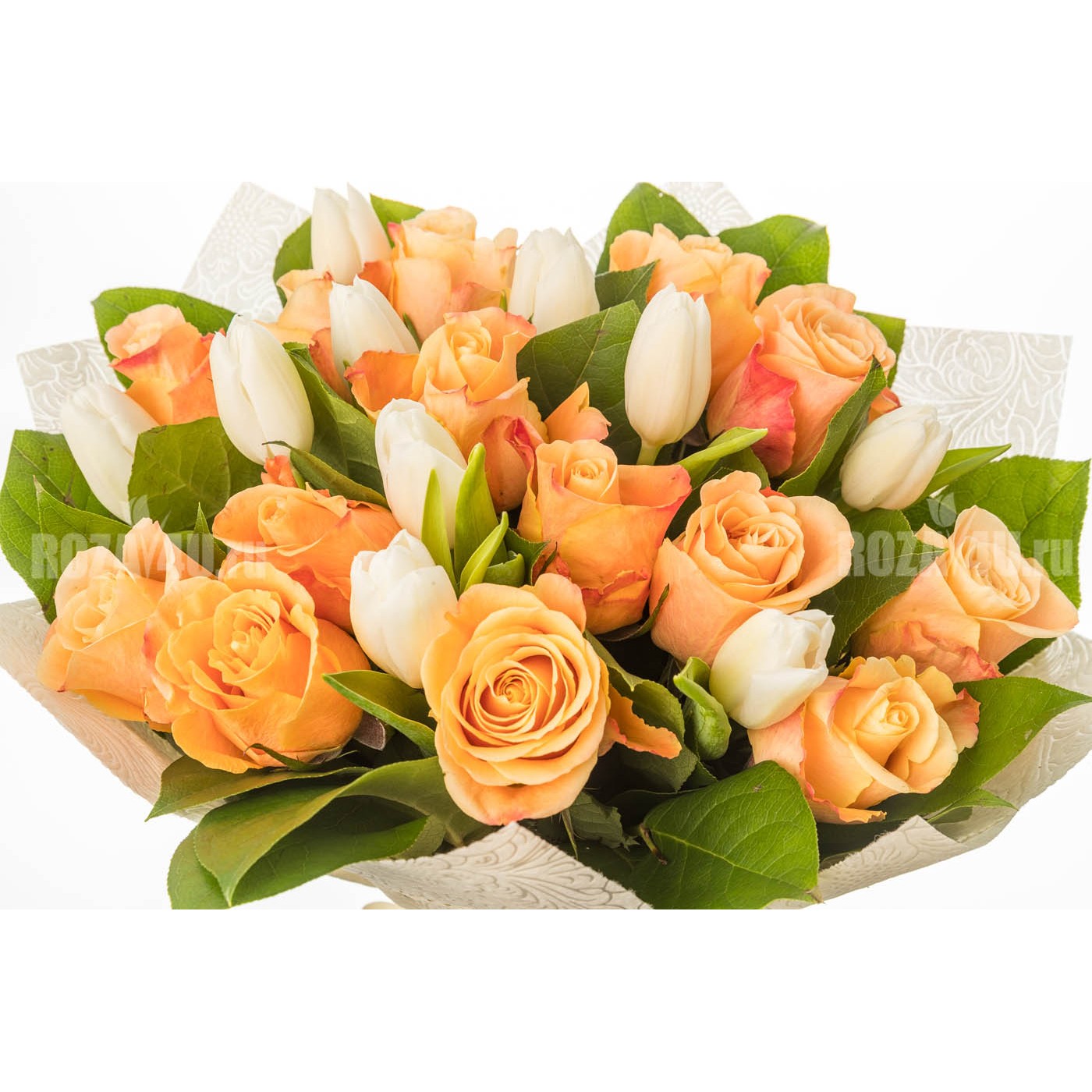 Нежный утонченный букет из роз и тюльпанов создан очаровывать с первого взгляда. Букет свежих ароматных цветов-идеальный подарок к торжественному событию для близкого человека.