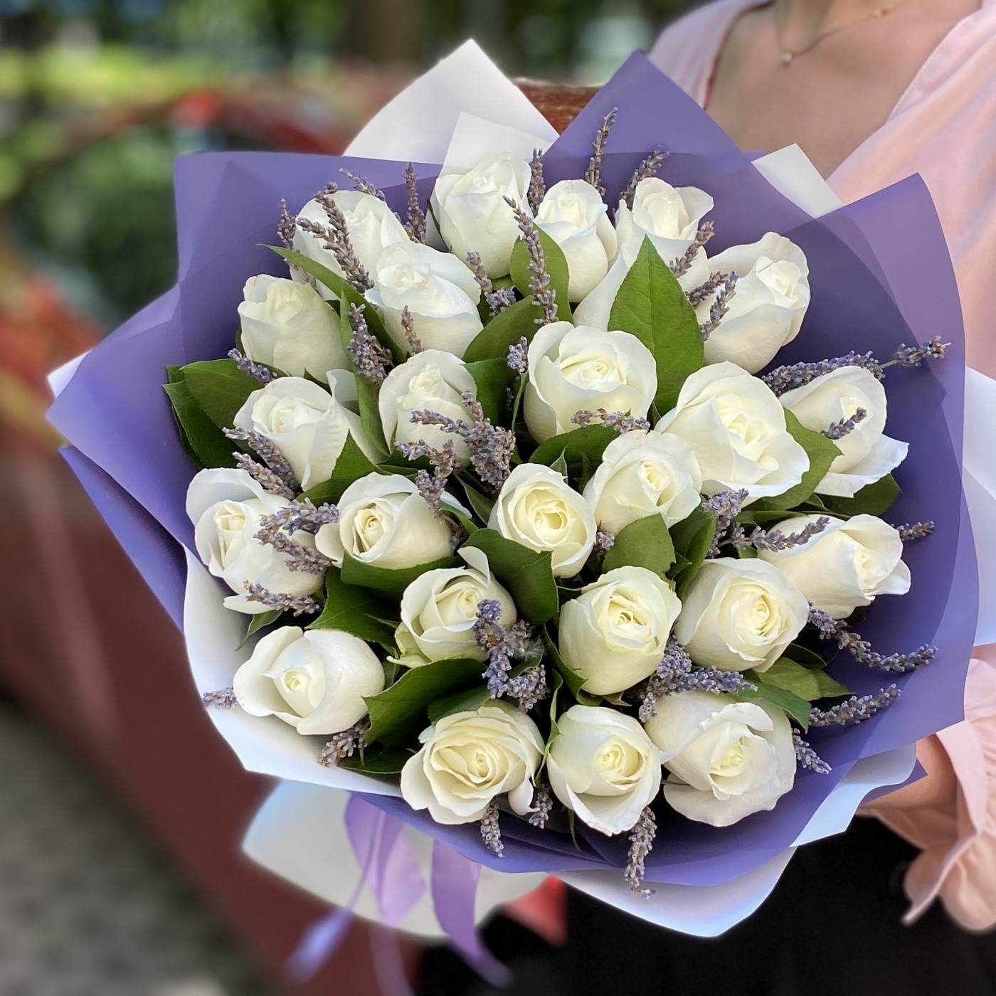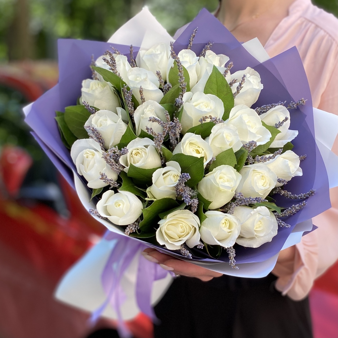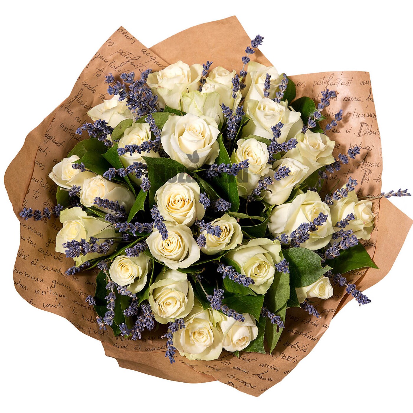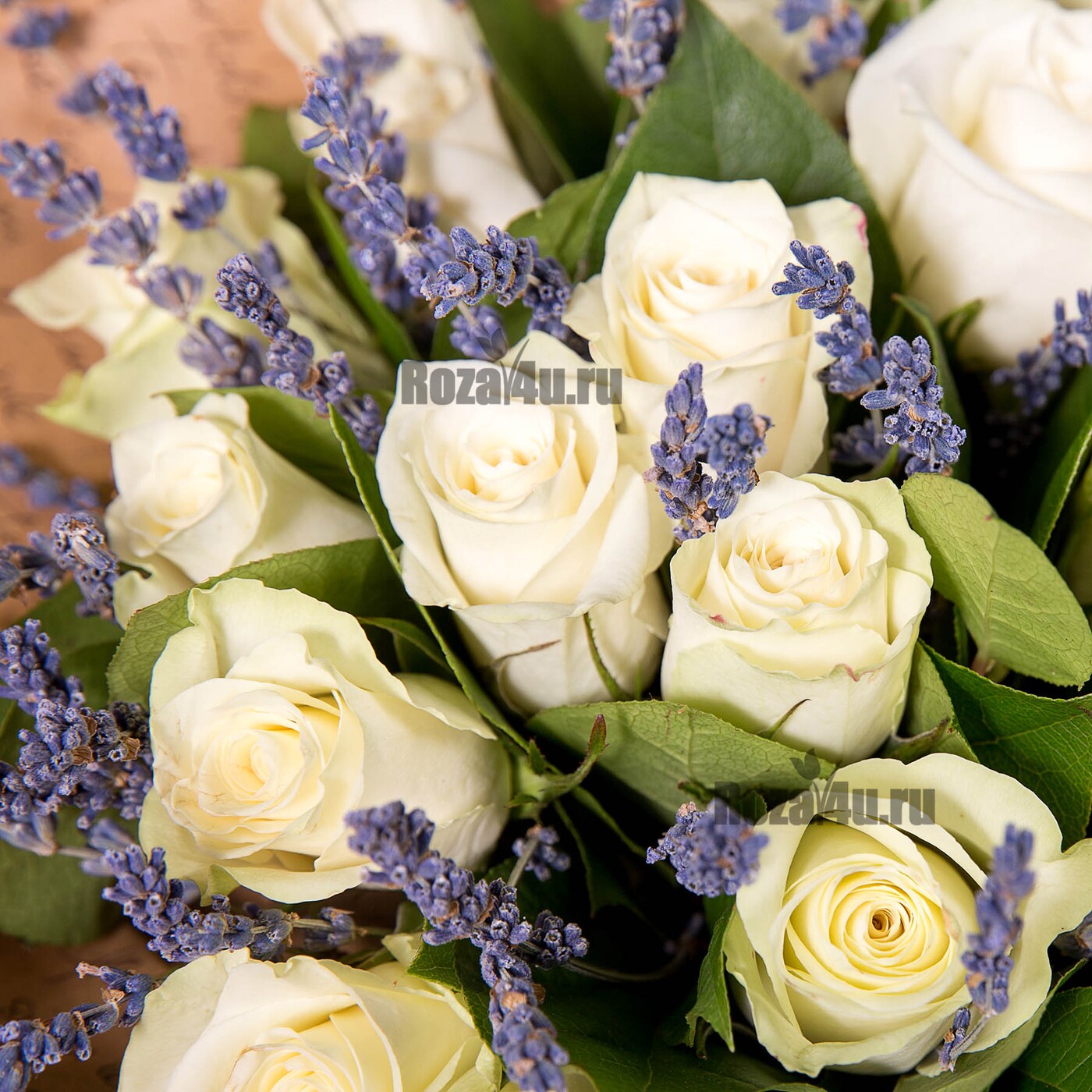 Восхитительный букет из белых роз с лавандой очаровывает с первого взгляда. Идеально составленная композиция, сочетание роскошного белого и модного сиреневого цветов, пленительный богатый аромат, - все это делает букет незабываемым. Подойдет в качестве подарка маме,любимой девушке, подруге или коллеге. Лаванда, по преданию, приносит в дом мир, покой и уют, а белые розы являются символом искренности, добрых намерений и дружбы. Этот волшебный стильный букет никого не оставит равнодушным.