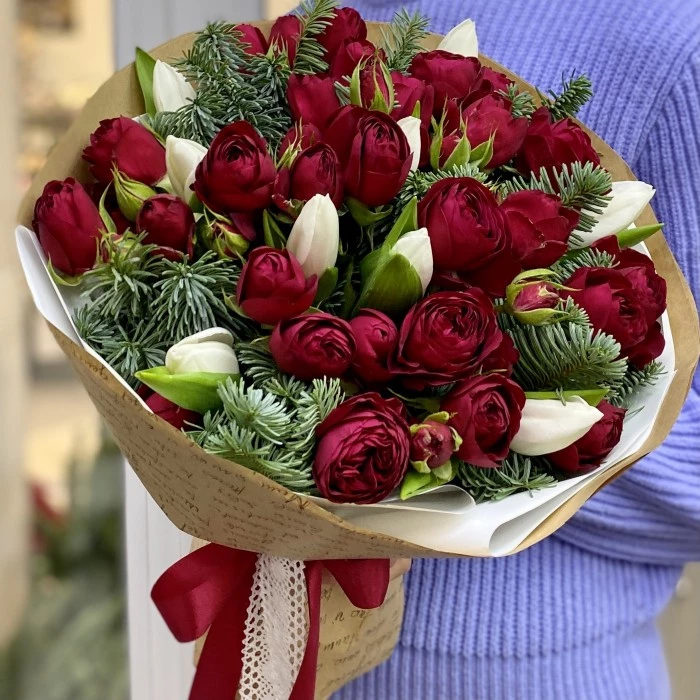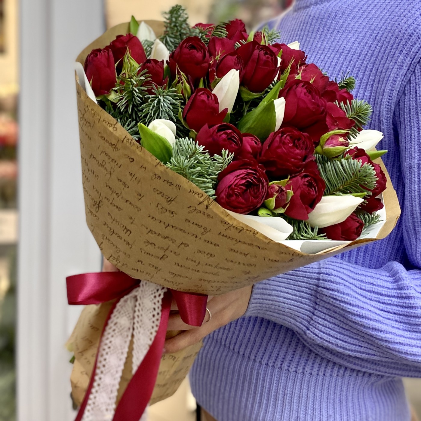 Зимний букет с пионовидными розами, прекрасными белыми тюльпанами которые смотрятся зимним волшебством среди натурального нобилиса. Упакован в корейскую пленку и крафт.