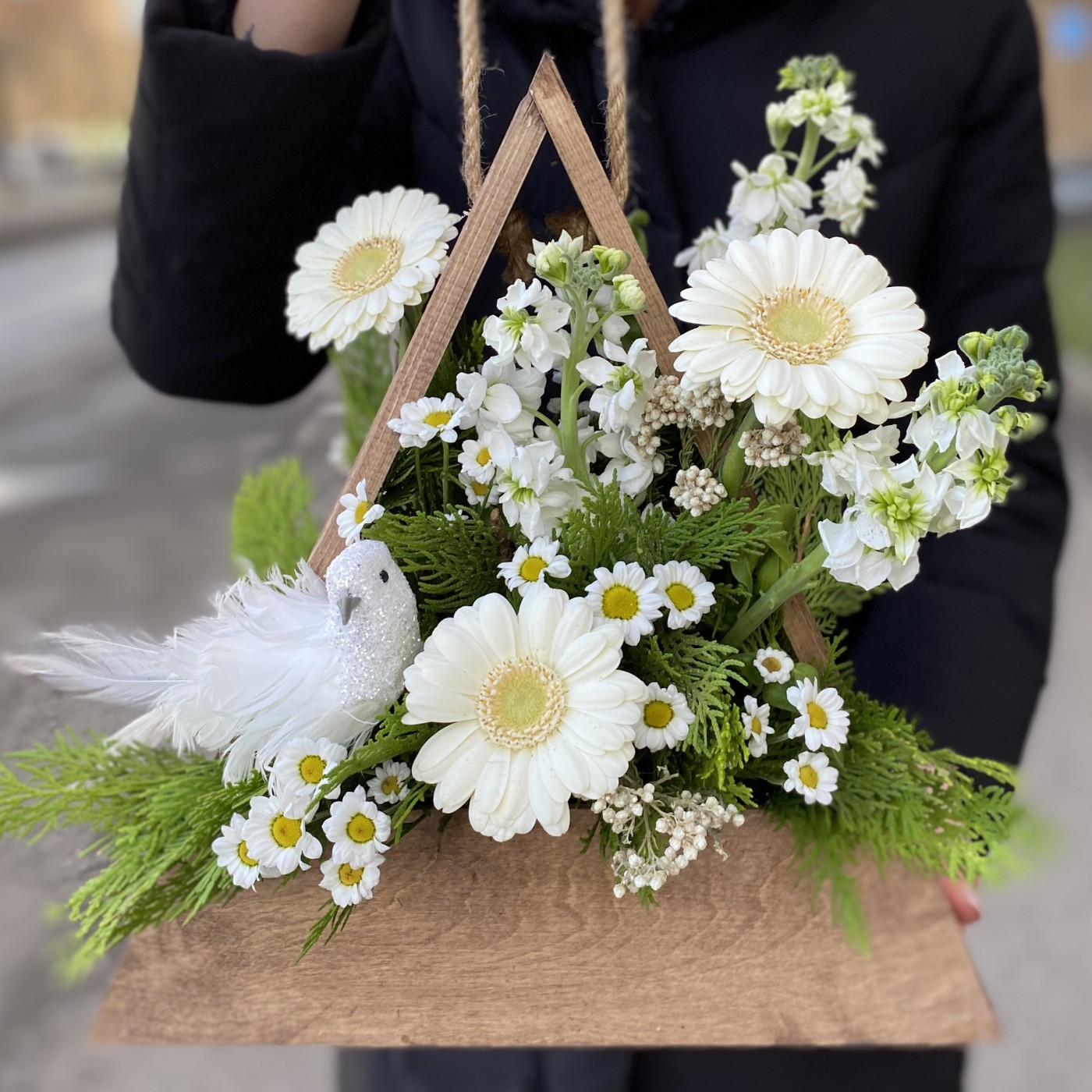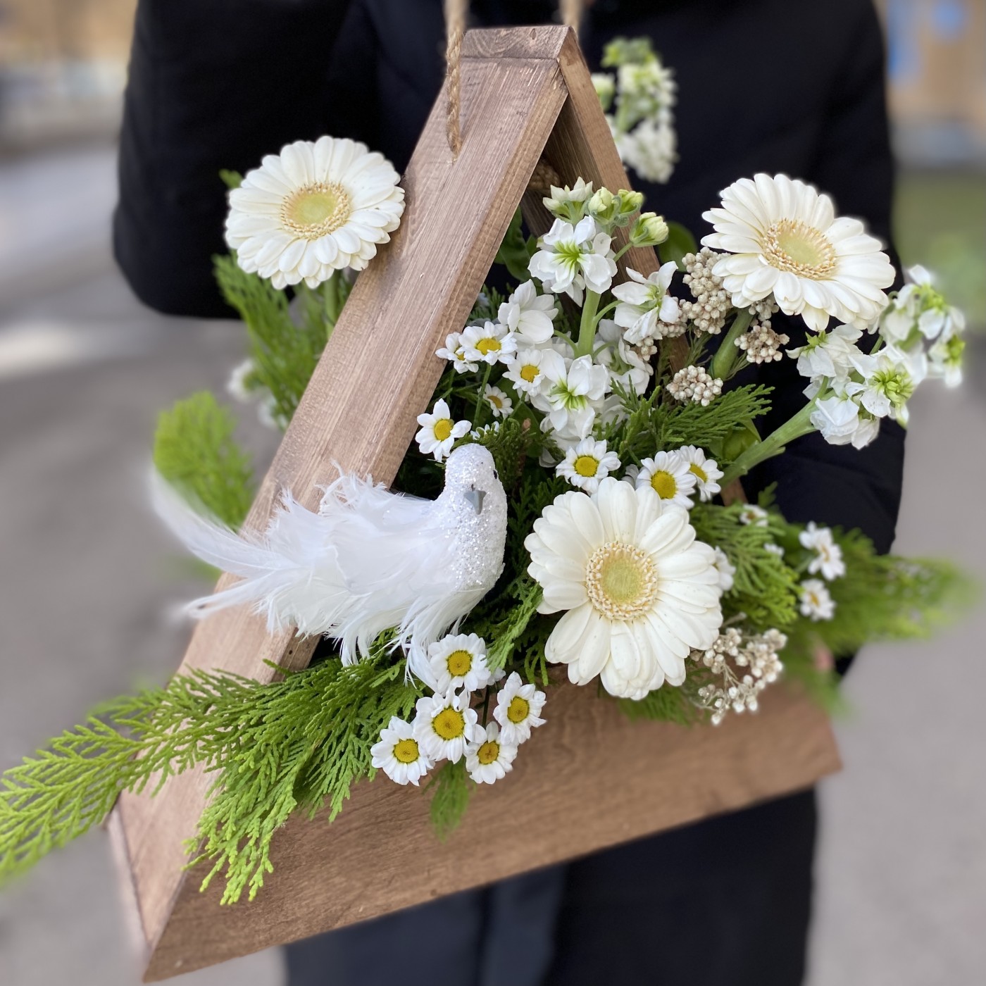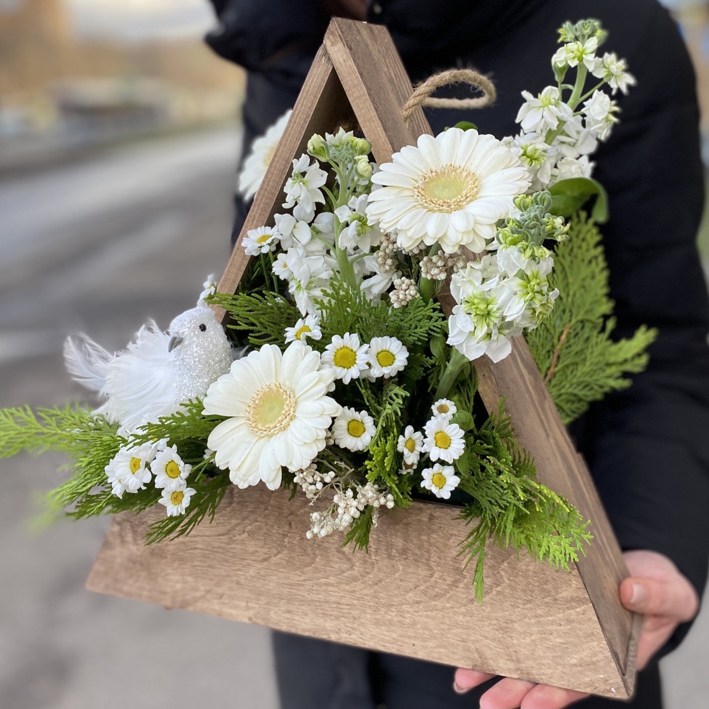 Нежная композиция в белых тонах, с птичкой в деревянном кашпо с ручкой, в виде треугольника. Необычная настольная композиция подойдет на любое событие.