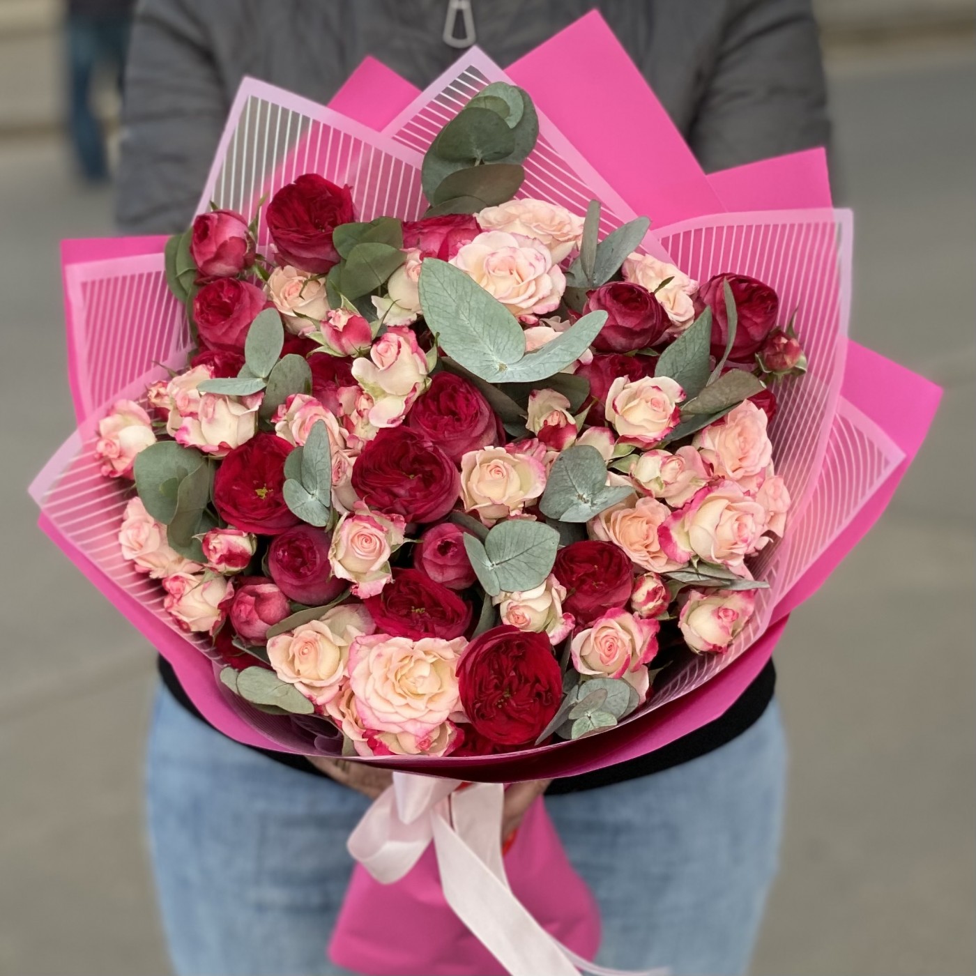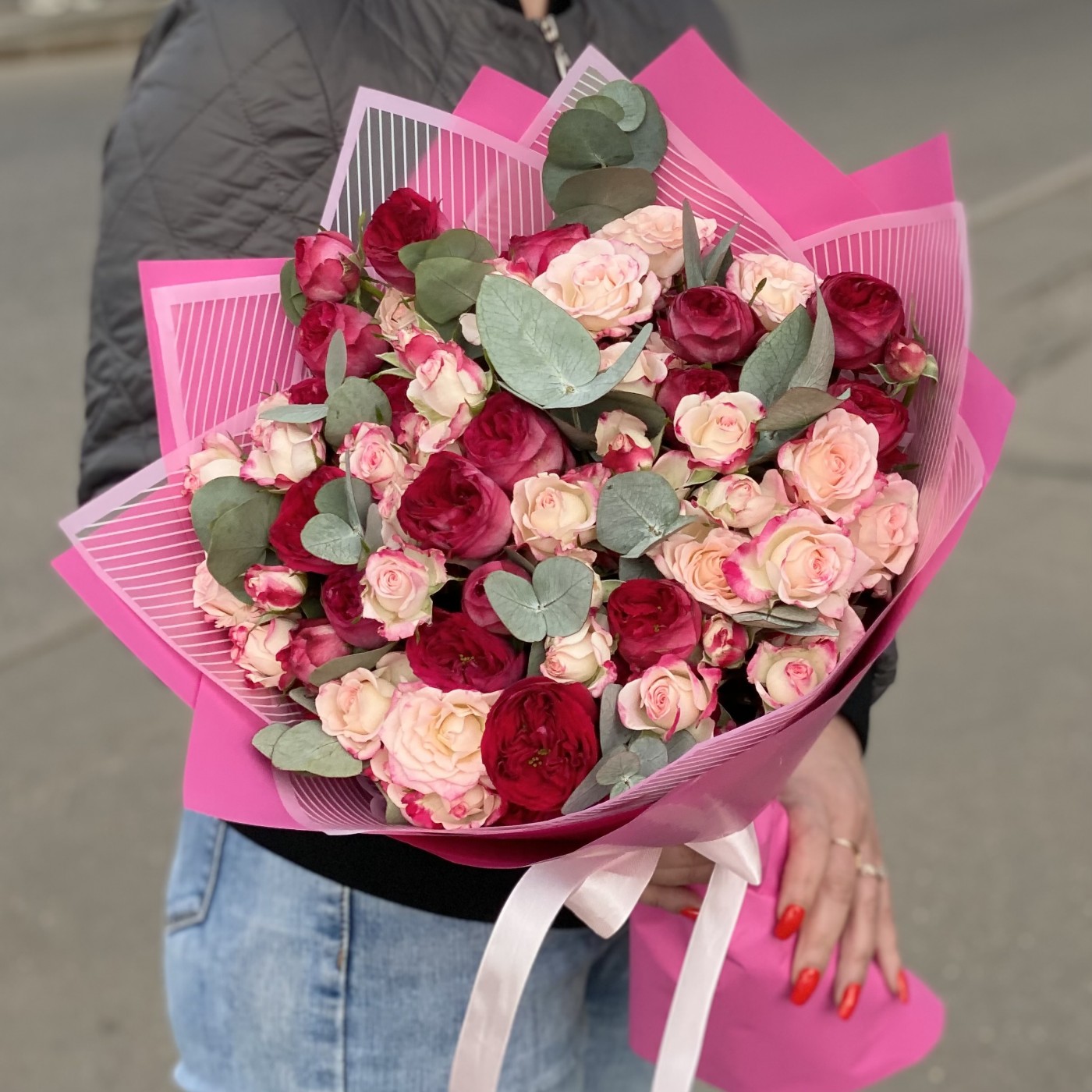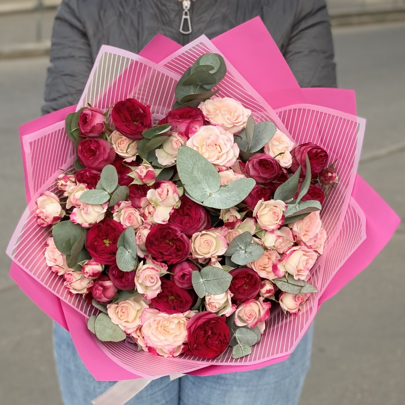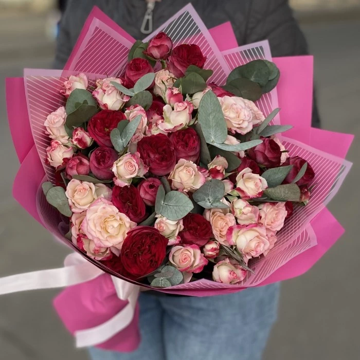 Нежность, воздушность и элегантность – именно такими словами можно описать этот прекрасный букет, состоящий из кустовых роз. Светло-розовые соцветия перекликаются с пышными малиновыми бутонами и создают невероятно необычную и гармоничную композицию. На контраст работают веточки эвкалипта, дарящие цветочному «облаку» свежесть и чистоту. Праздничность букету добавляет упаковка – прозрачные и ярко-розовые листы.