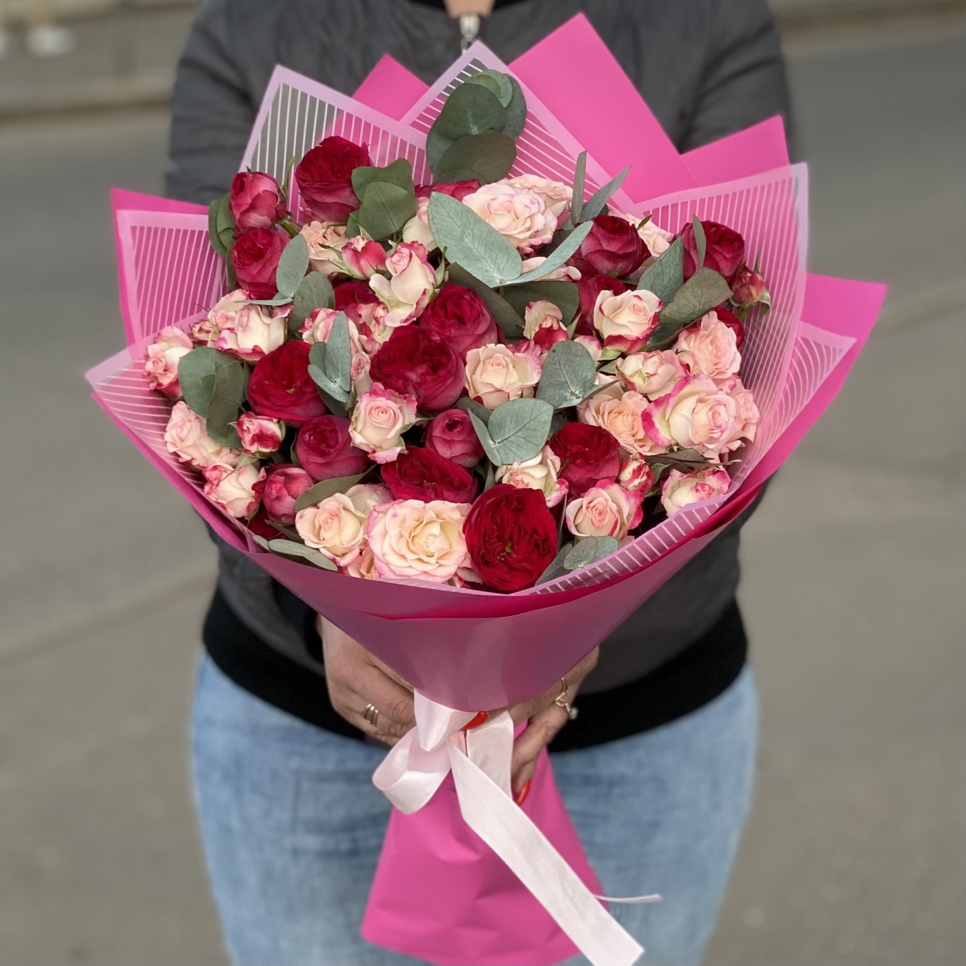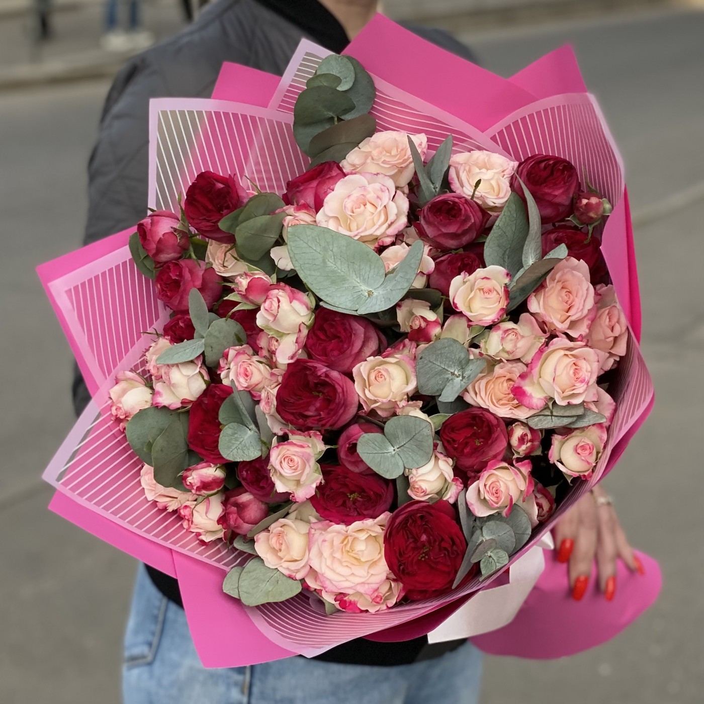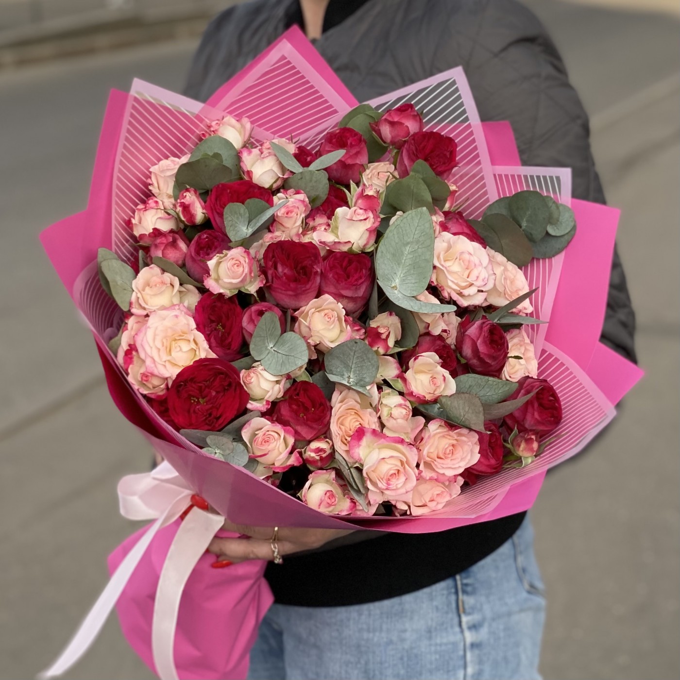 Нежность, воздушность и элегантность – именно такими словами можно описать этот прекрасный букет, состоящий из кустовых роз. Светло-розовые соцветия перекликаются с пышными малиновыми бутонами и создают невероятно необычную и гармоничную композицию. На контраст работают веточки эвкалипта, дарящие цветочному «облаку» свежесть и чистоту. Праздничность букету добавляет упаковка – прозрачные и ярко-розовые листы.