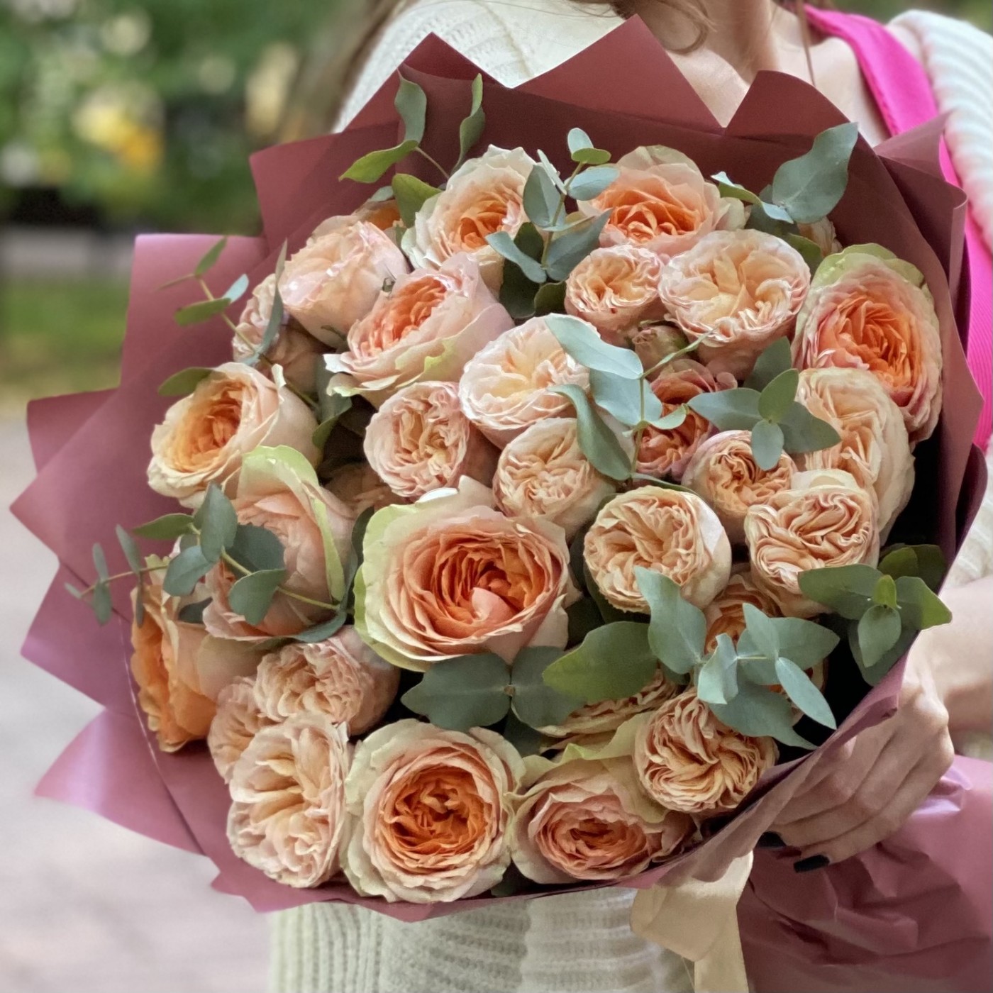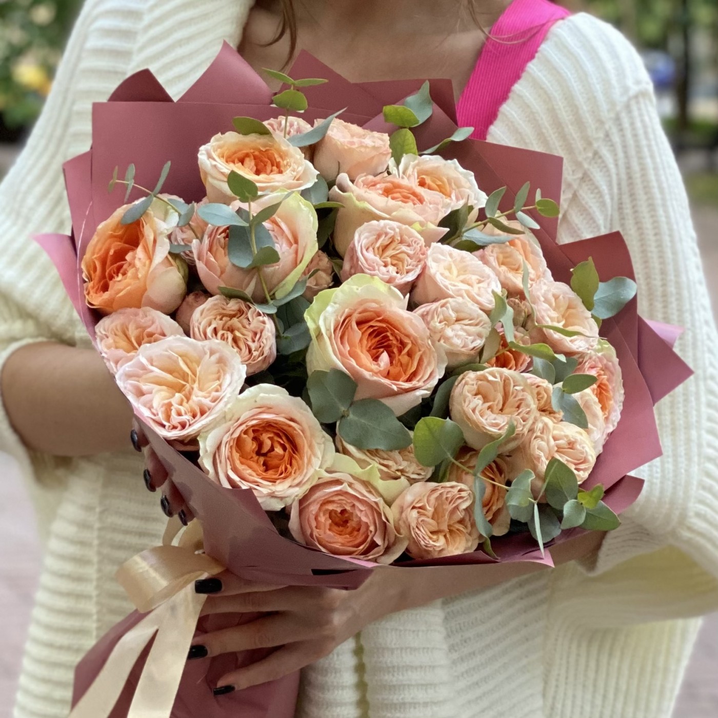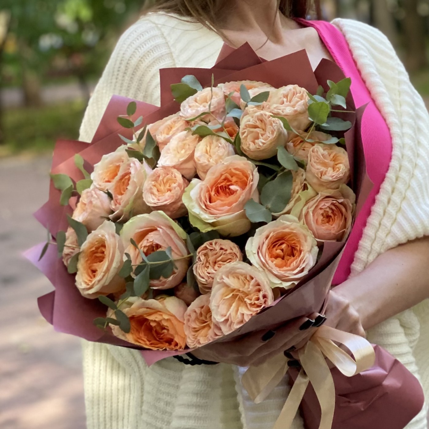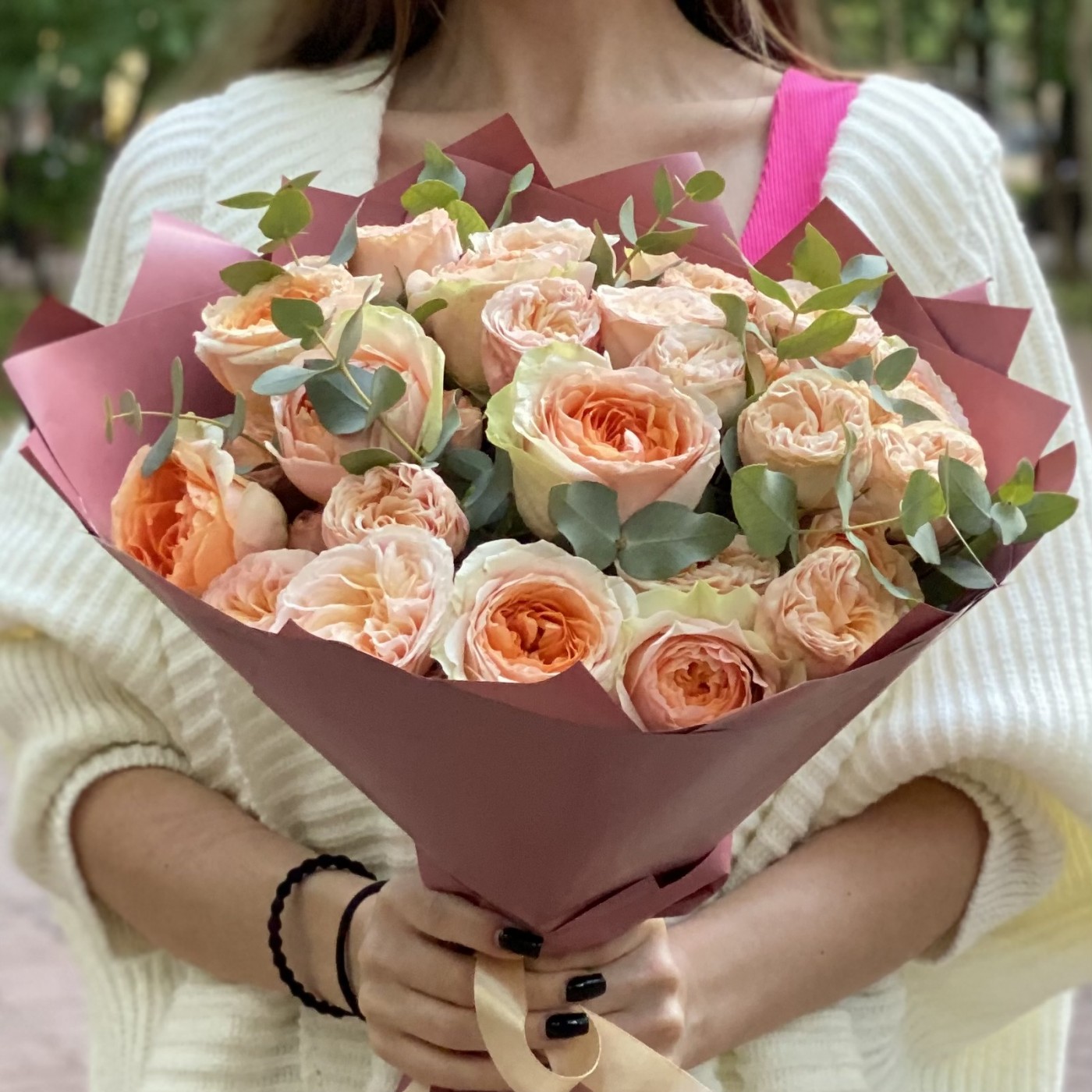 В этом букете идеально сочетаются между собой одноголовые пионовидные розы сорта Гравити и кустовые светло-персиковые пионовидные розы Джентл Трендсеттер. Пионовидные розочки с резными лепестками сливаются между собой в удивительное воздушное облако.