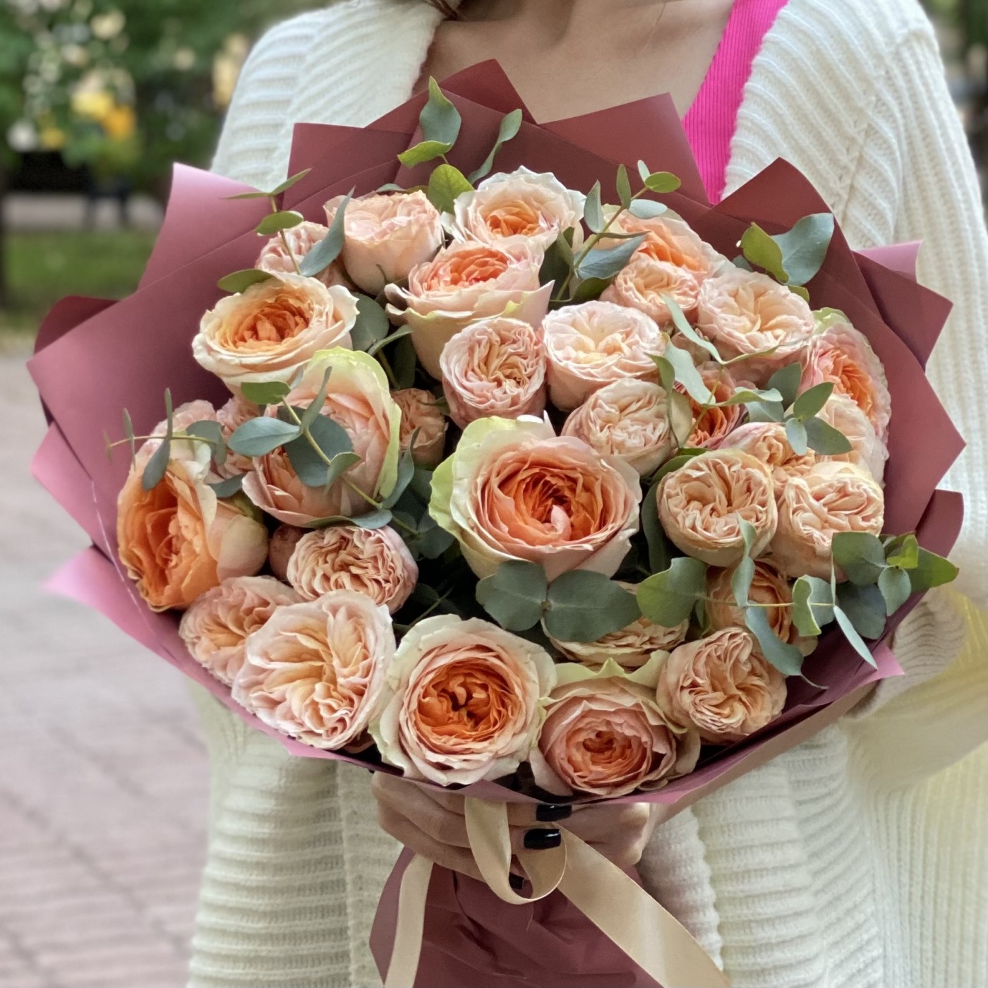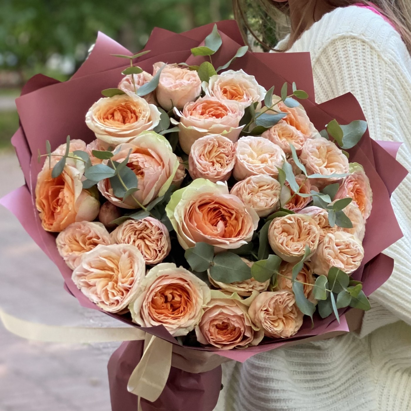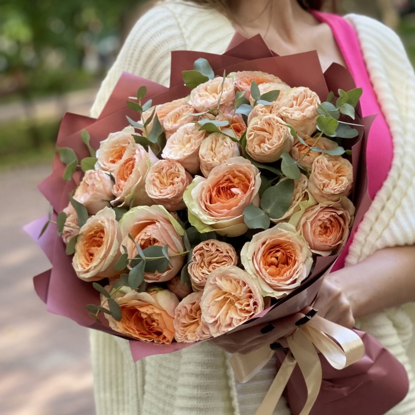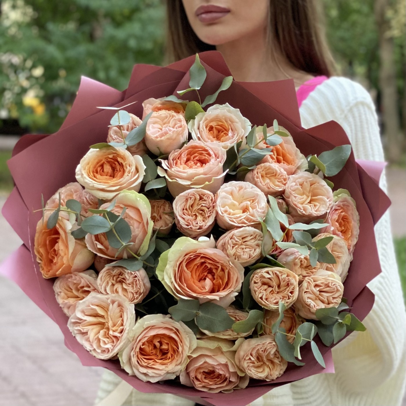 В этом букете идеально сочетаются между собой одноголовые пионовидные розы сорта Гравити и кустовые светло-персиковые пионовидные розы Джентл Трендсеттер. Пионовидные розочки с резными лепестками сливаются между собой в удивительное воздушное облако.