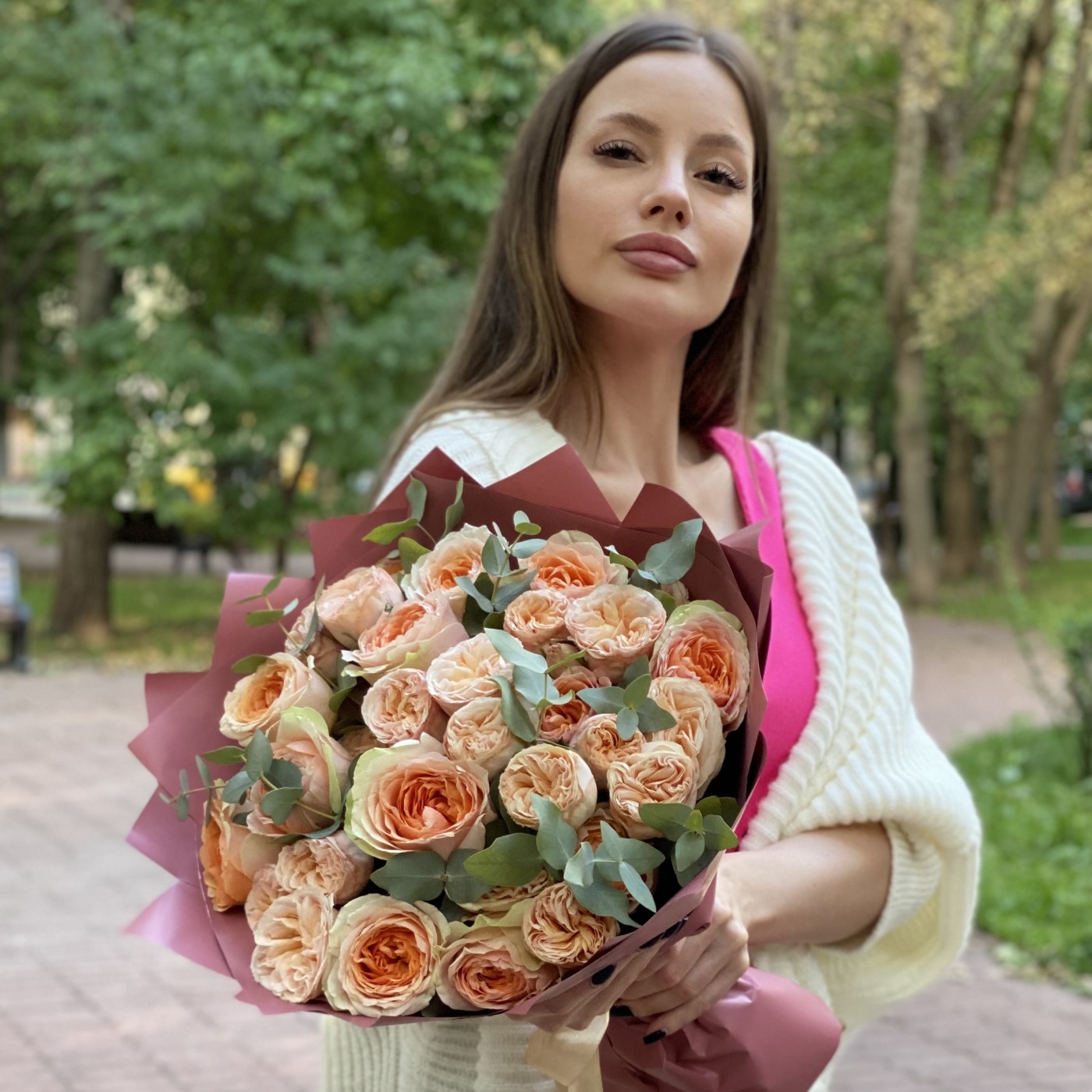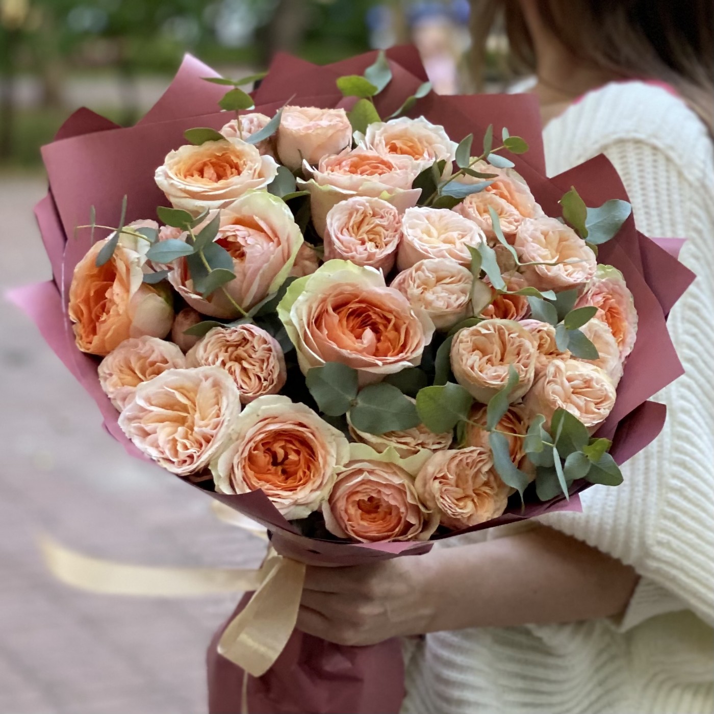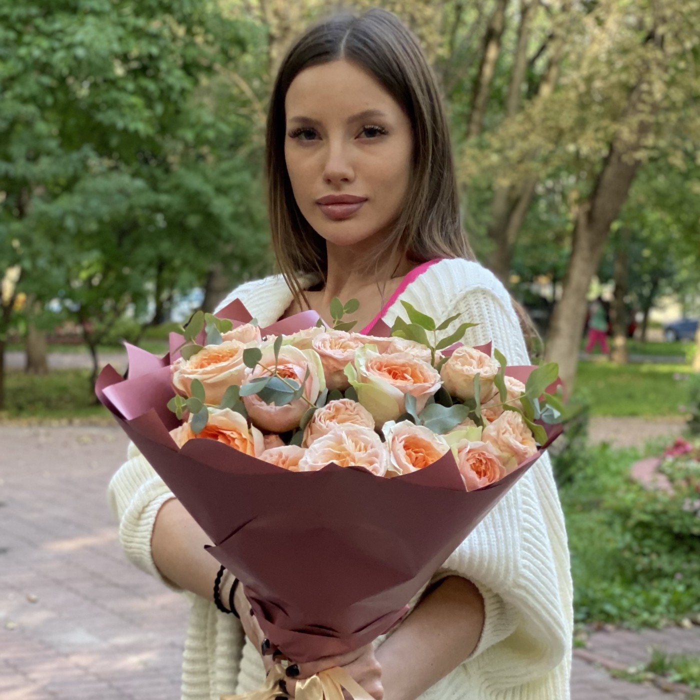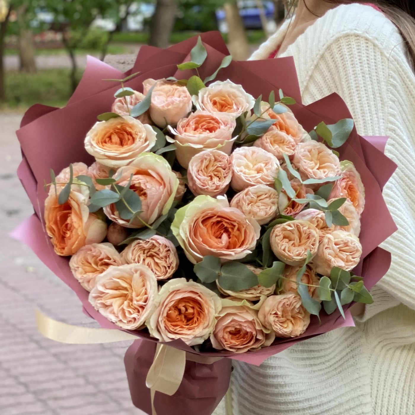 В этом букете идеально сочетаются между собой одноголовые пионовидные розы сорта Гравити и кустовые светло-персиковые пионовидные розы Джентл Трендсеттер. Пионовидные розочки с резными лепестками сливаются между собой в удивительное воздушное облако.