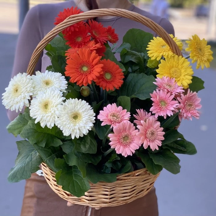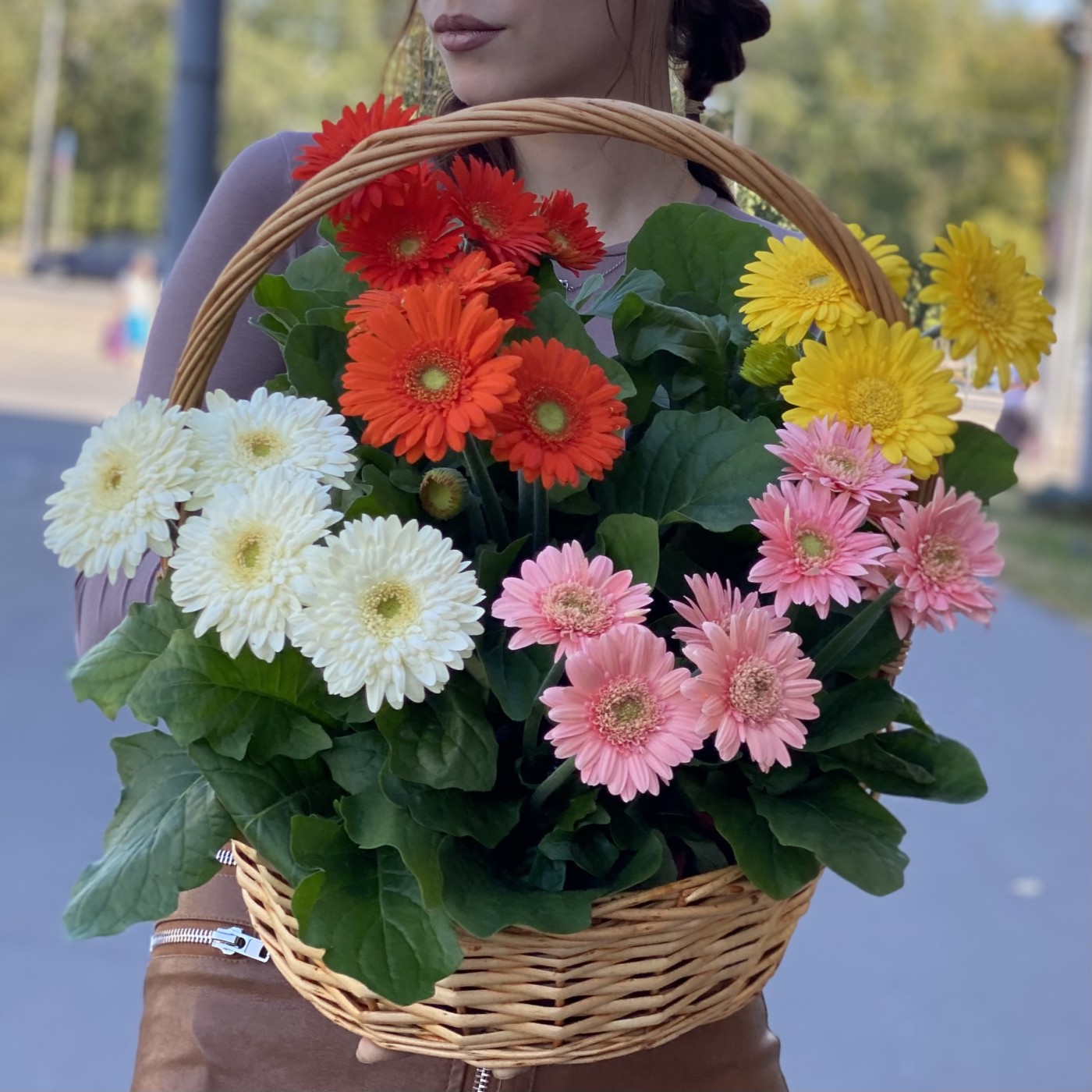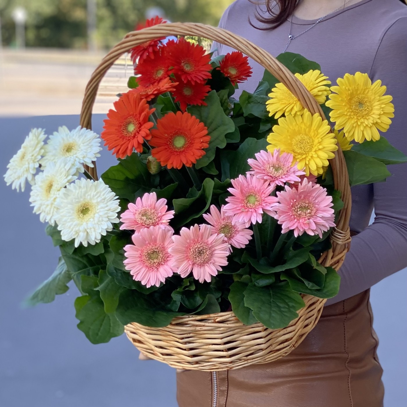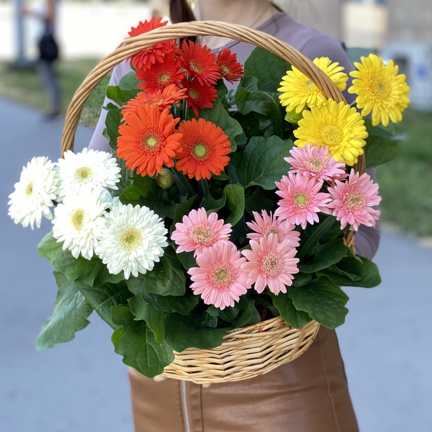 Веселый и яркий букет из мини-гербер в подарочной корзине создаст веселую атмосферу праздника и любви. Гермини - это прекрасные, жизнерадостные, солнечные цветы из семейства астровых. Они очень стойкие, долго радуют цветением и станут великолепным подарком к празднику!