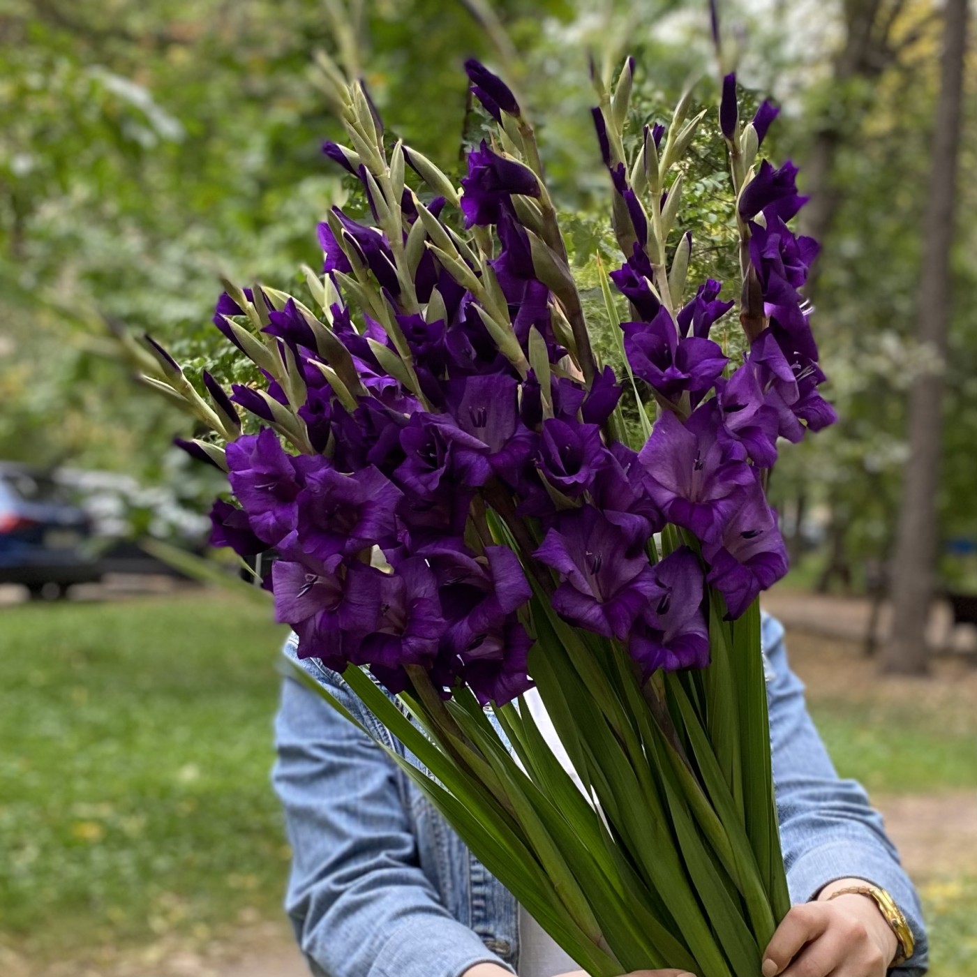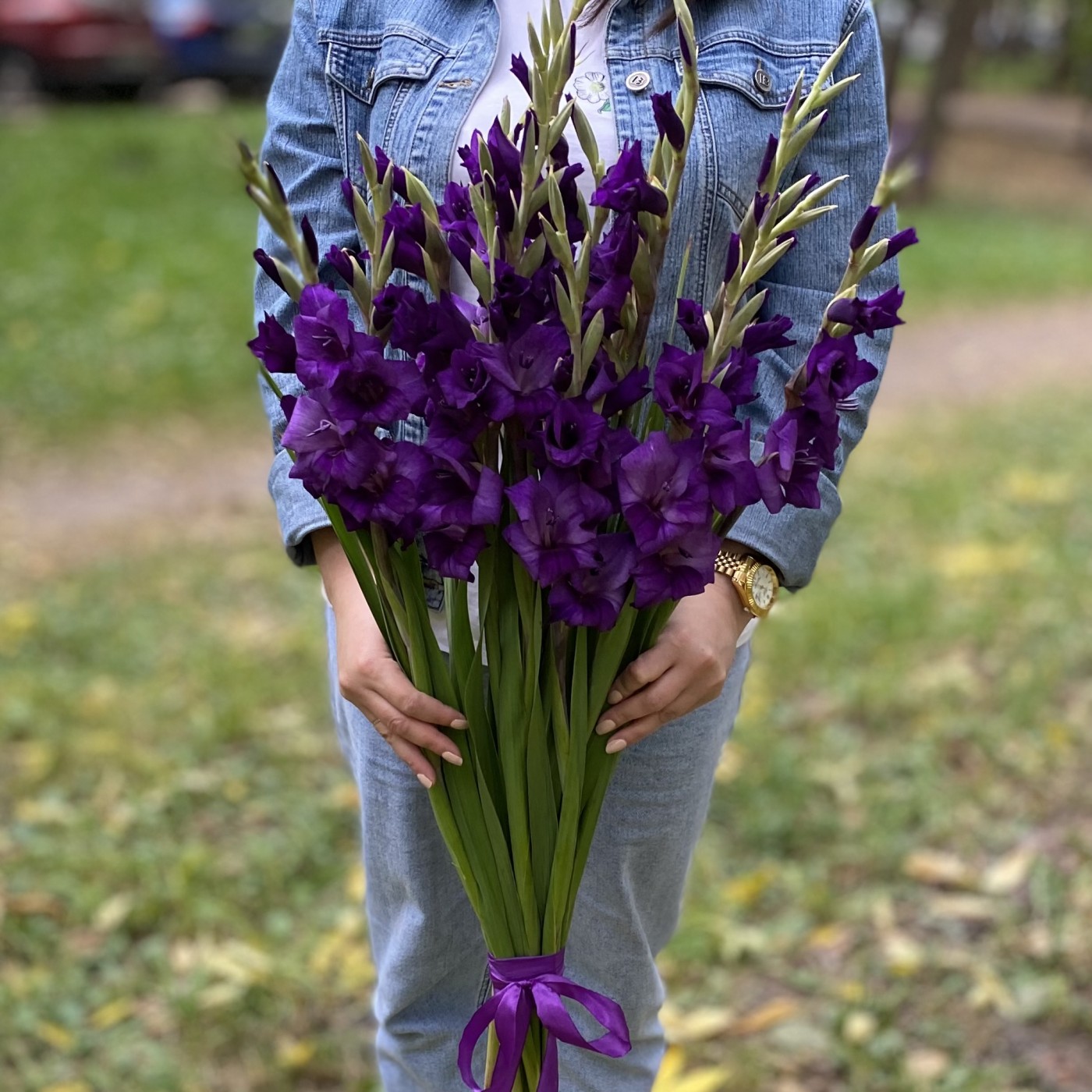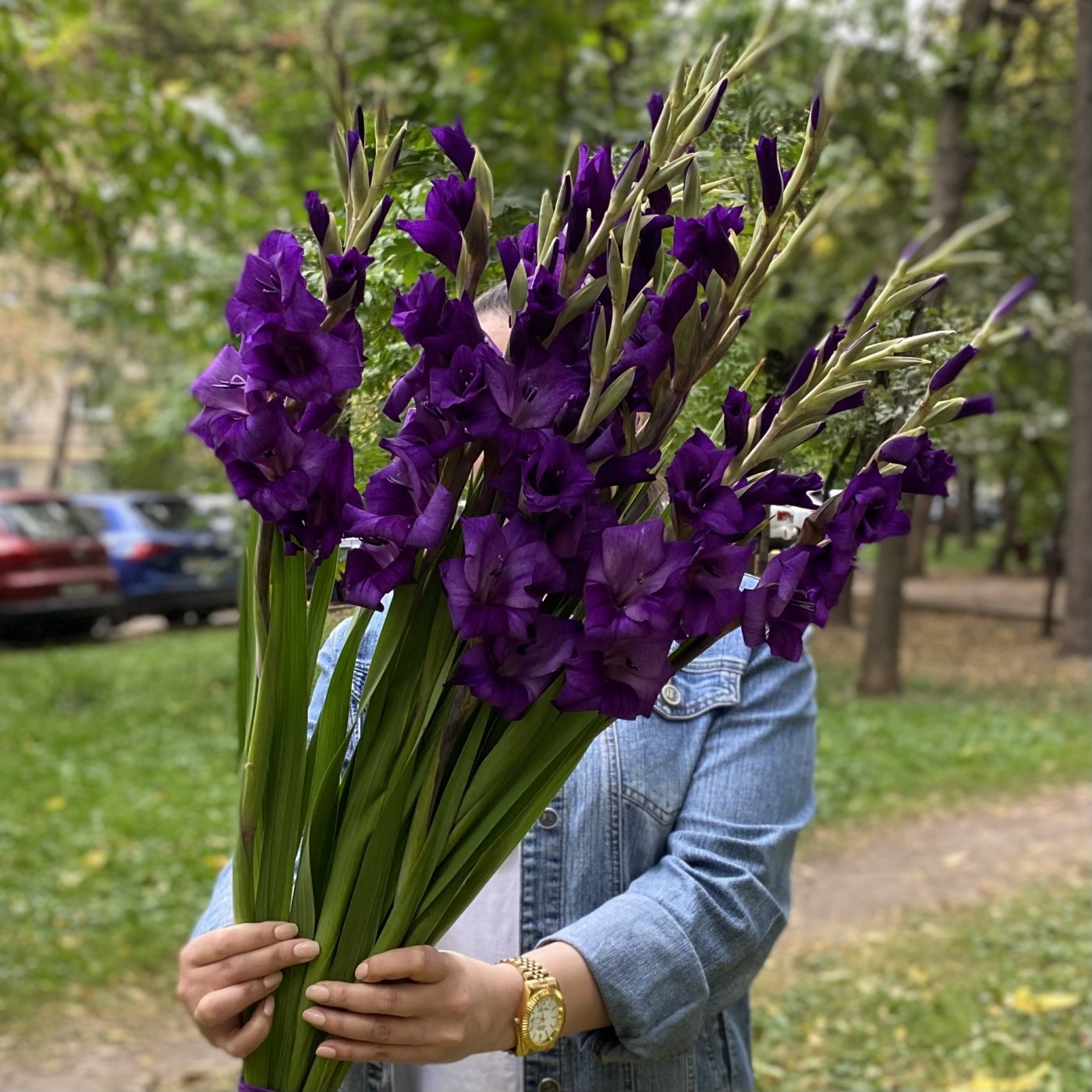 На фото букет из 11 штук темно-фиолетовых гладиолусов.