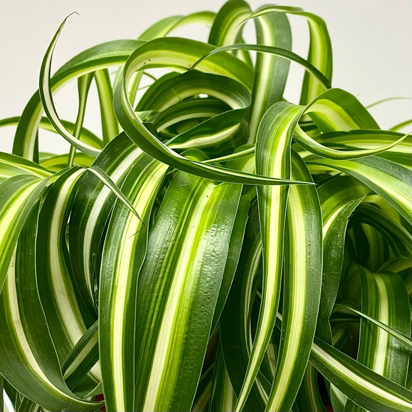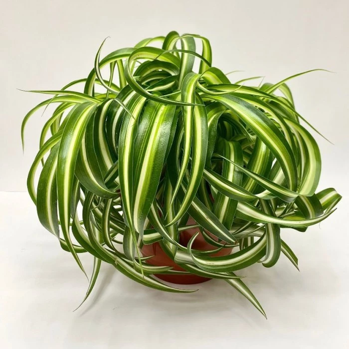 Популярный комнатный цветок хлорофитум кудрявый прекрасно вписывается в любой интерьер. Его компактная крона представлена закручивающимися вокруг горшка узкими листовыми пластинами с широкой белой полосой по центру.