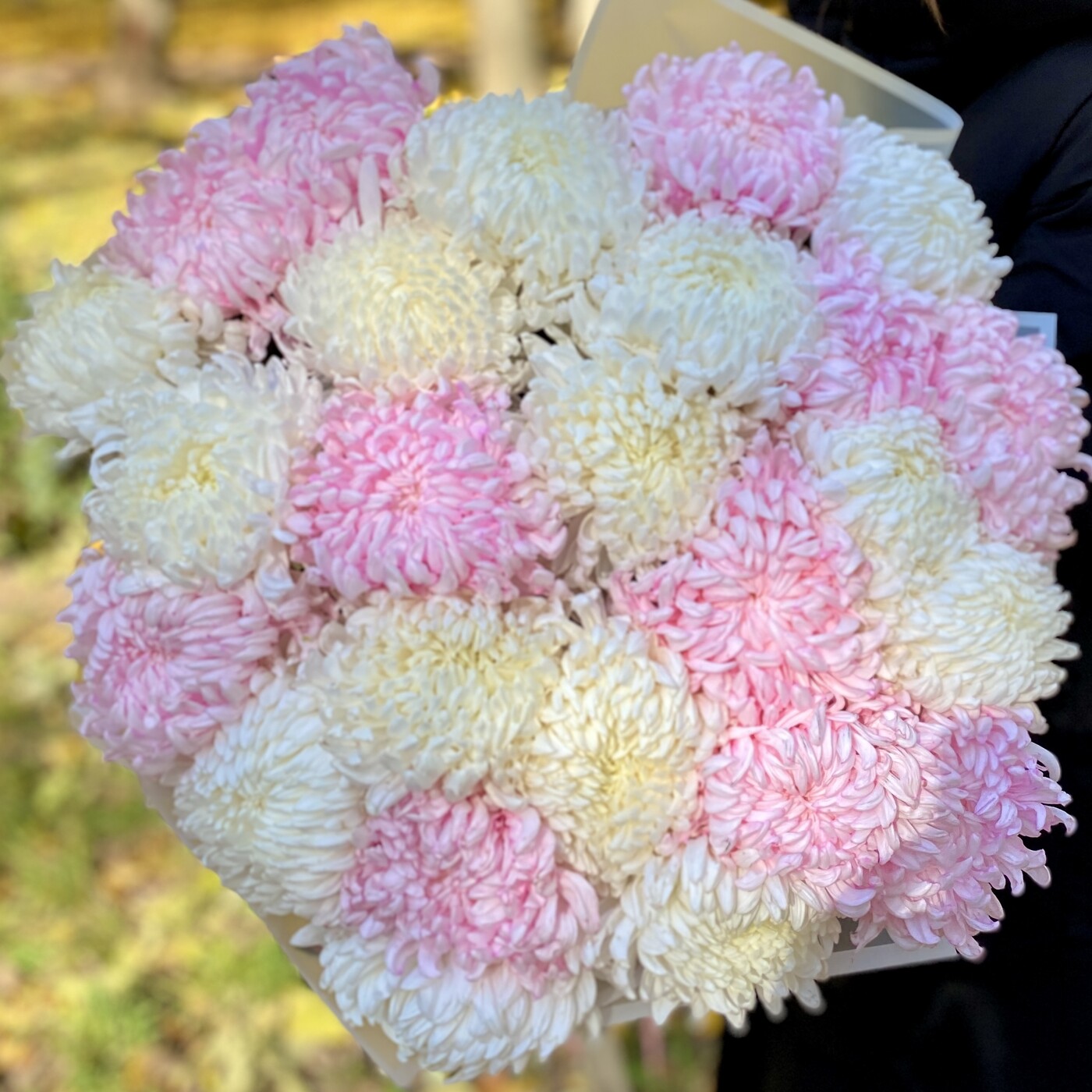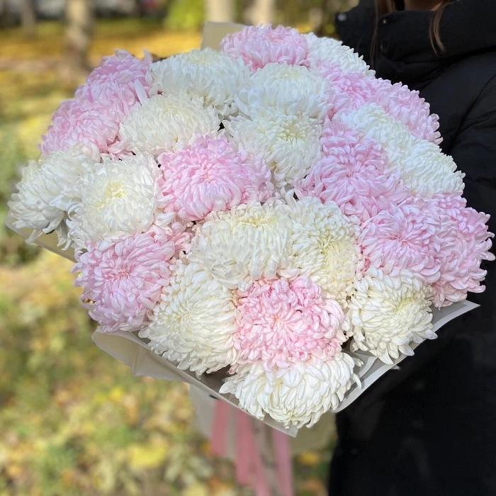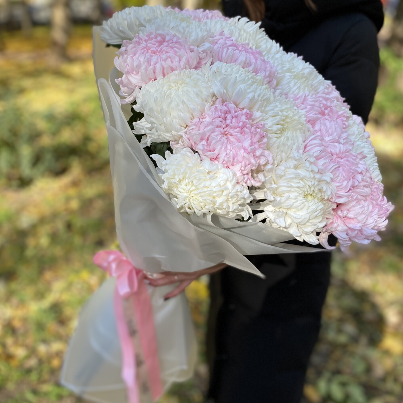 Букет из розовых и белых крымских хризантем в упаковке. Прекрасный подарок ко дню рождению. Хризантема имеет тонкий и вкусный аромат.