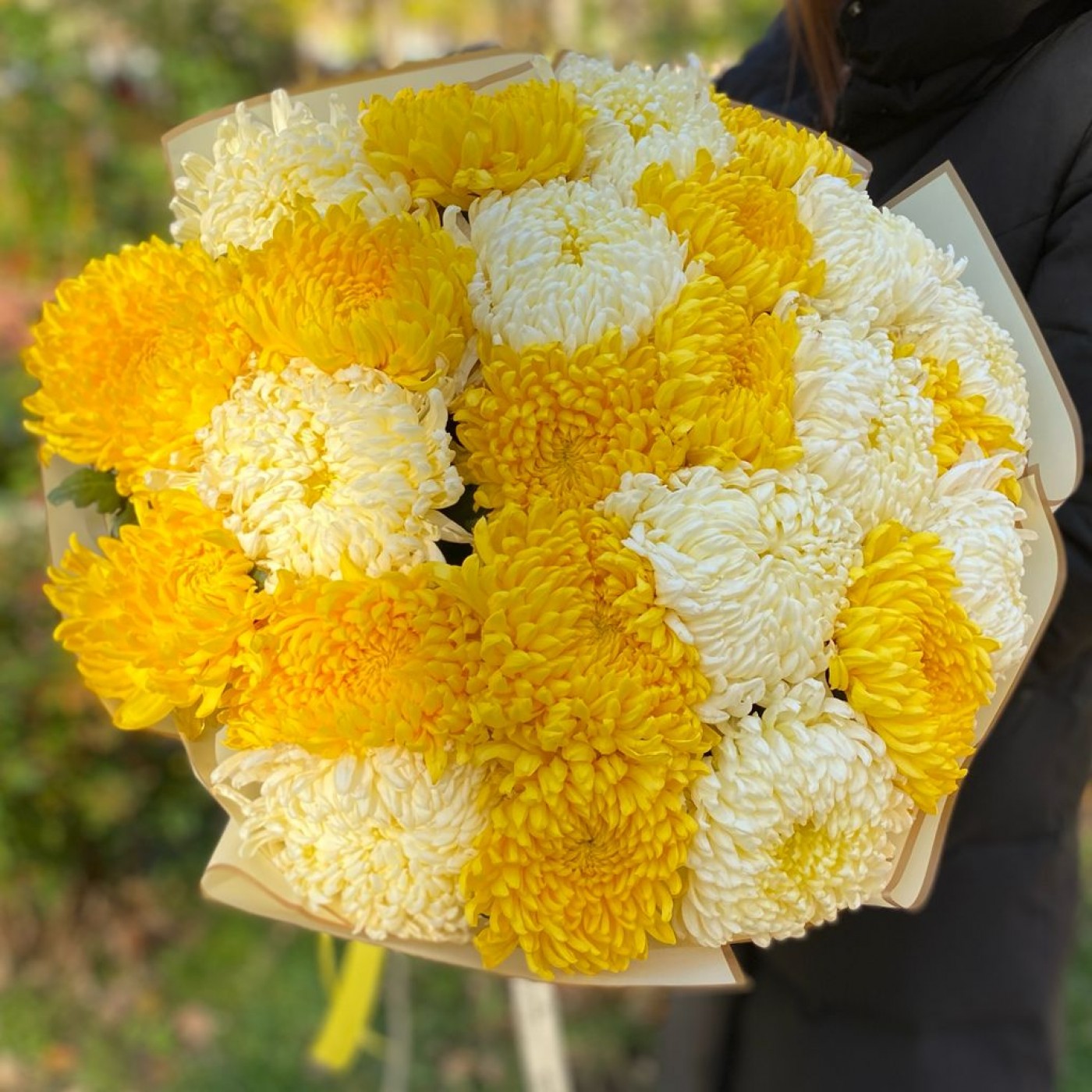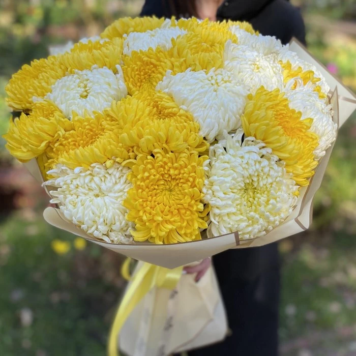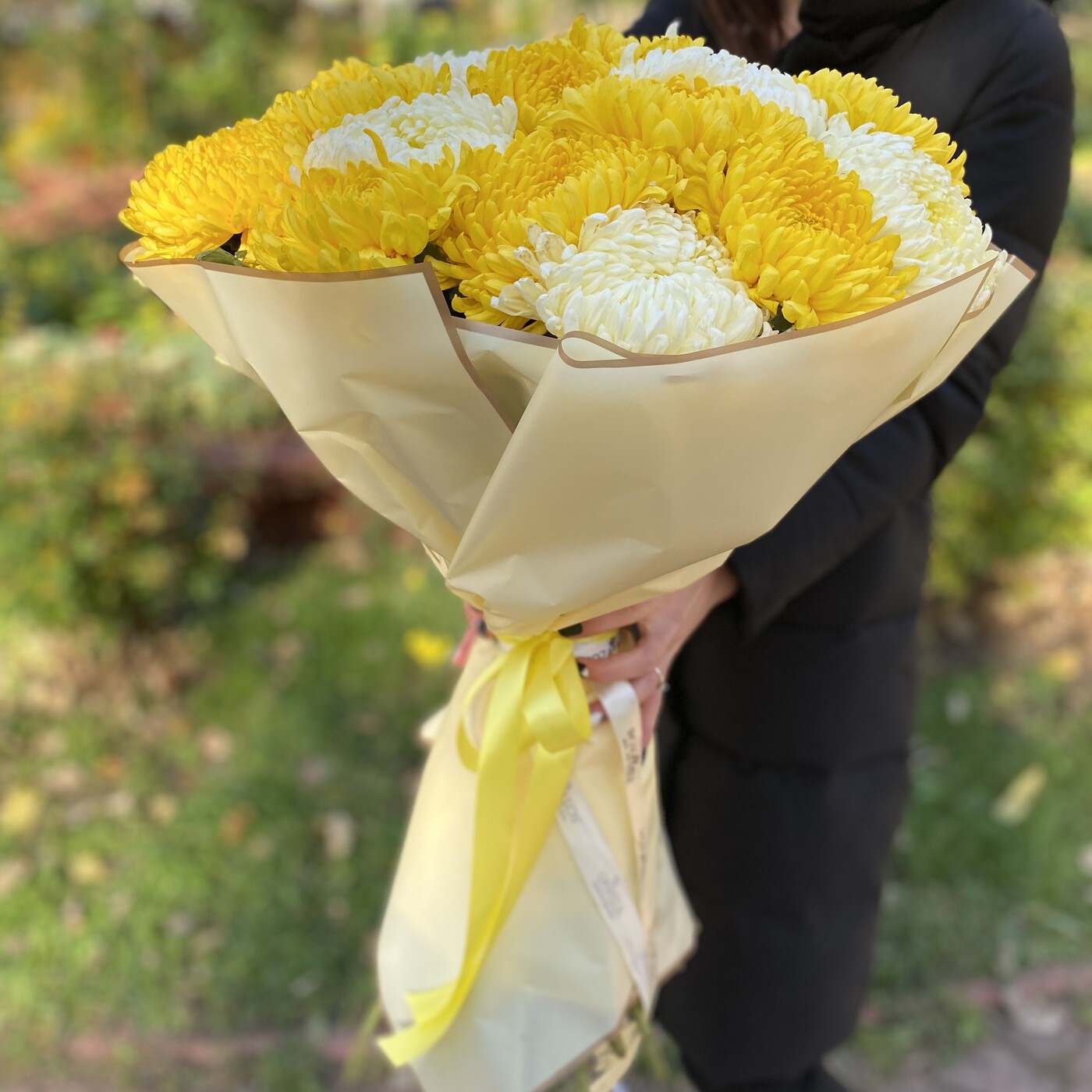 Букет из желтых и белых крымских хризантем в упаковке. Прекрасный подарок ко дню рождению. Хризантема имеет тонкий и вкусный аромат.