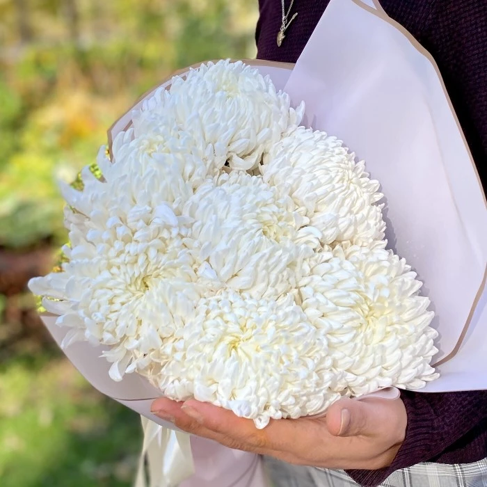 Крупноцветковая махровая крымская хризантема белого цвета, станет прекрасным презентом к праздничному дню.