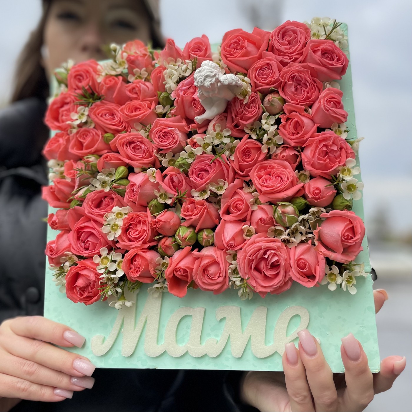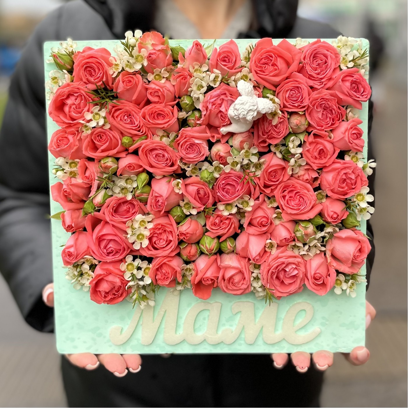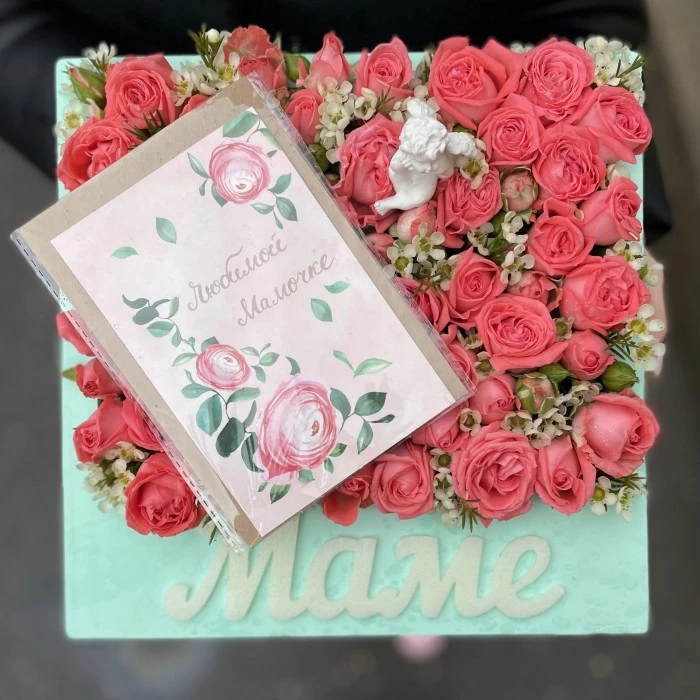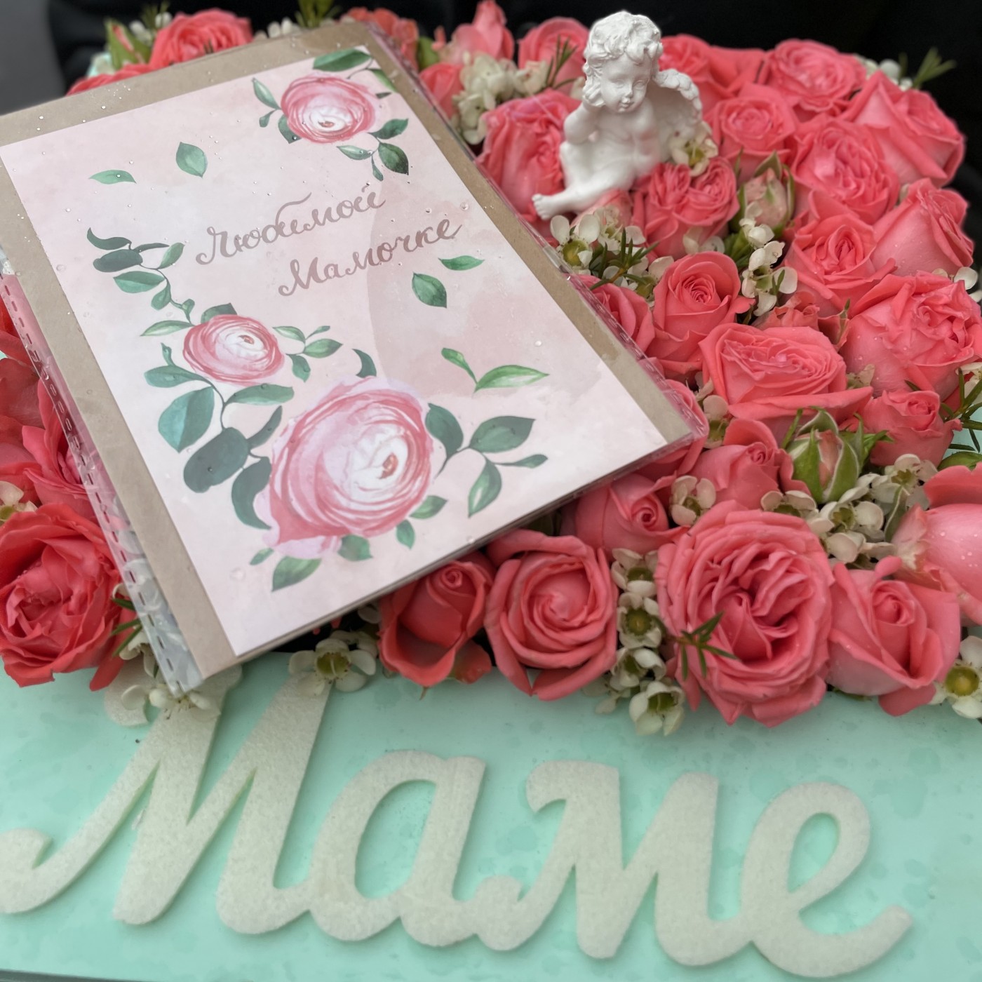 Композиция Маме из пионовидных роз с ангелом