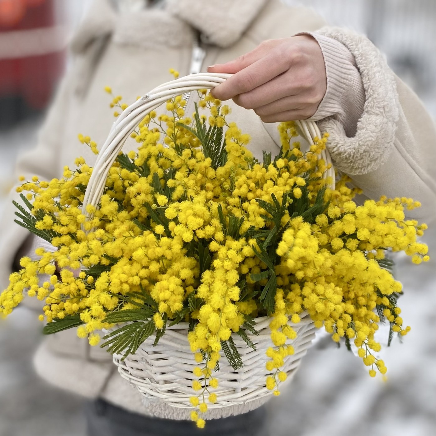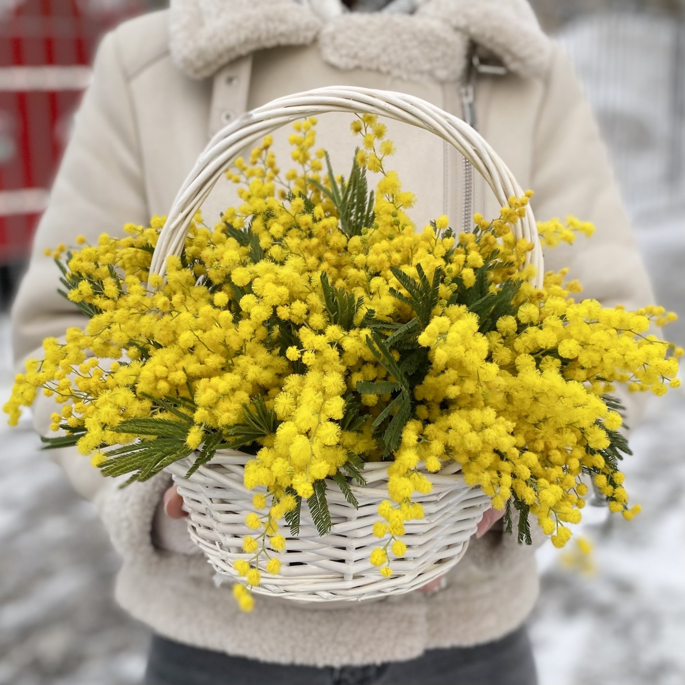 Солнечная и весенняя композиция из мимозы в корзине. Подарите своим дамам немного тепла и хорошего весеннего настроения.