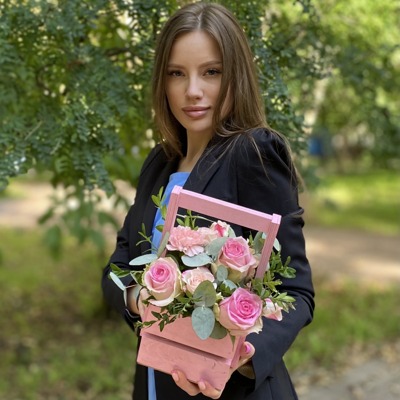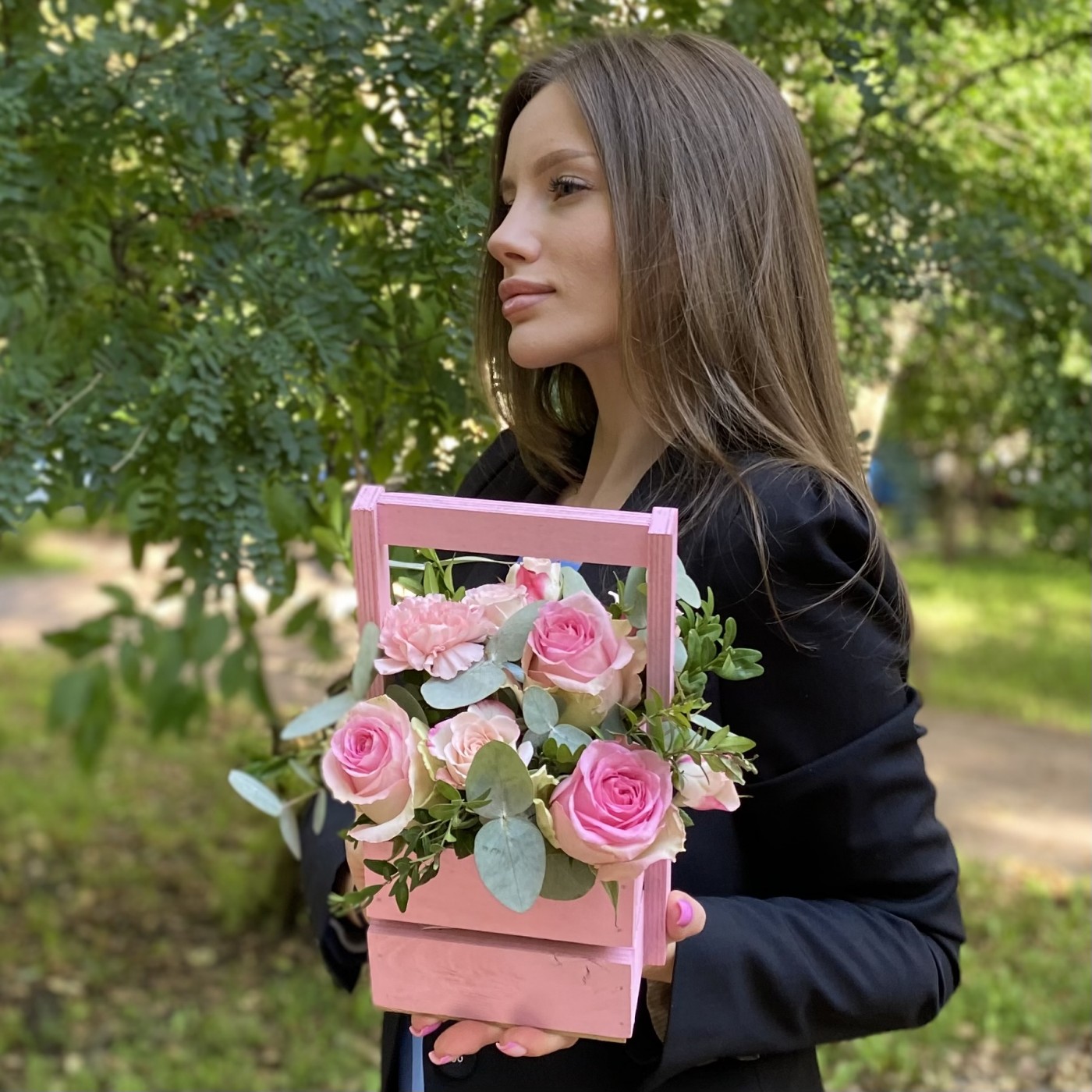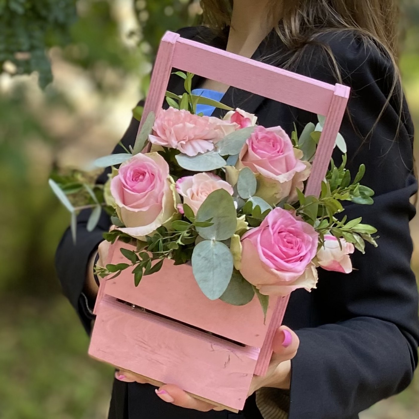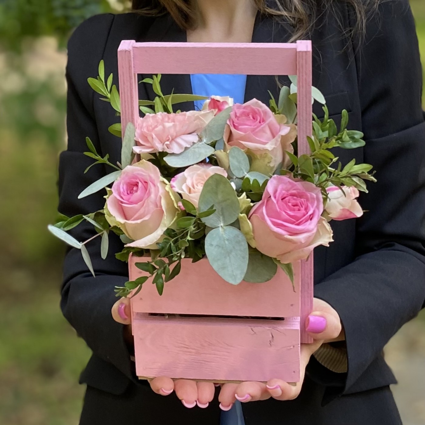 Композиция из одноголовой пионовидной розы сорта Бриджит Бардо и кустовой розы Рефлекс. Композиция размещена в деревянном ящичке. Это отличный подарок коллеге или подруге в день рождения. Доставляем букеты и композиции по Москве и Подмосковью круглосуточно!