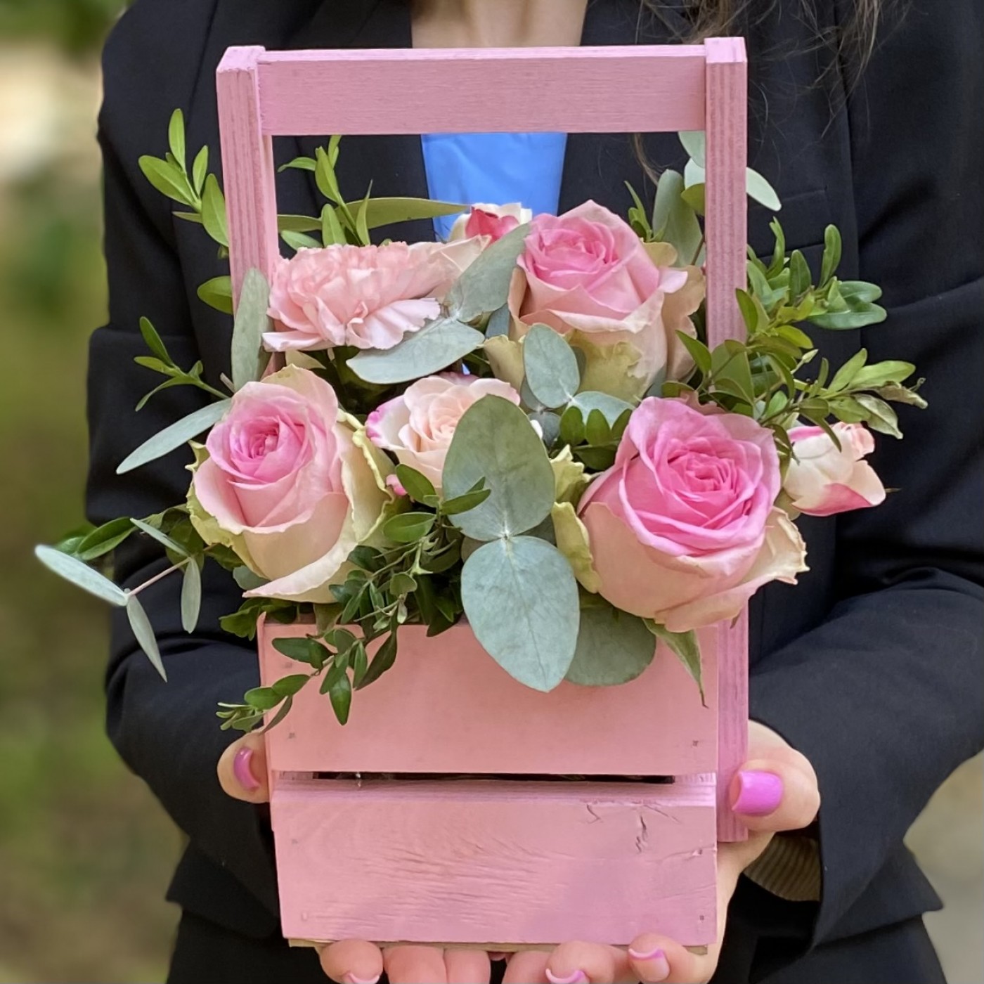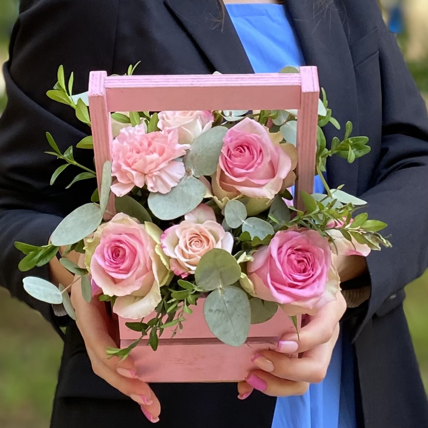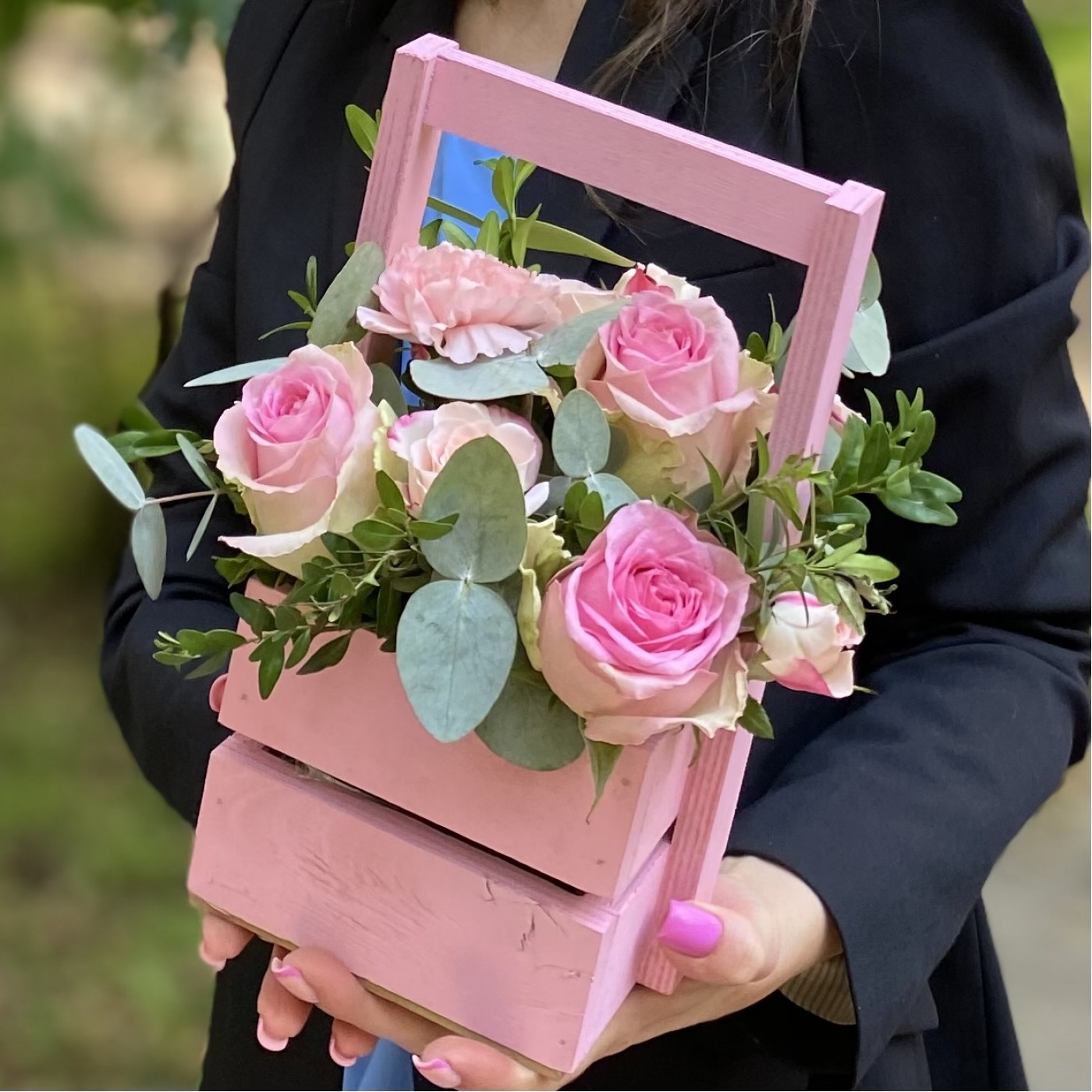 Композиция из одноголовой пионовидной розы сорта Бриджит Бардо и кустовой розы Рефлекс. Композиция размещена в деревянном ящичке. Это отличный подарок коллеге или подруге в день рождения. Доставляем букеты и композиции по Москве и Подмосковью круглосуточно!