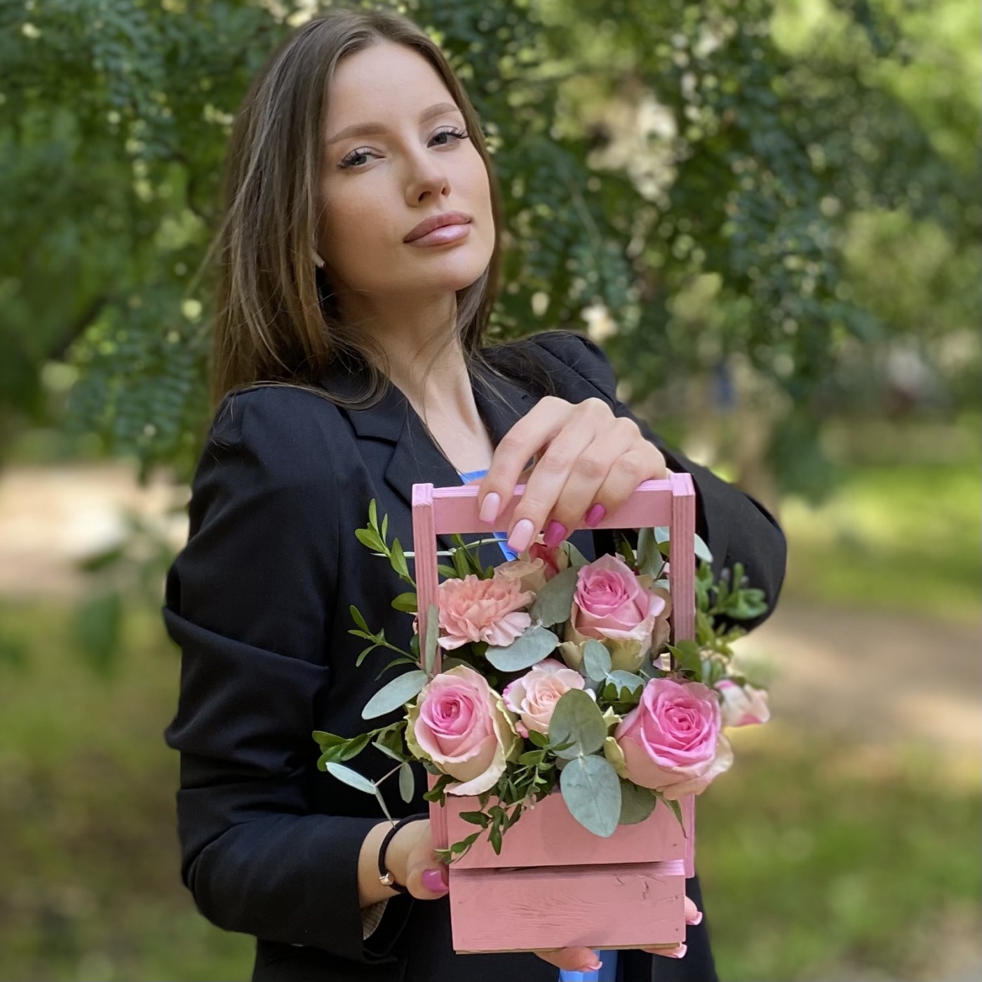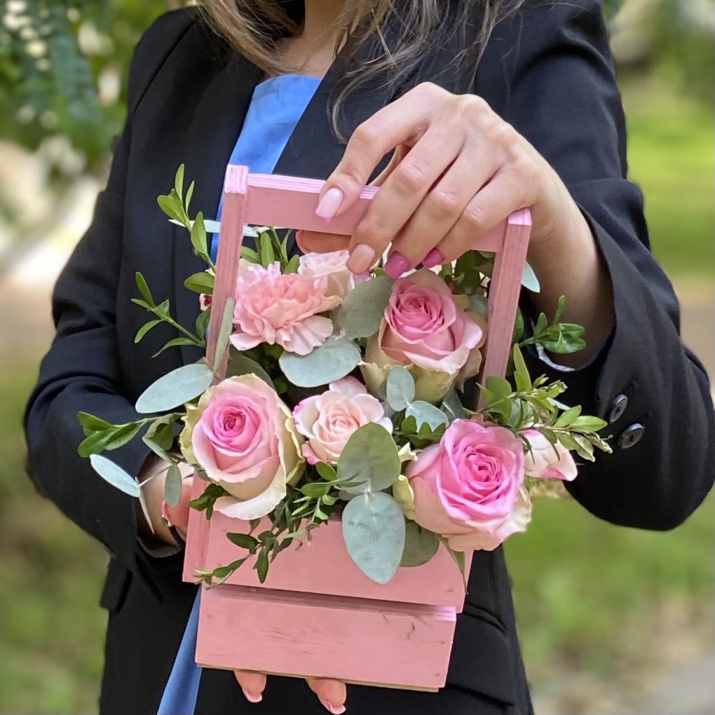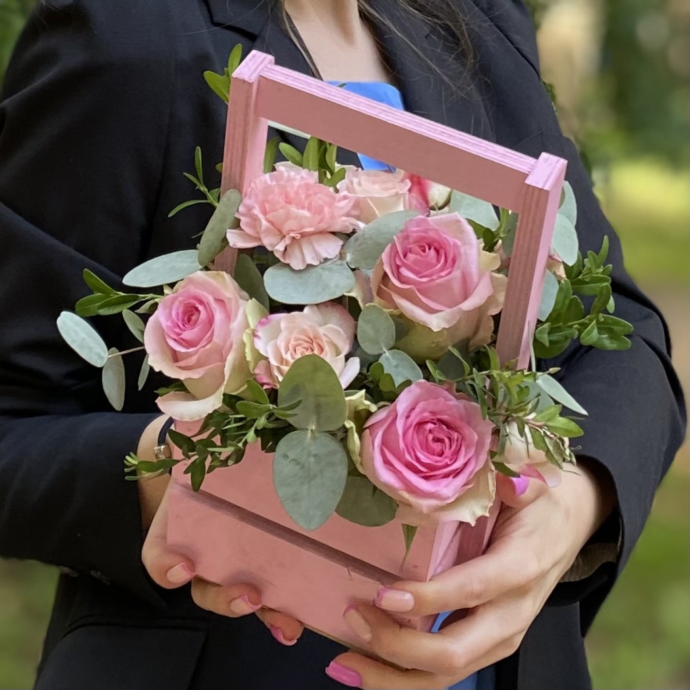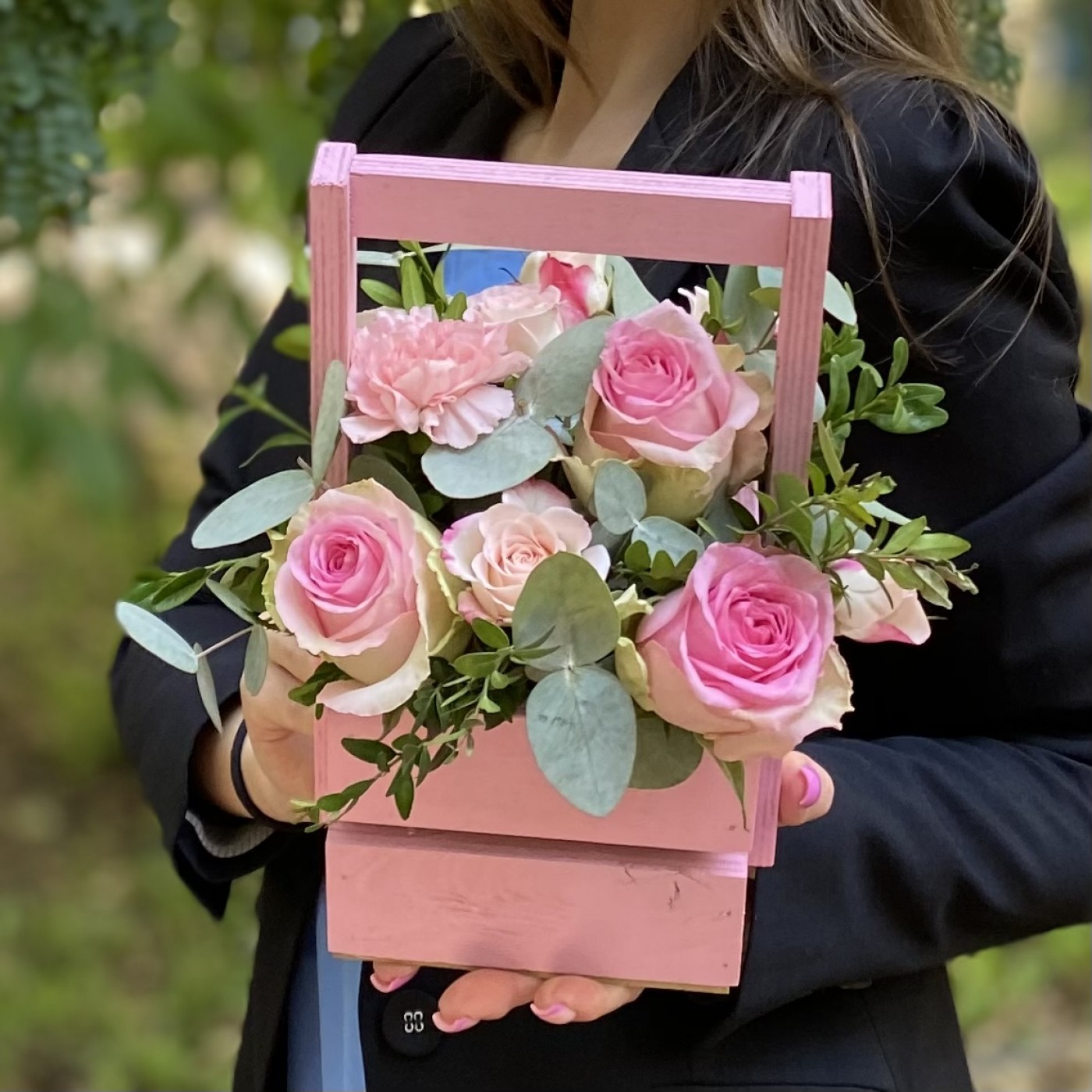 Композиция из одноголовой пионовидной розы сорта Бриджит Бардо и кустовой розы Рефлекс. Композиция размещена в деревянном ящичке. Это отличный подарок коллеге или подруге в день рождения. Доставляем букеты и композиции по Москве и Подмосковью круглосуточно!