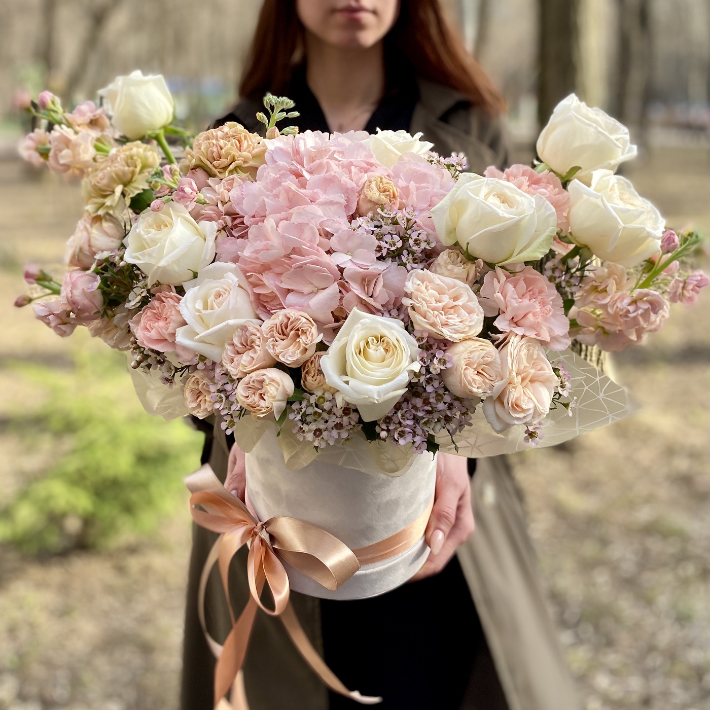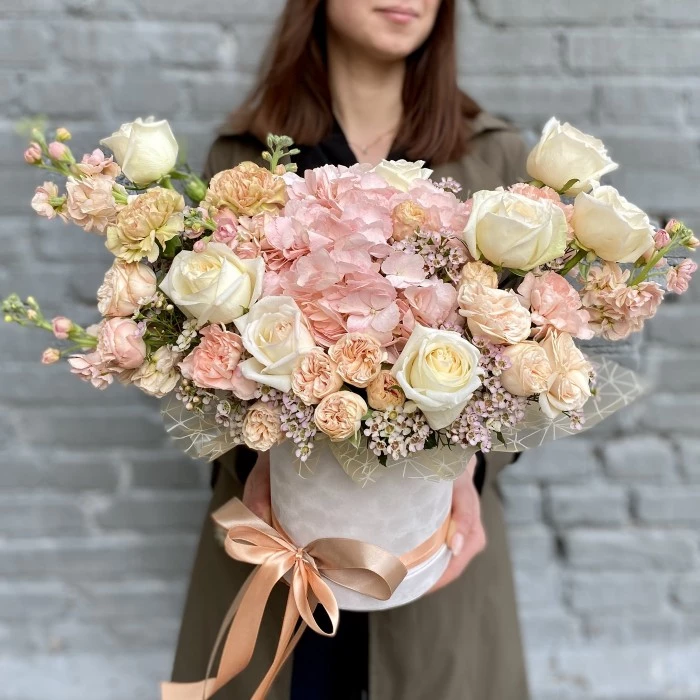 Нежная и ароматная композиция в коробке в пастельной цветовой гамме, поднимет настроение и оставит приятные воспоминания.