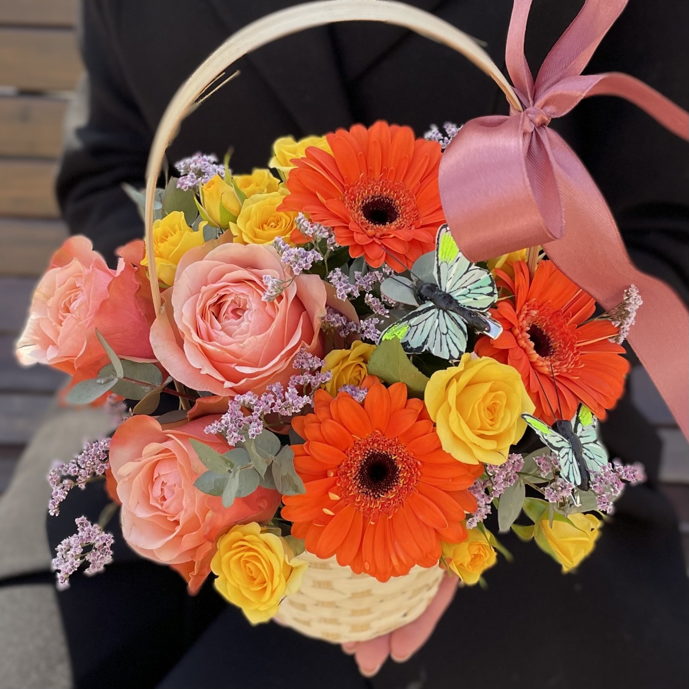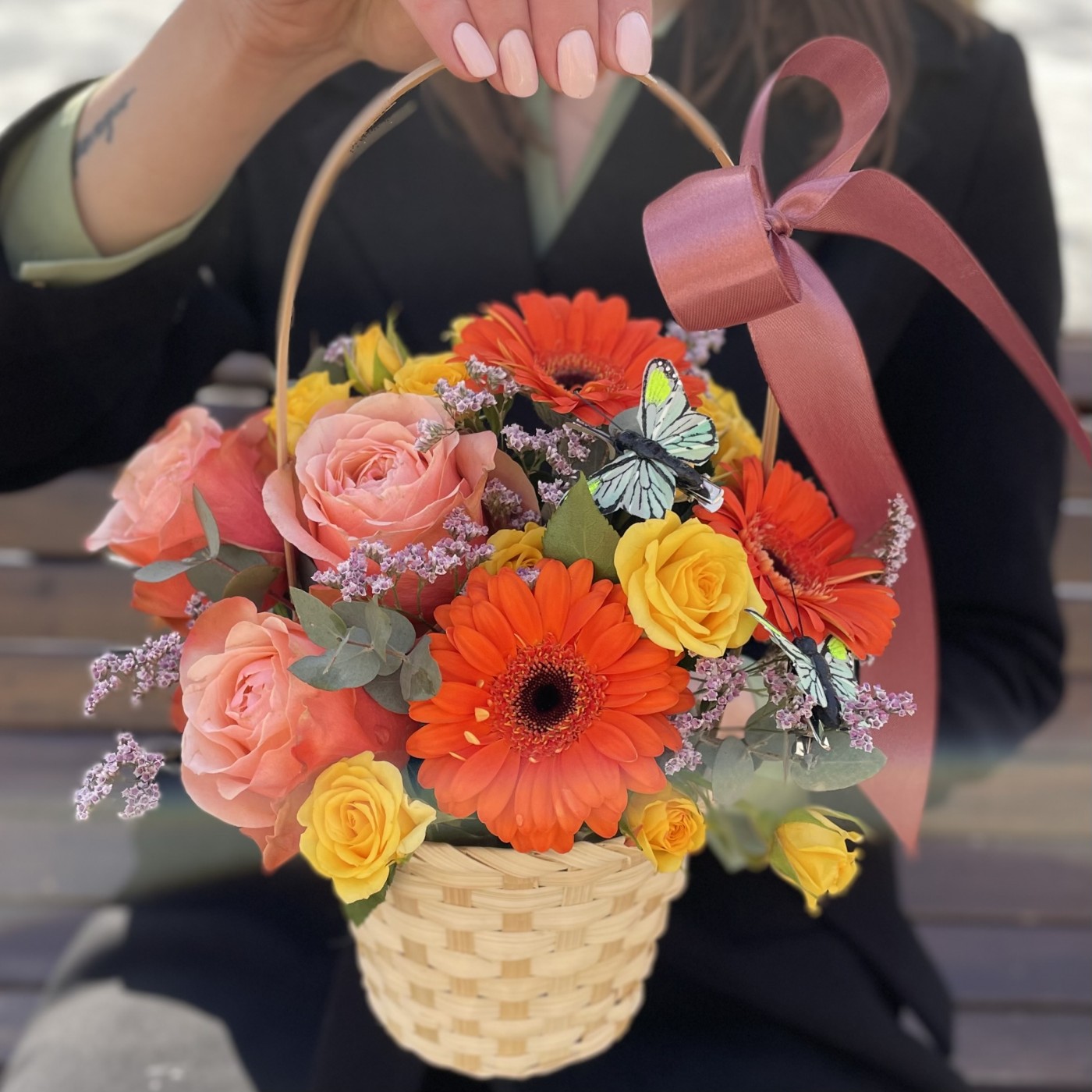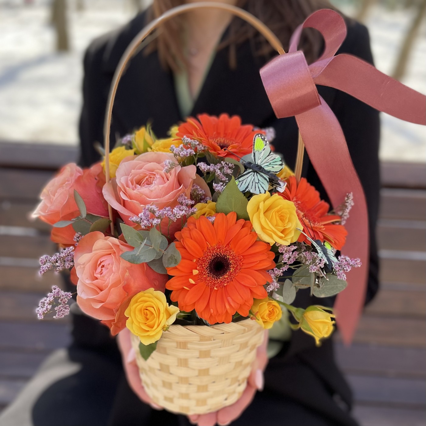 Радостная корзина с цветами на любое мероприятие. Так же вы можете преподнести эту композицию в виде комплимента. Порадуйте получателя прекрасной корзиночкой и поднимите настроение на долгое время.