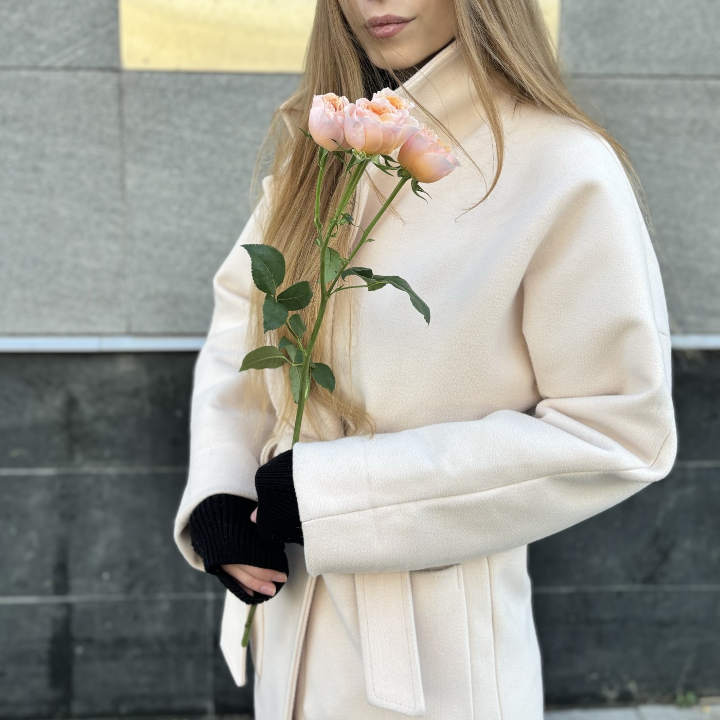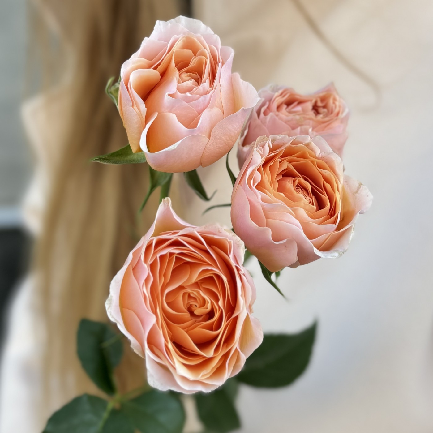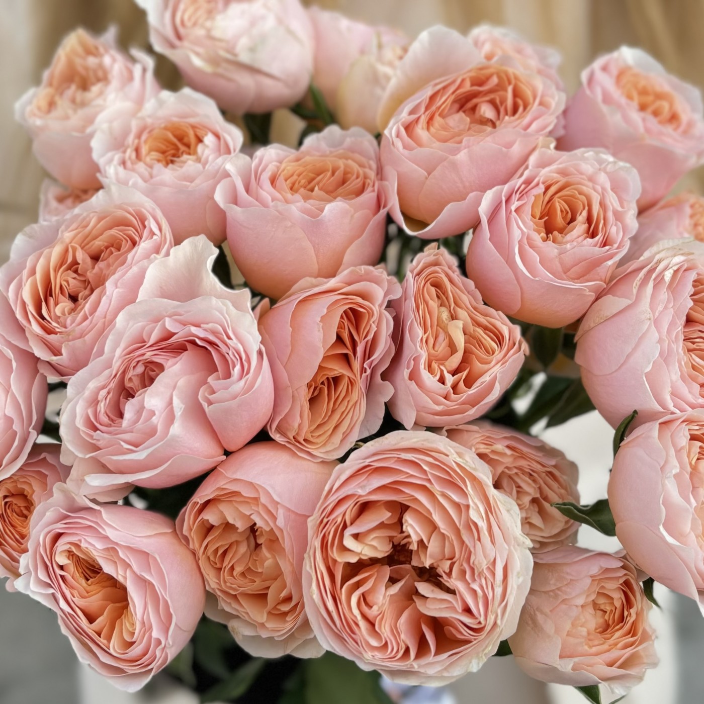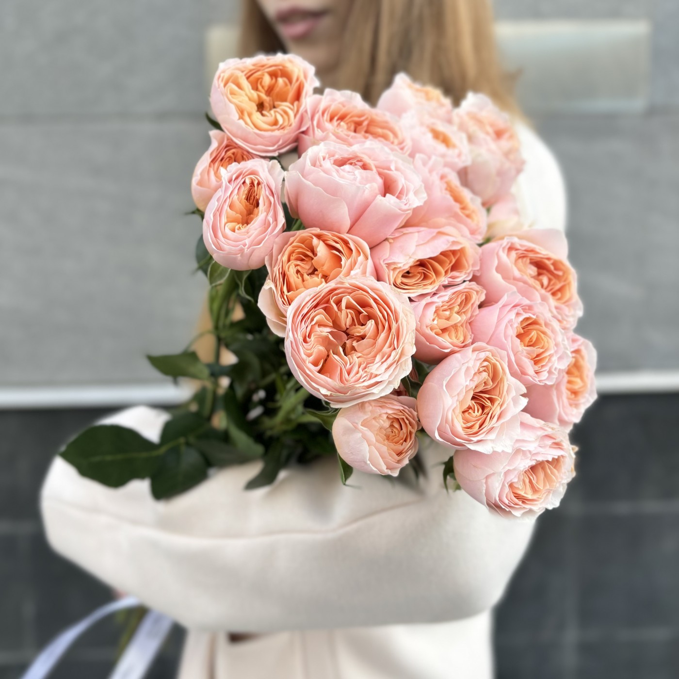 На фото представлен букет из 9 веток кустовых пионовидных роз сорта Кейджерс коралл