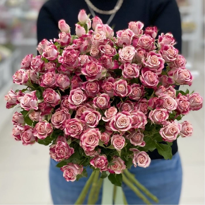 Великолепная кустовая роза Флиндерс Лейн нежно-розового оттенка с яркими красными штрихами на цветочной головке может стать прекрасным подарком к любому празднику! Букет на фотографии состоит из пятнадцати потрясающих ветвей кустовой розы высочайшего качества. Такой презент точно произведёт впечатление, поскольку нежные, бархатистые лепестки в бело-розовом оттенке поразительно отображают красоту природы, от которой захватывает дух.