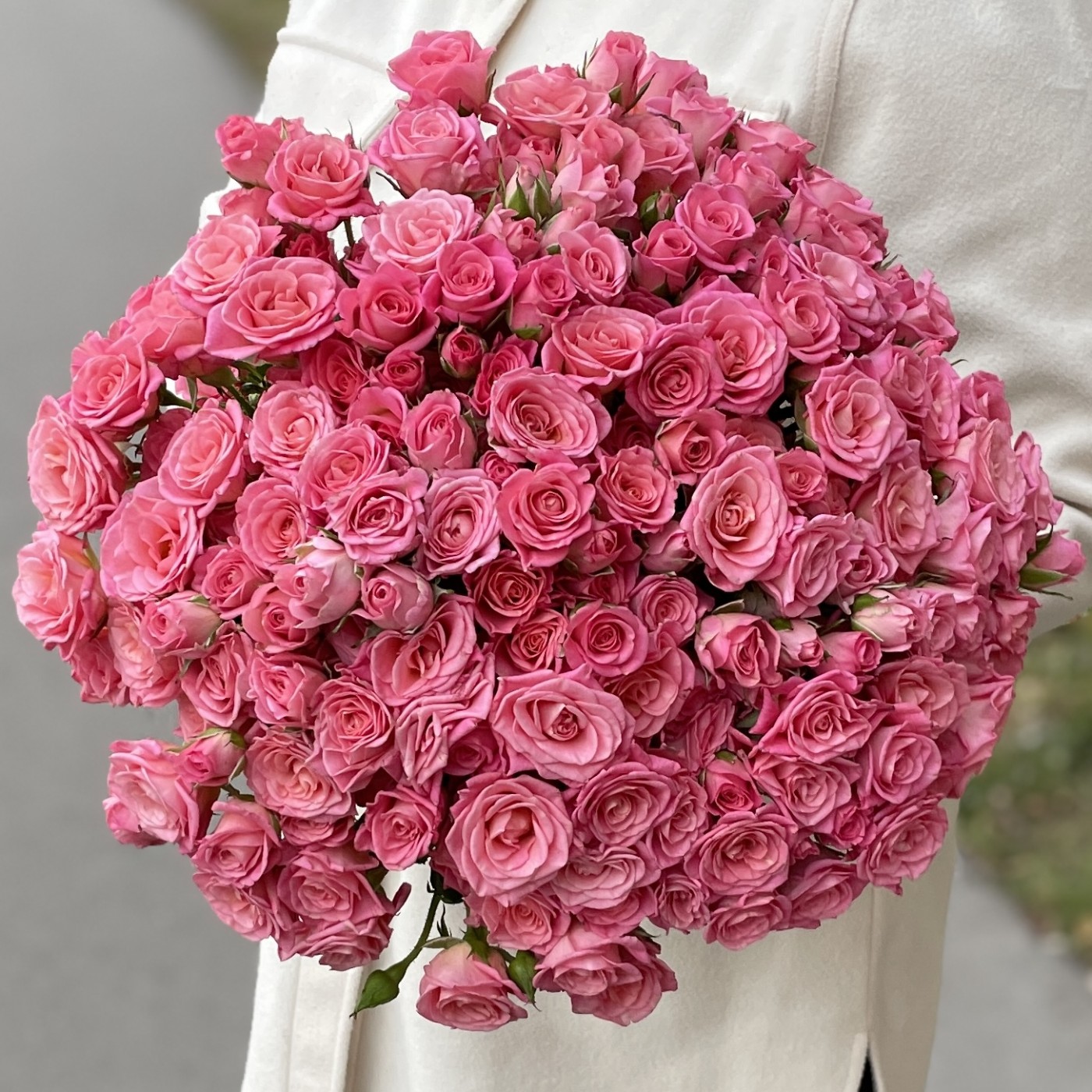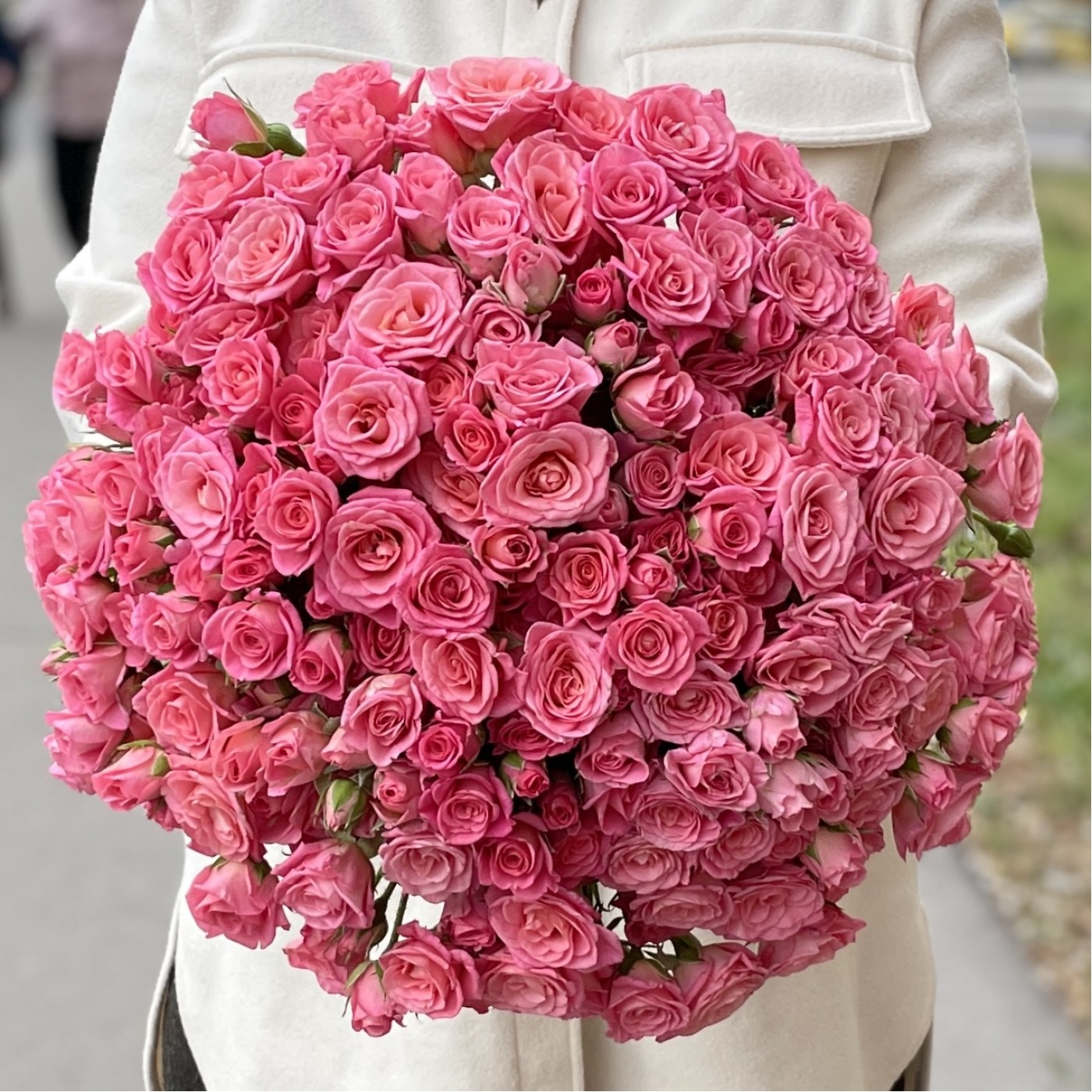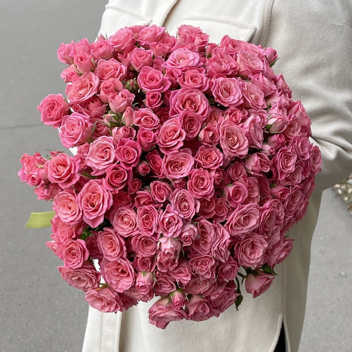 Кустовые розы насыщенного розового оттенка. На фото представлен букет из 21 ветки.